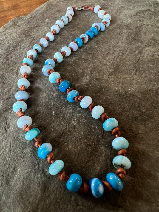 Denim Blue Opal Knotted on Leather Unisex Necklace 17”