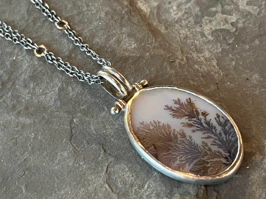 One of a Kind Dendritic Agate Hinged Sterling Silver Necklace with 14k Rose Gold Accents