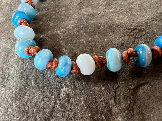 Denim Blue Opal Knotted on Leather Unisex Bracelet 8.5”