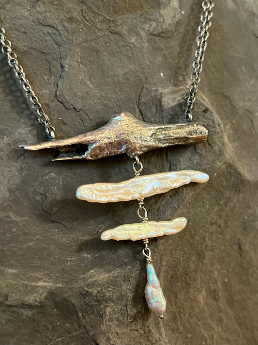 Oxidized Sterling Silver Driftwood & Iridescent Pearl Necklace - Cayuga Collection