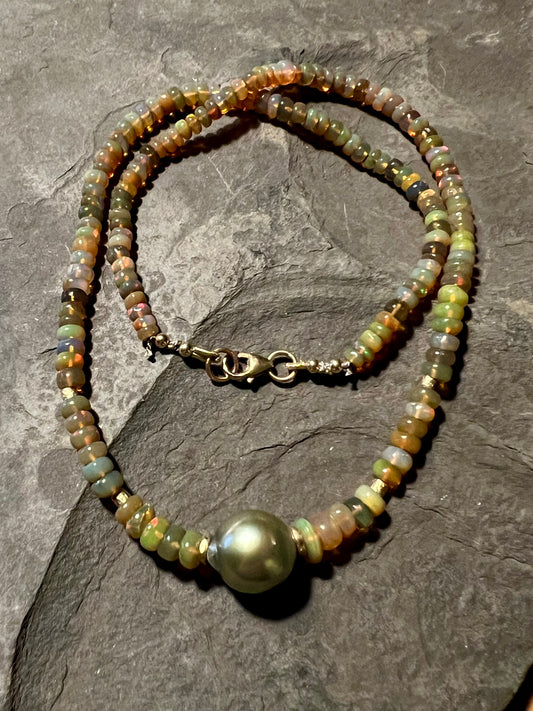 Opal and Tahitian Pearl 14K Choker - One of a Kind Necklace