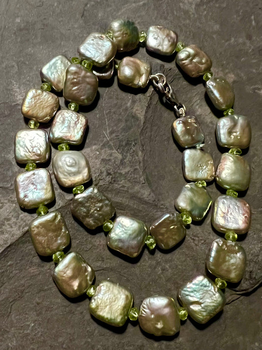 Metallic Pillow Pearl with Peridot Strand - One of a Kind Necklace