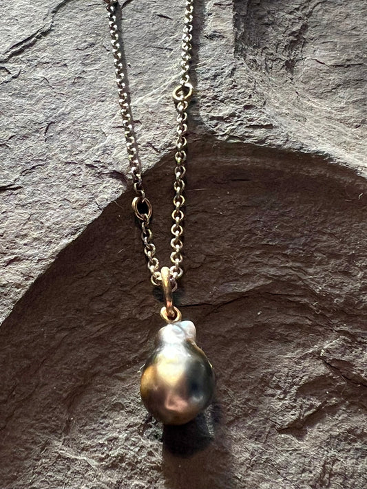Peacock Tahitian Pearl Drop - Sterling & 14K Minimalist Necklace