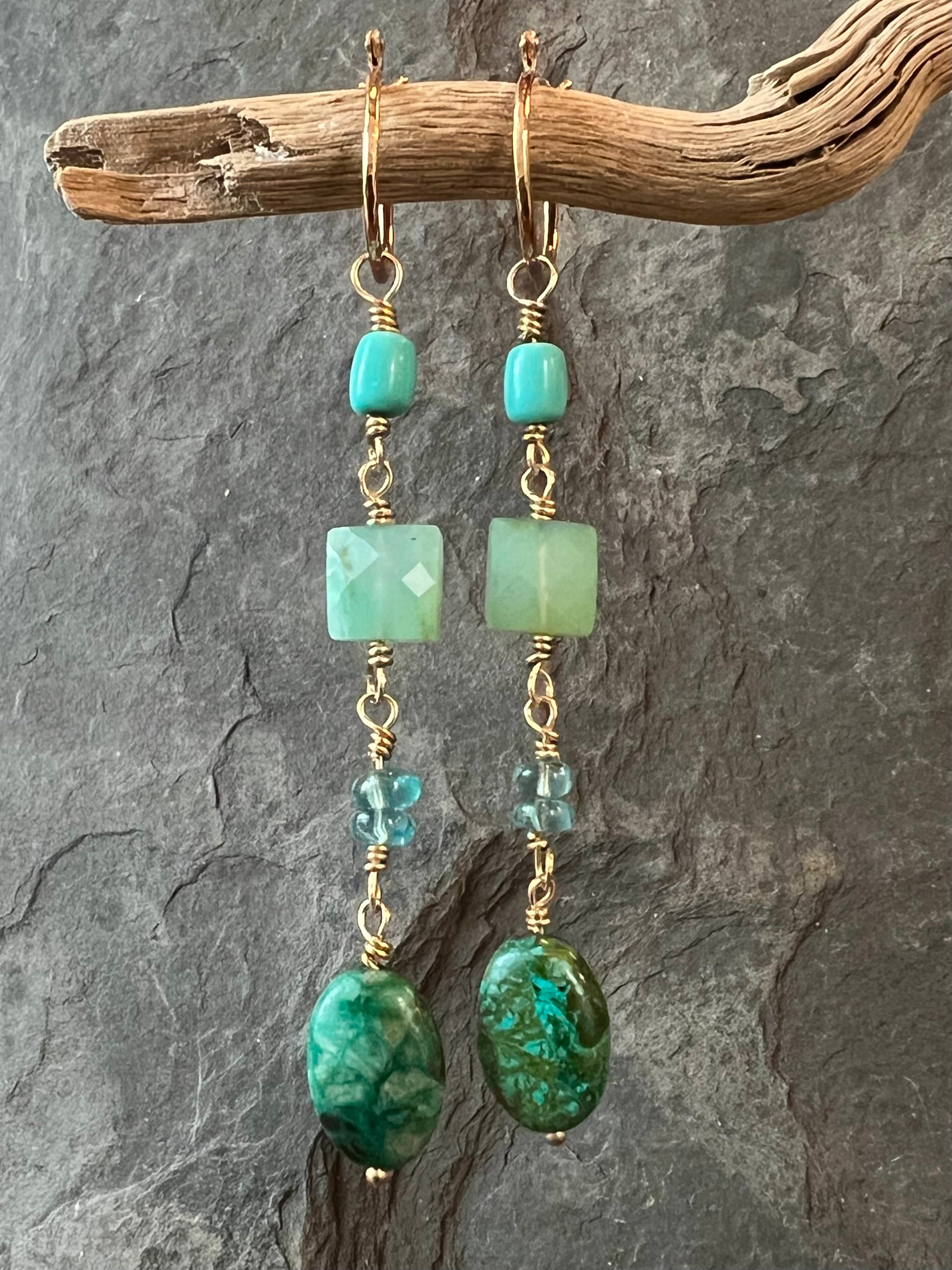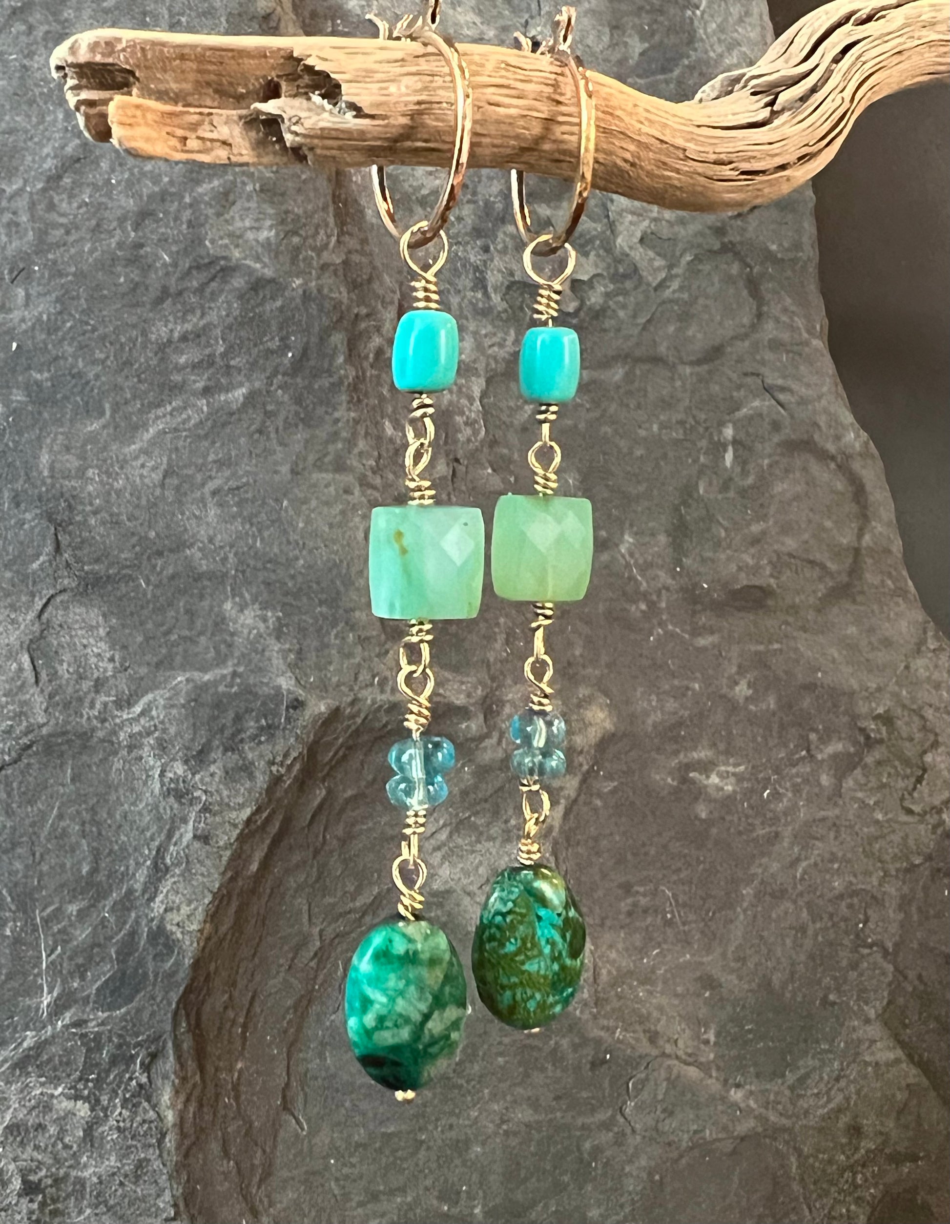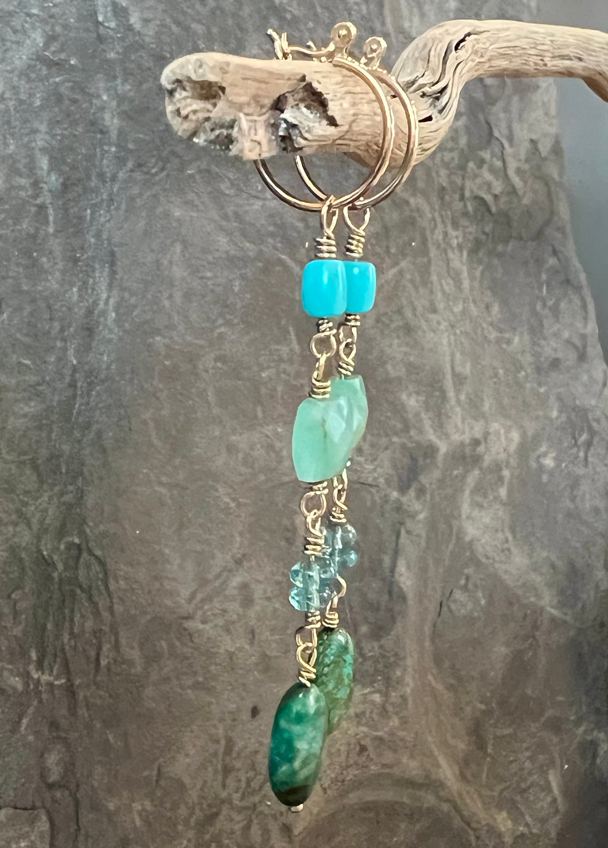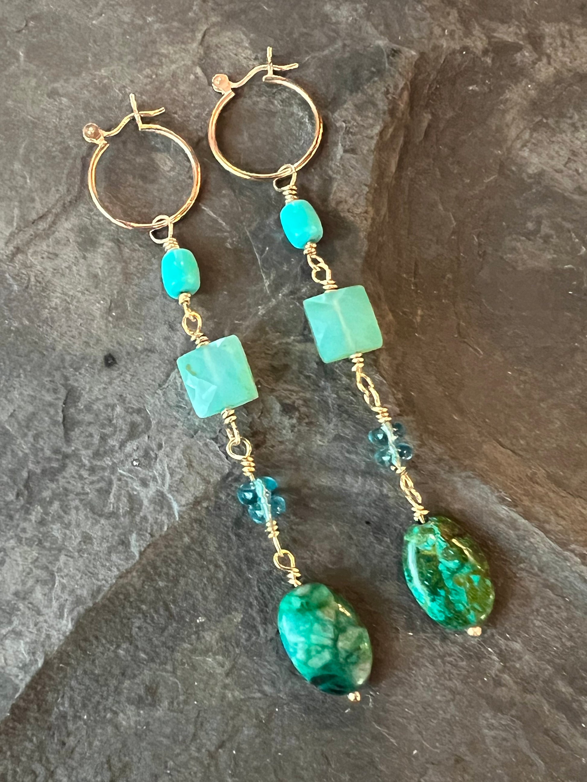 14K yellow gold 1/2 inch mini hoops with gemmy dangle: Kingman Turquoise, Green Chalcedony, Apatite, & Chrysocolla (in order top to bottom)