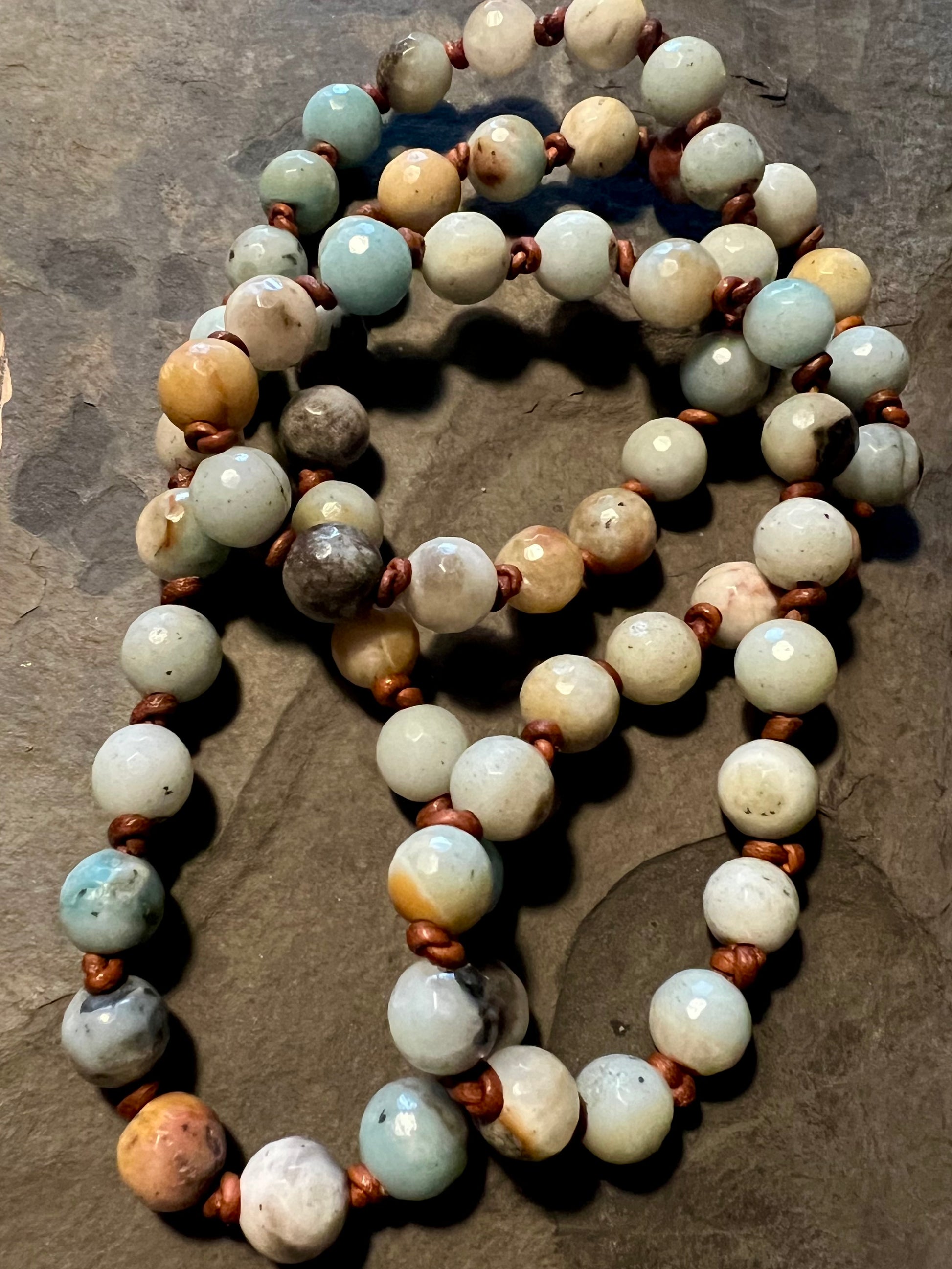 Varying shades of faceted round beads of Amazonite knotted on leather
