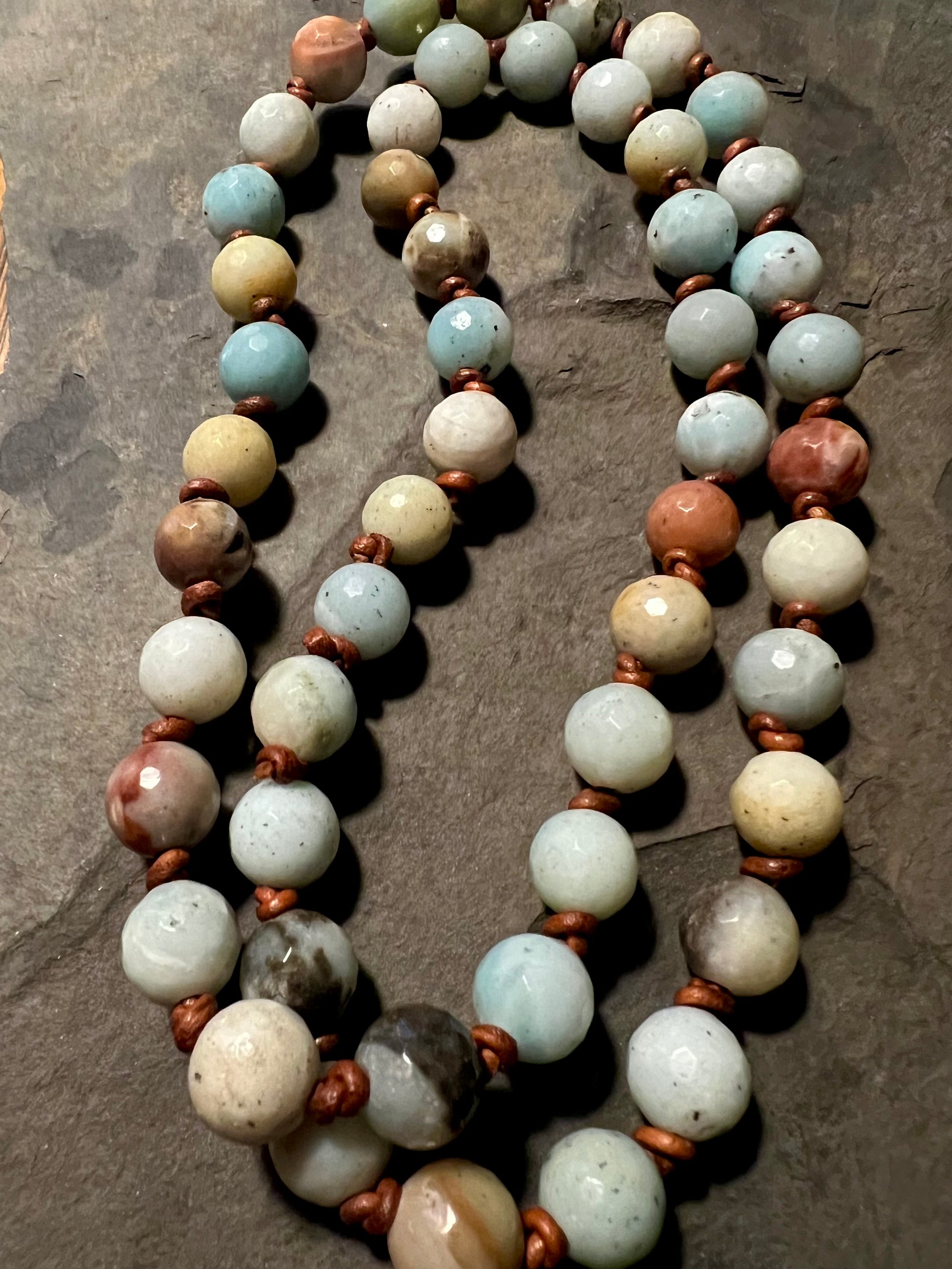Varying shades of faceted round beads of Amazonite knotted on leather