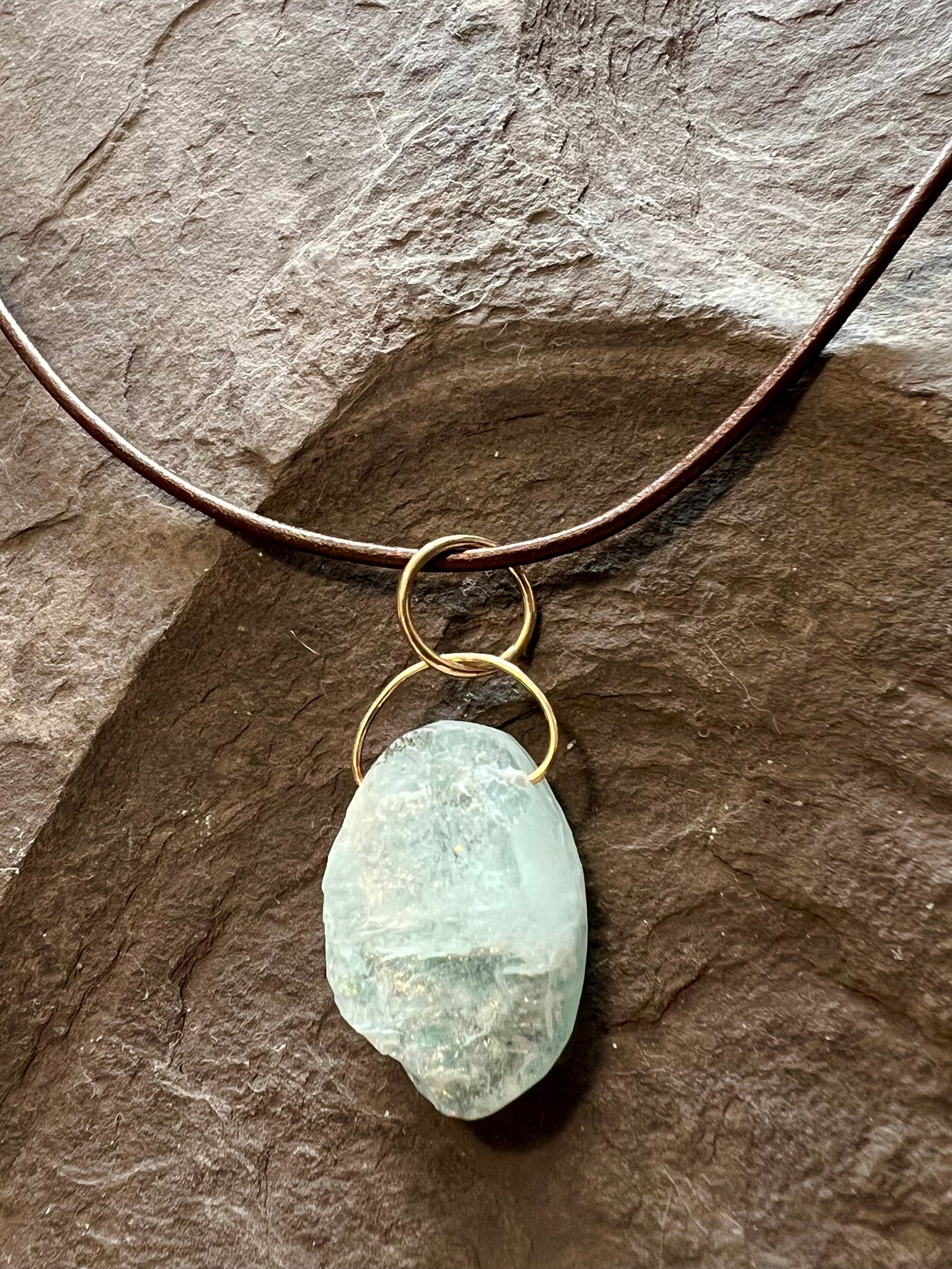 Icy blue Aquamarine gem rough on 14K yellow gold bail