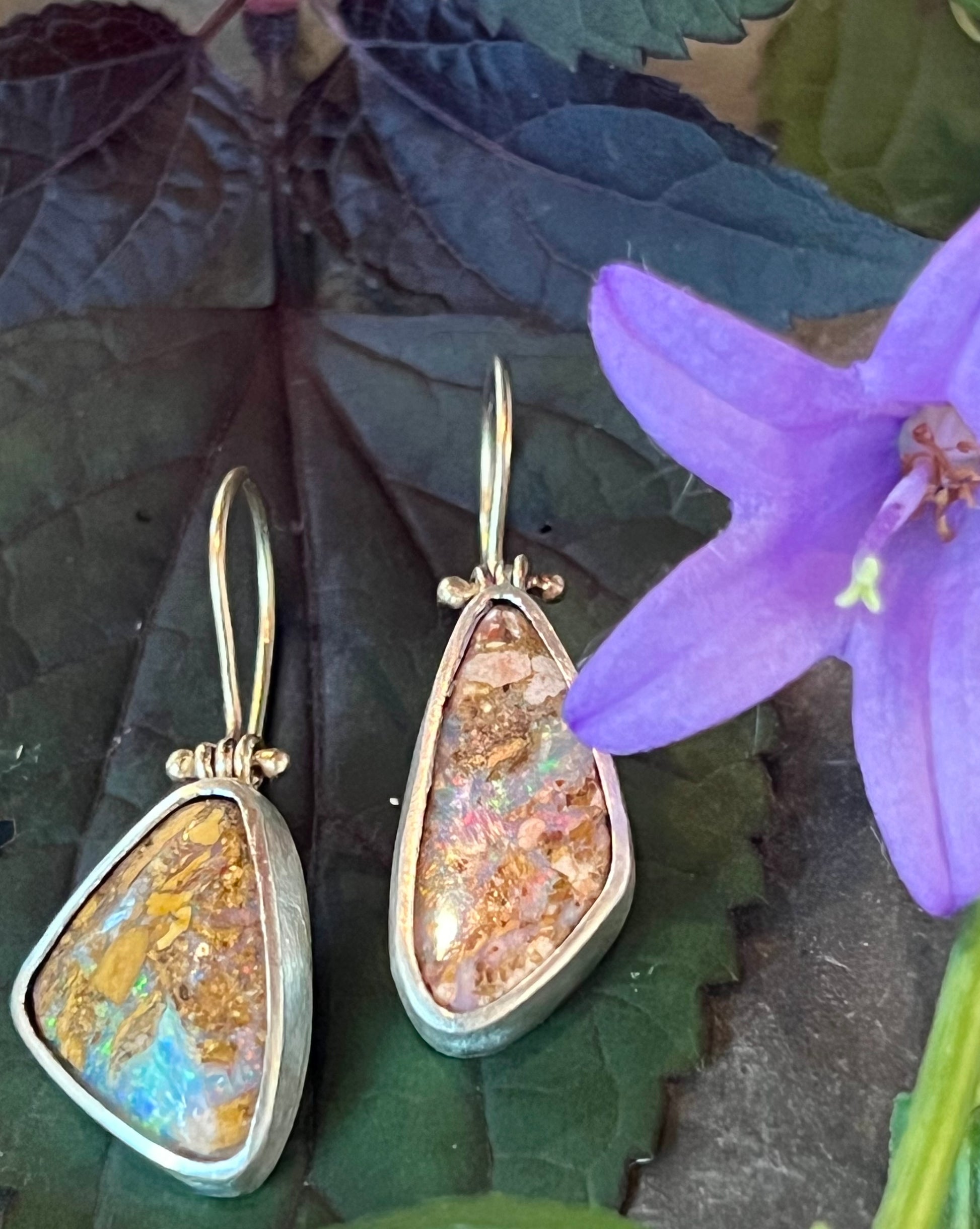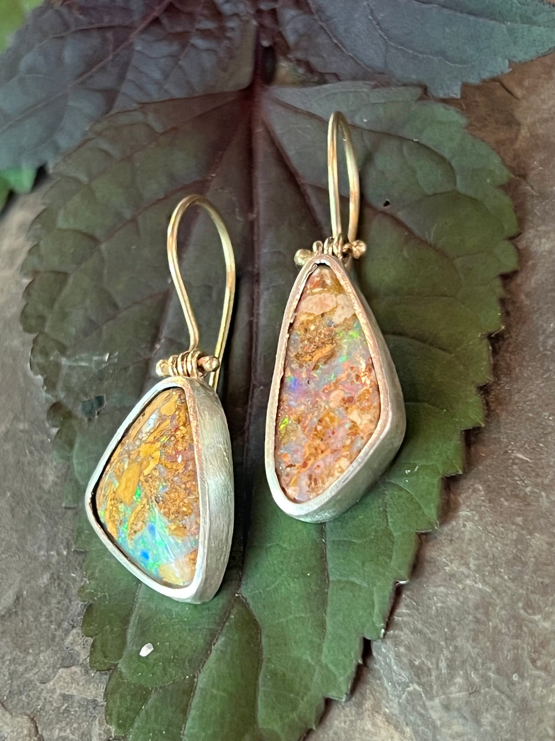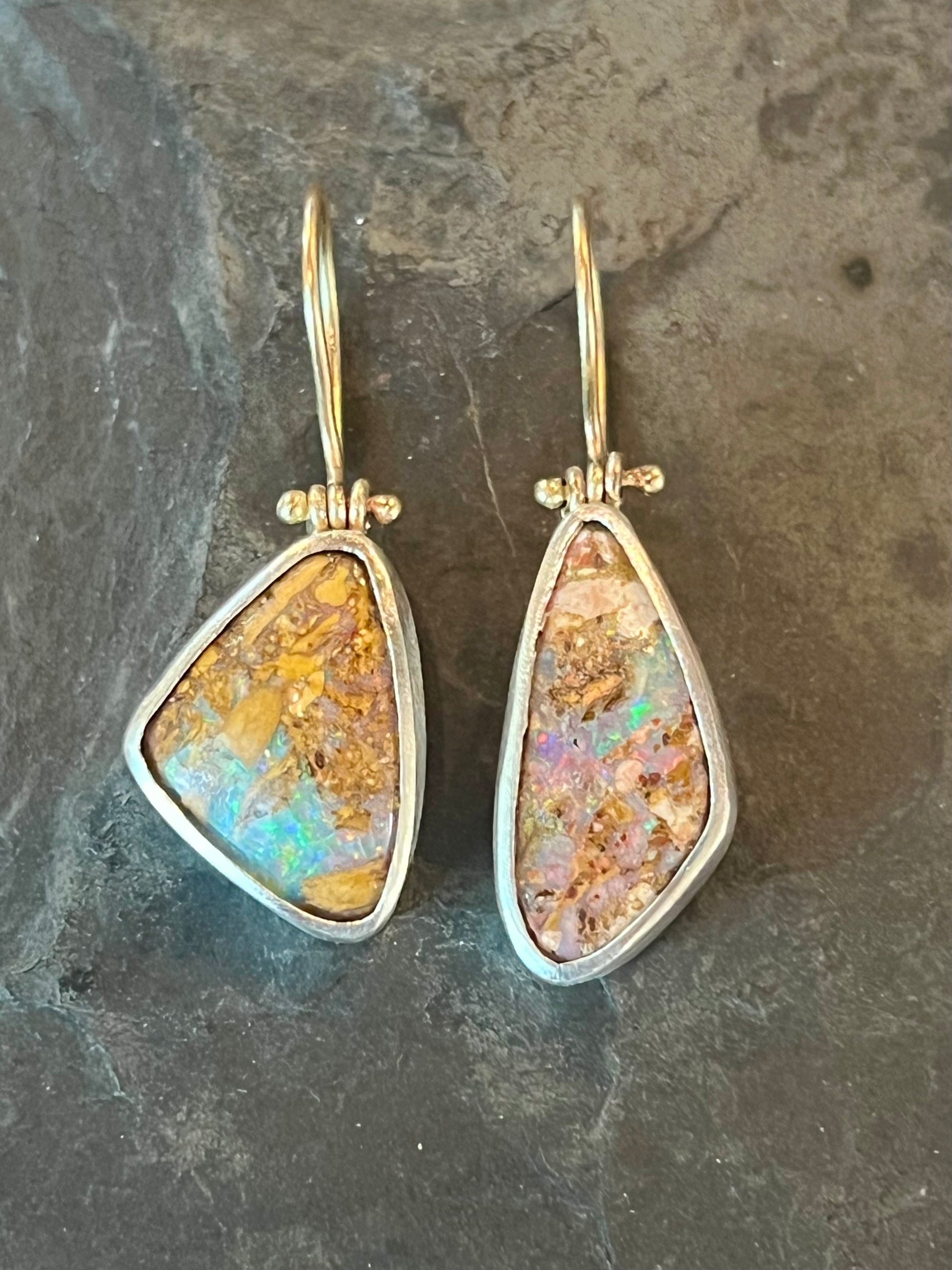 Australian Pipe Opal Hinged Sterling Silver & 14K Drop Earrings- One of a Kind