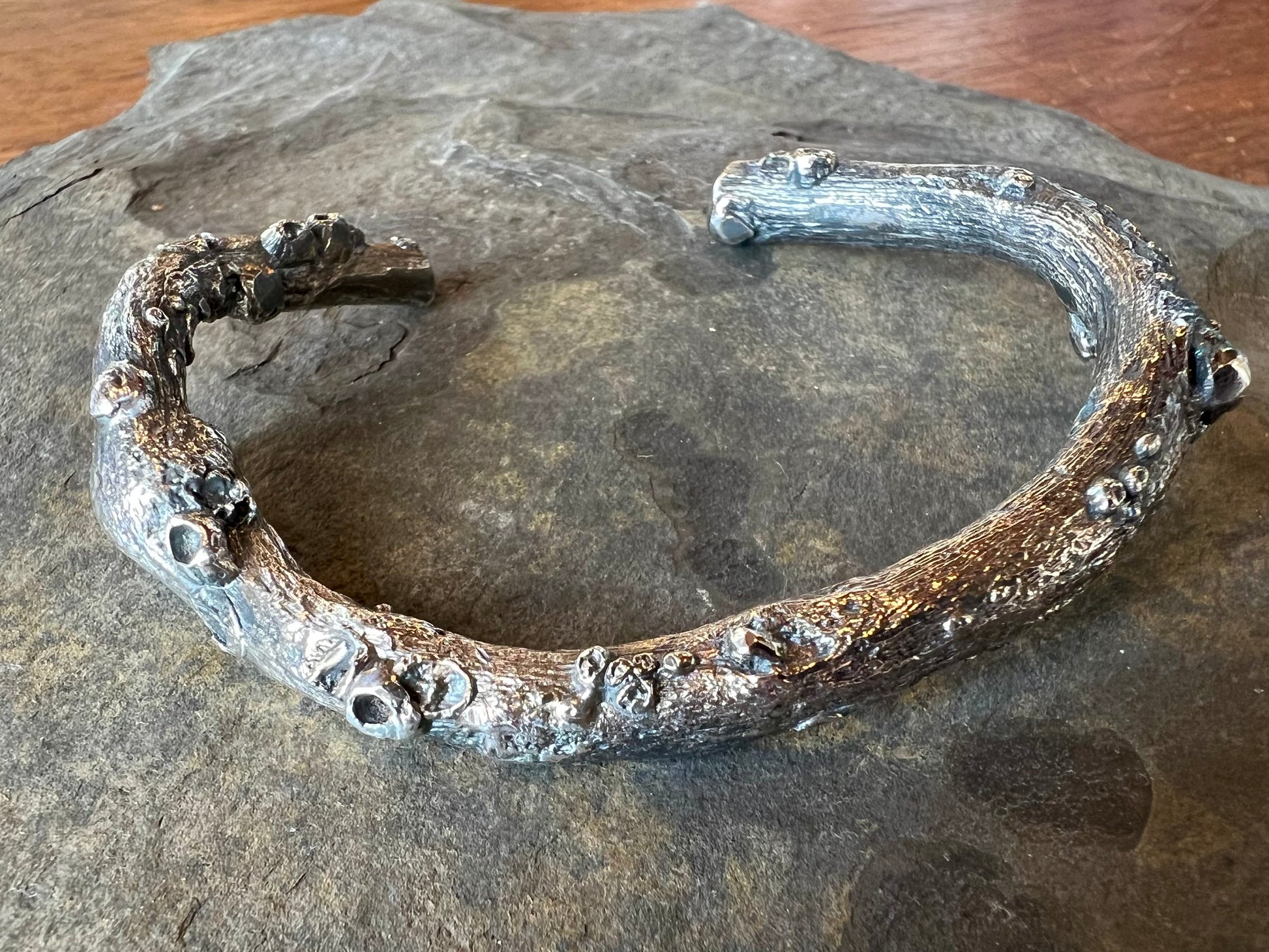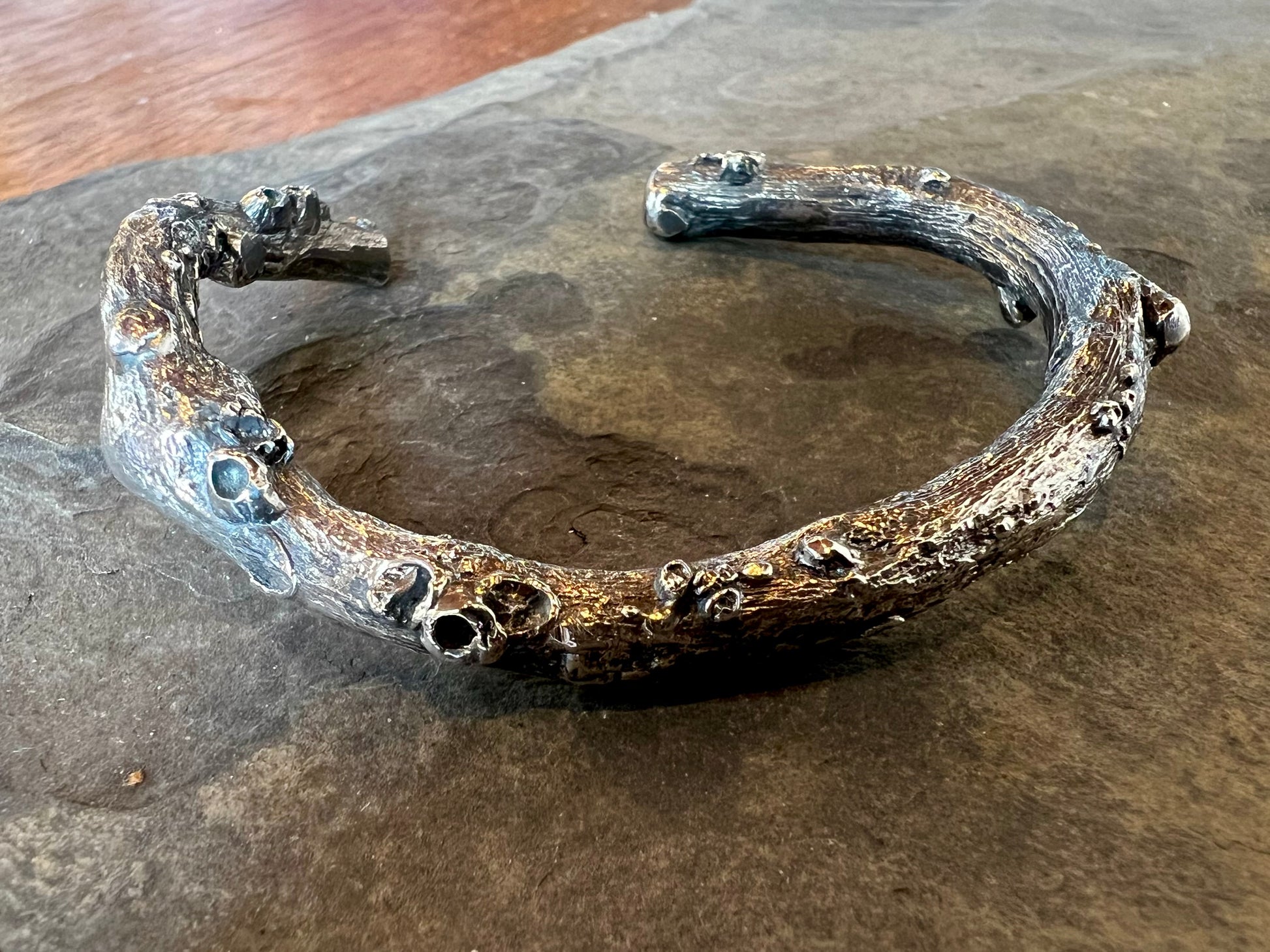 Cast in solid oxidized Sterling silver from a piece of gnarled driftwood with lots of barnacles and character found on the Gulf of Mexico
