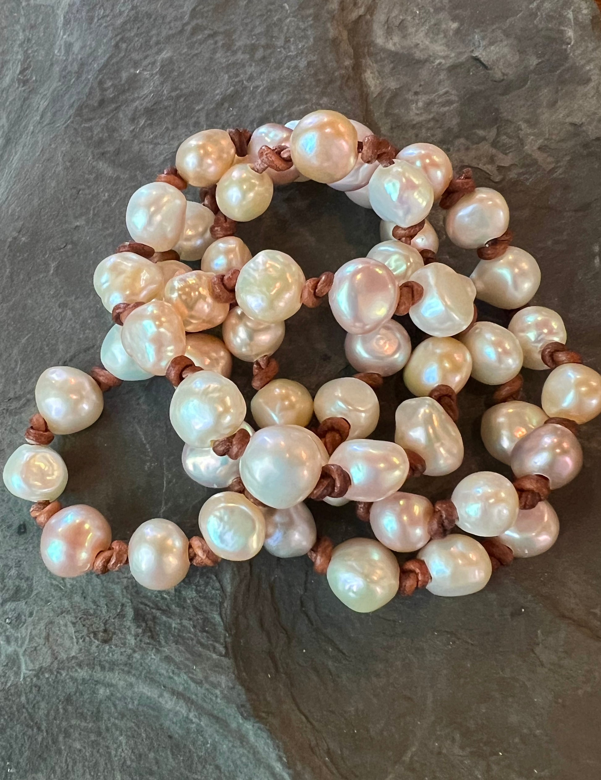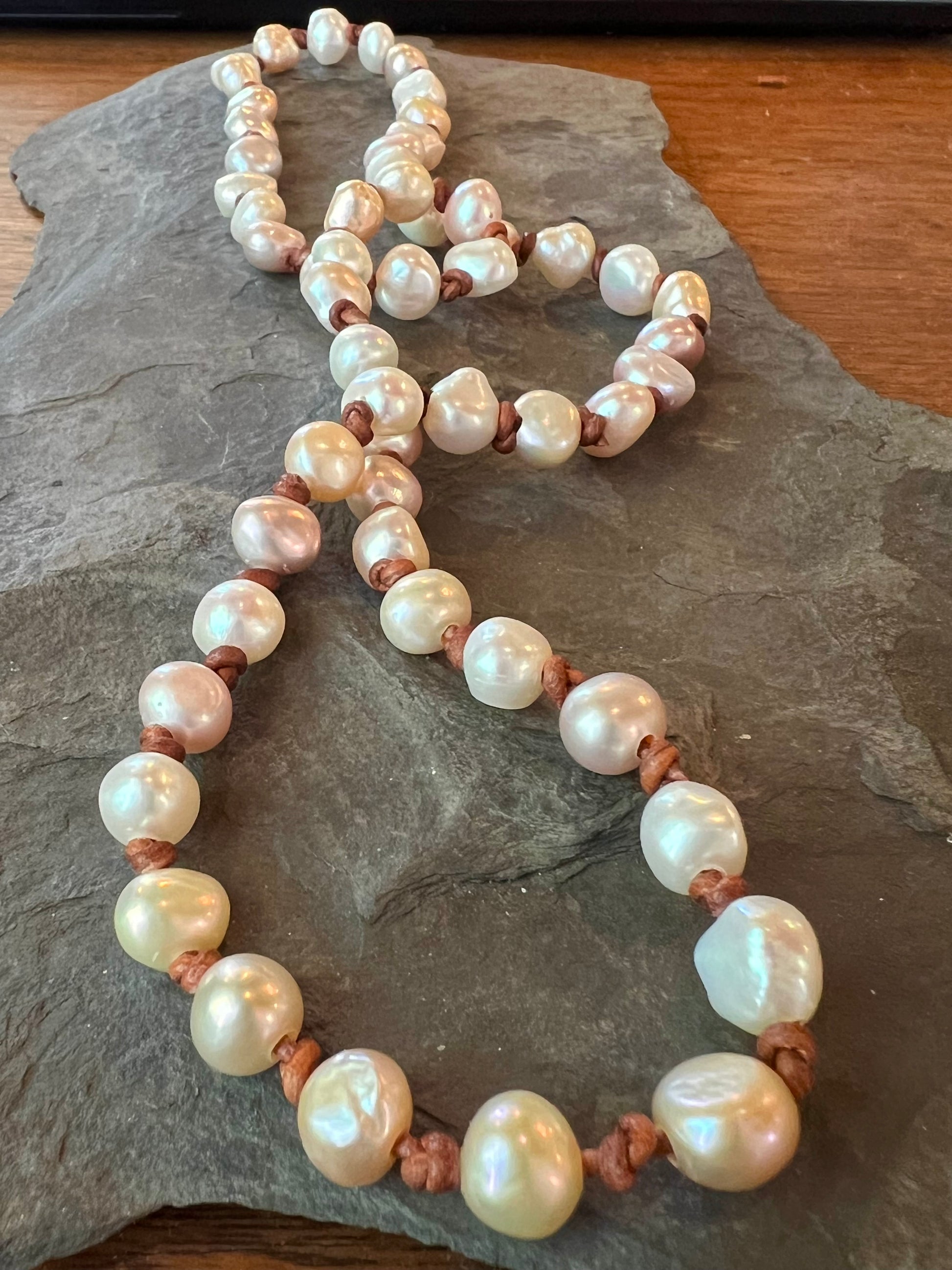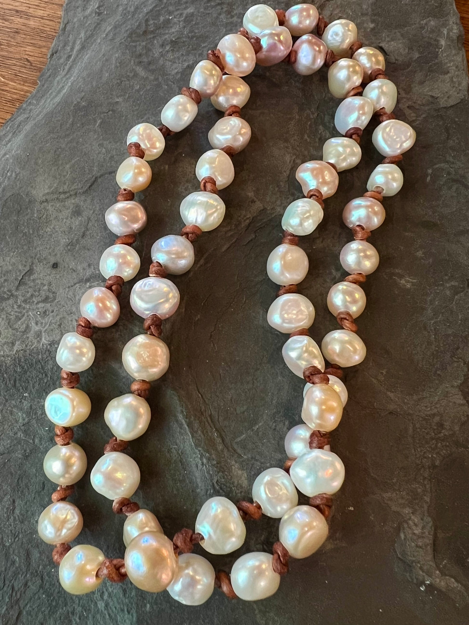 High luster, shades of cream and peach Freshwater baroque pearls hand knotted on brown waxed leather cord