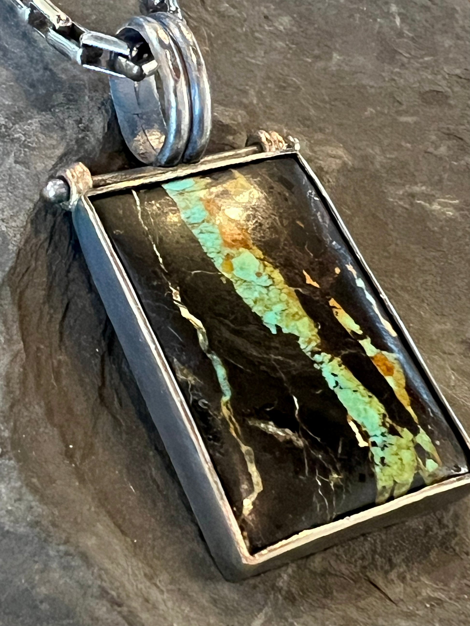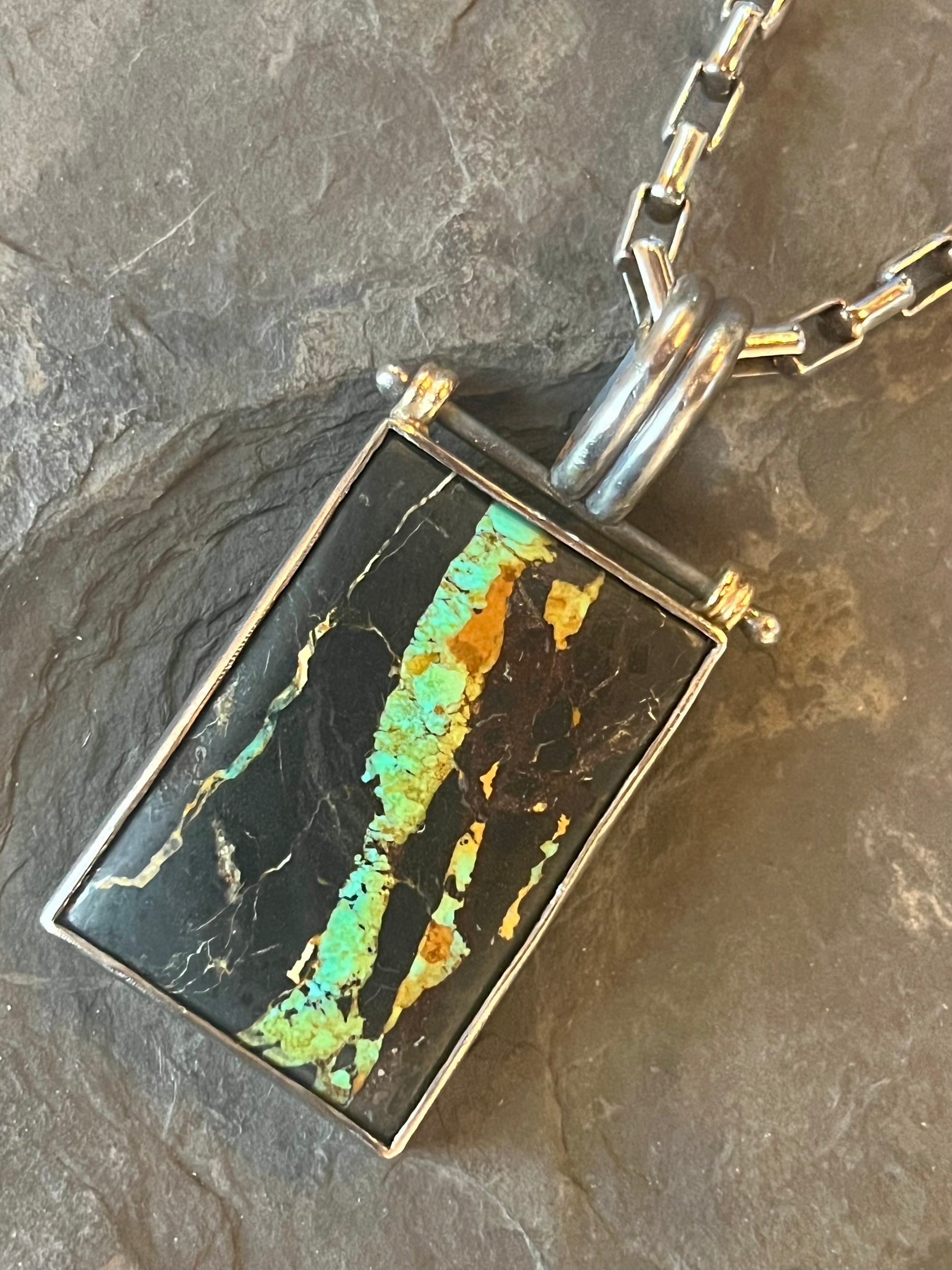 Black Jack Turquoise in distressed oxidized Sterling Silver & 14K Gold Hinged One of a Kind Unisex Pendant