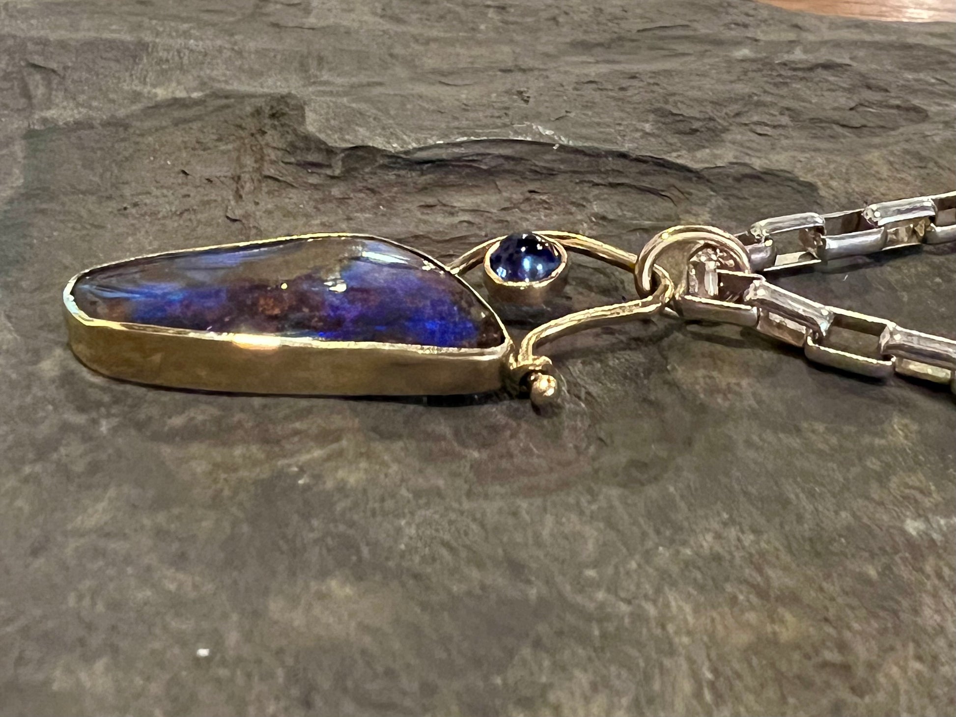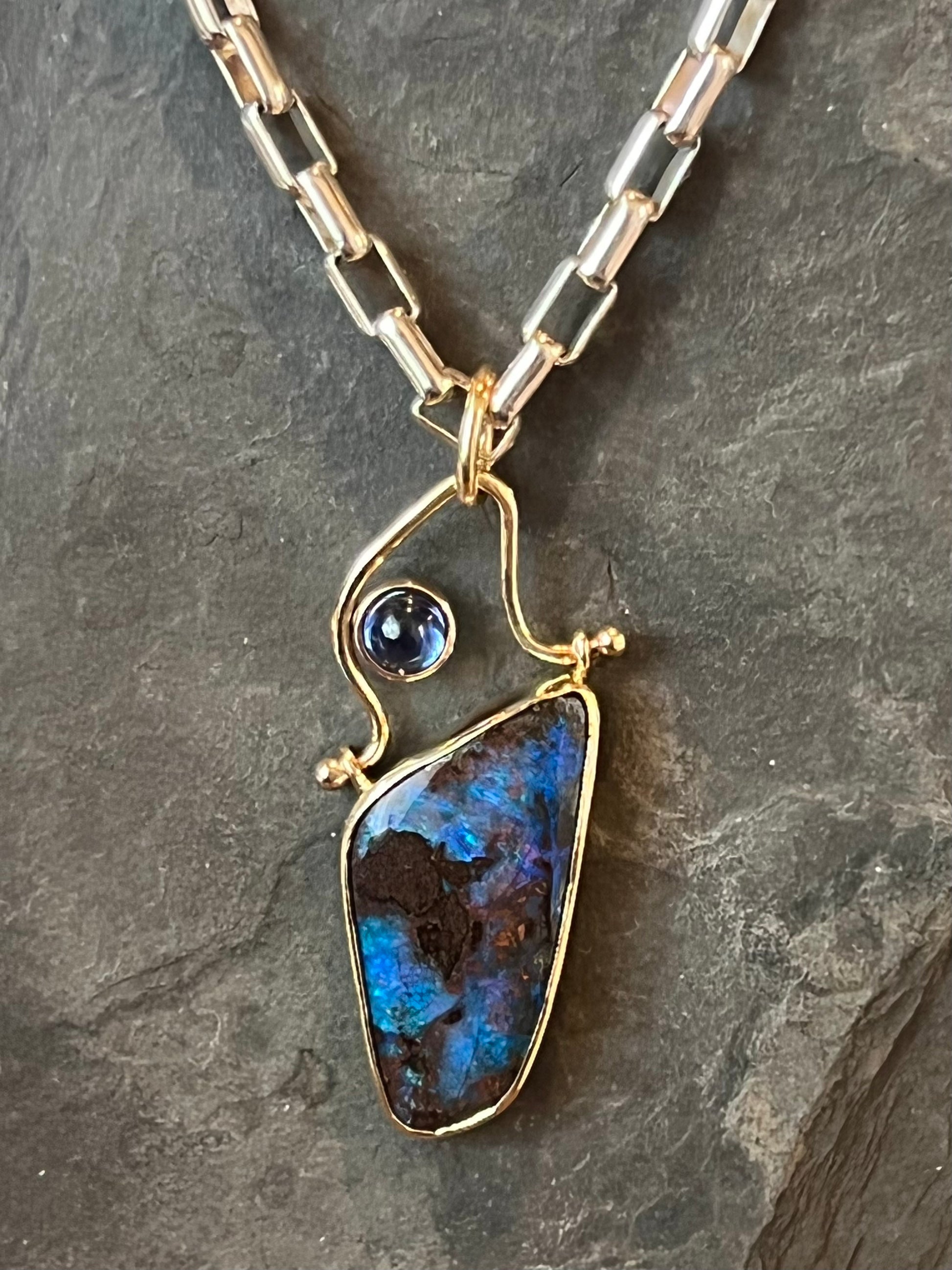 Dynamic Australian Boulder Opal bezel set in 14K yellow gold & Sterling on an asymmetrical 14K movable hinge with a 14K bezel set Kyanite. The pendant is on a solid Sterling silver 4 mm rectangular link 18" chain with lobster clasp.