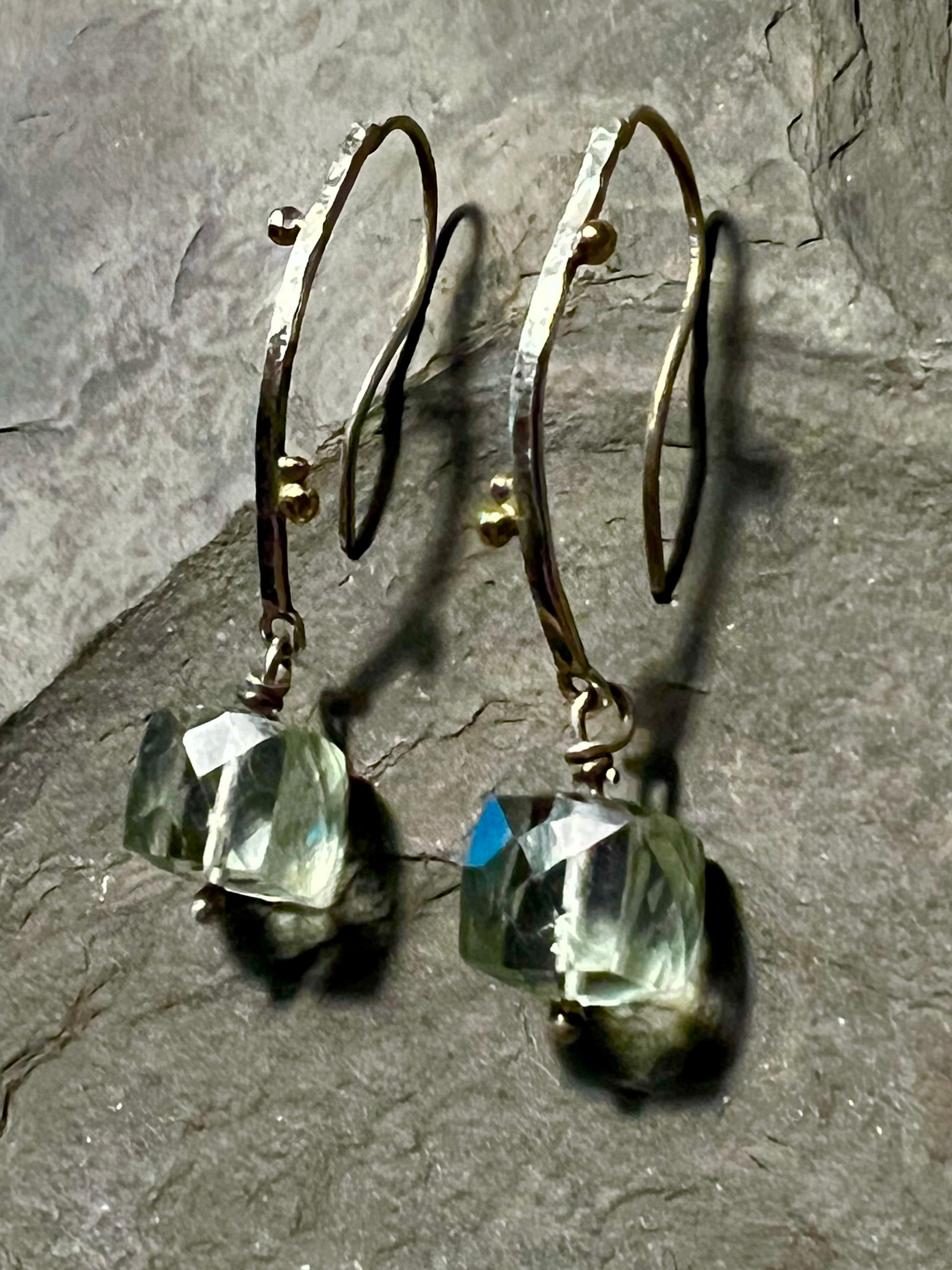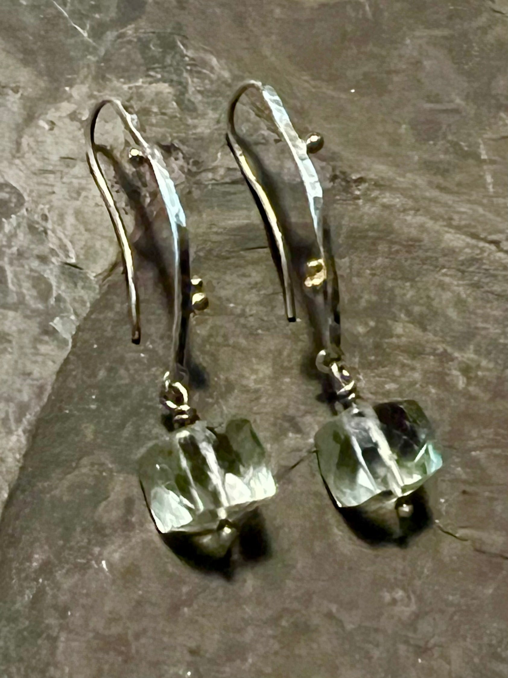 Hammered Sterling silver semi hoop with 14K yellow gold bubbles and faceted Green Quartz dangle- lots of texture and sparkle