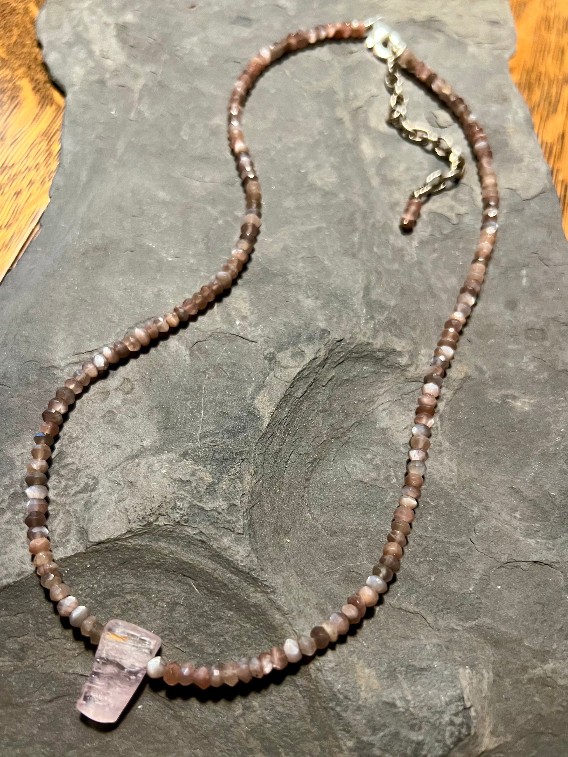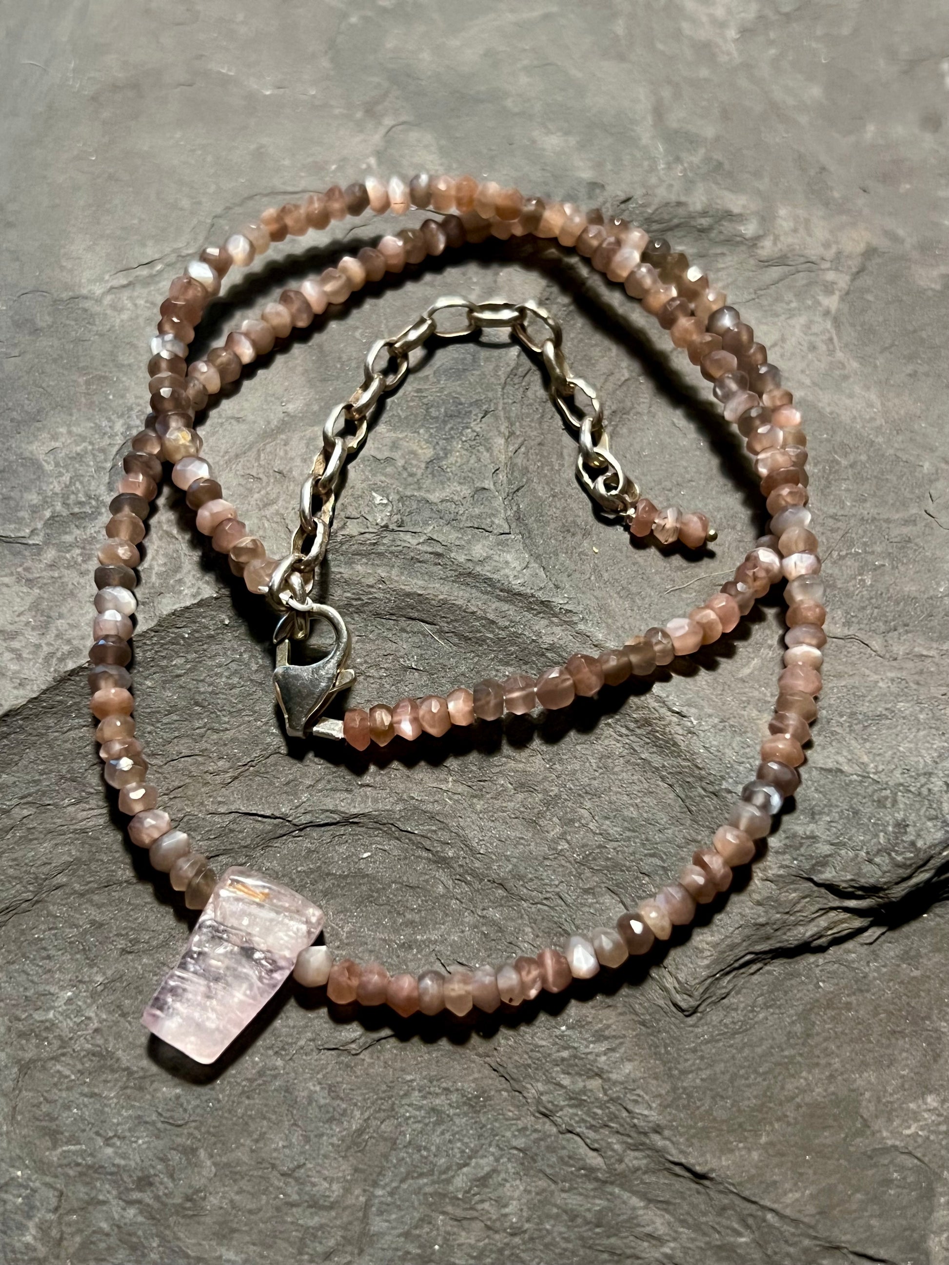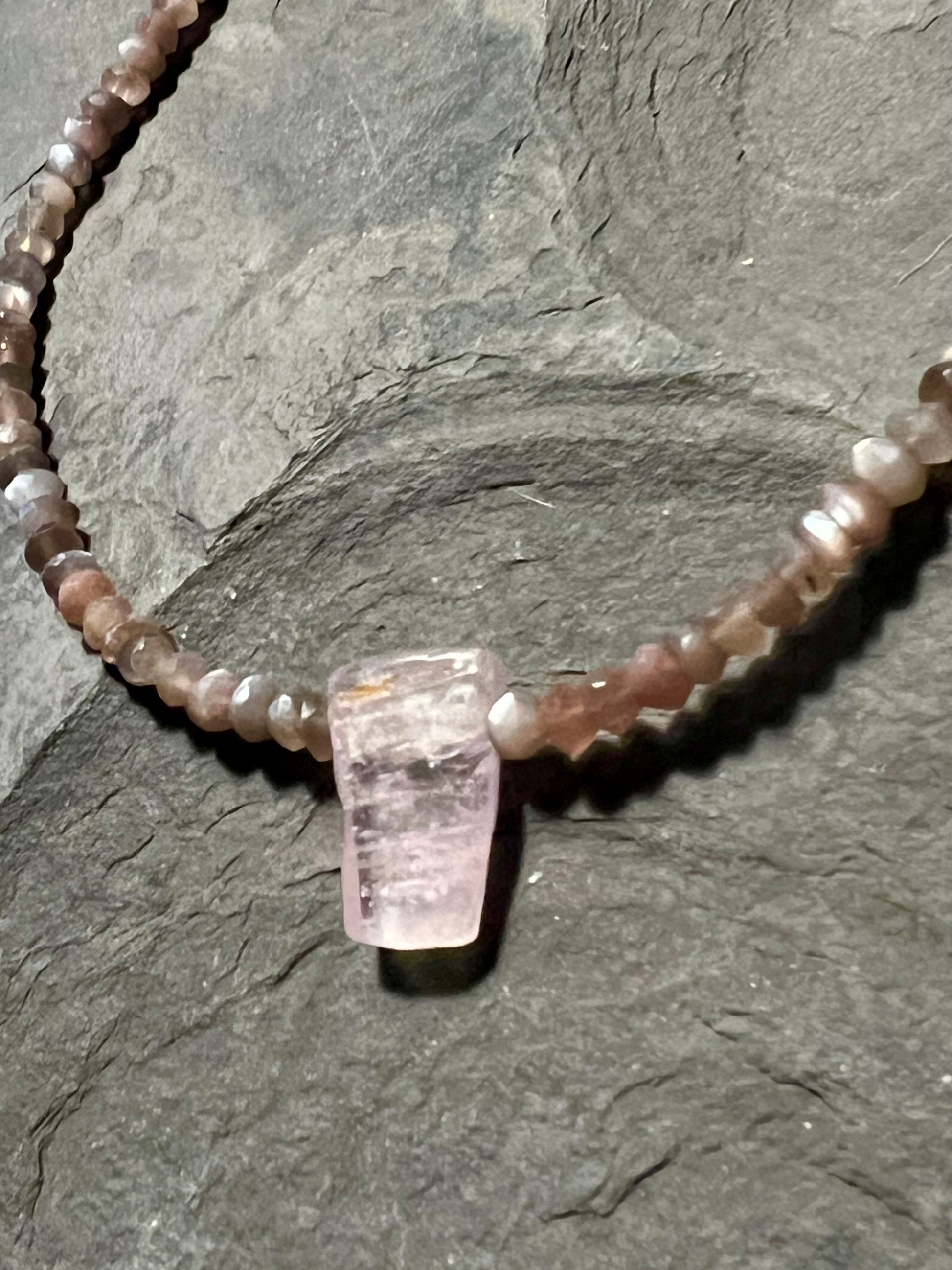 Raw Kunzite crystal in the center of a gray faceted rondelle Moonstone strand