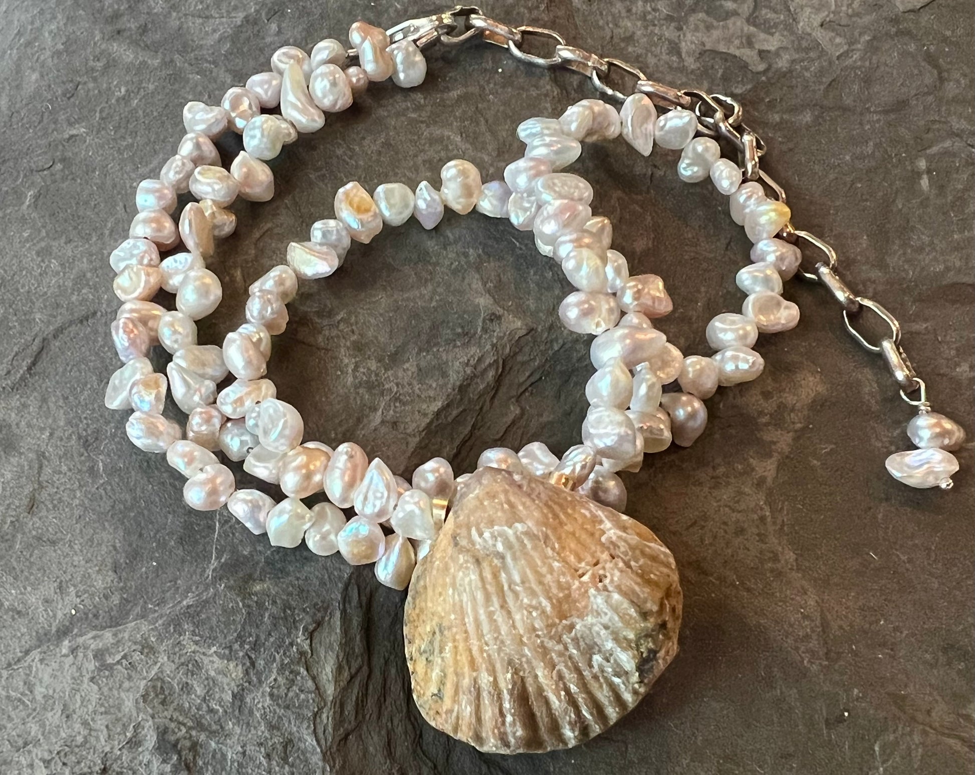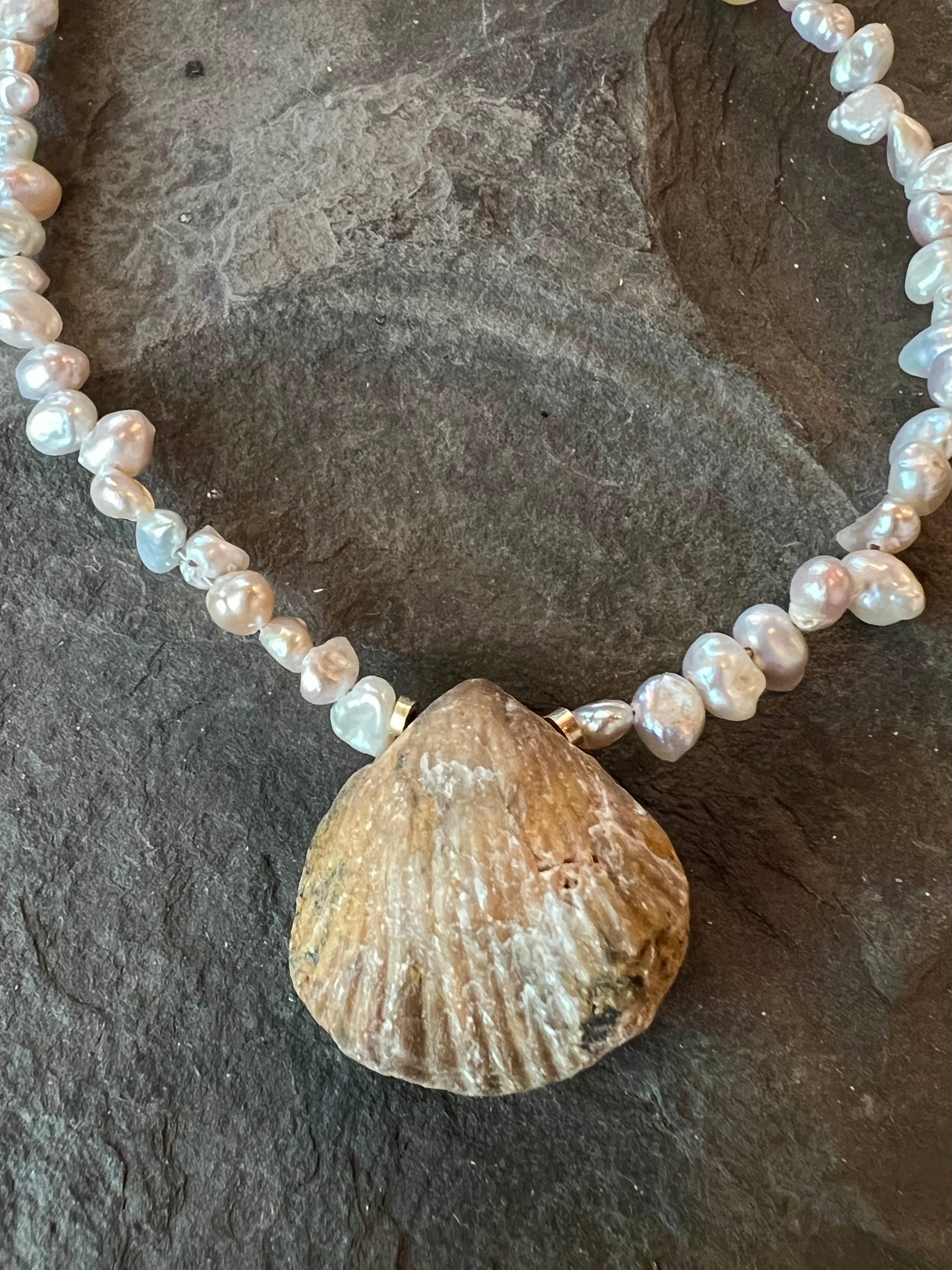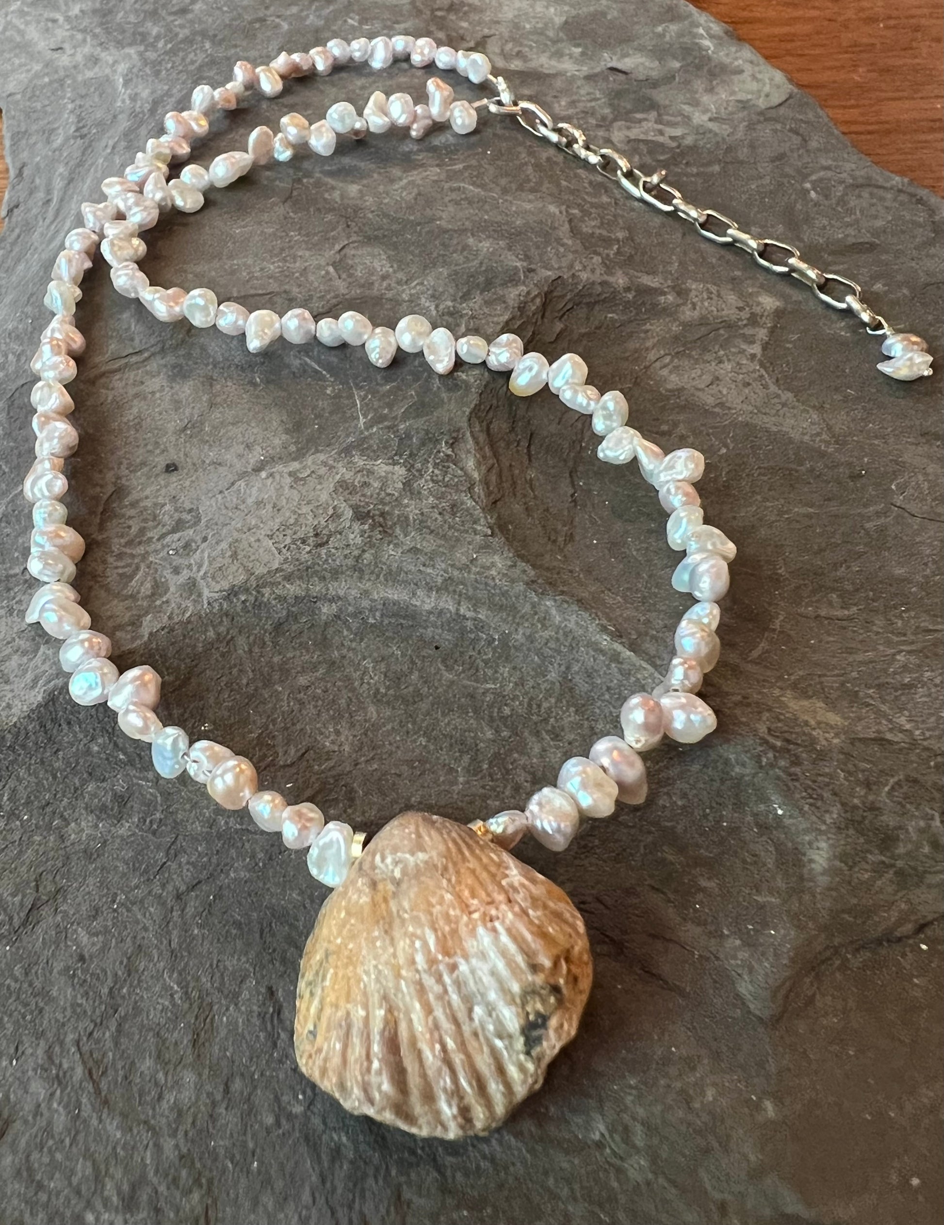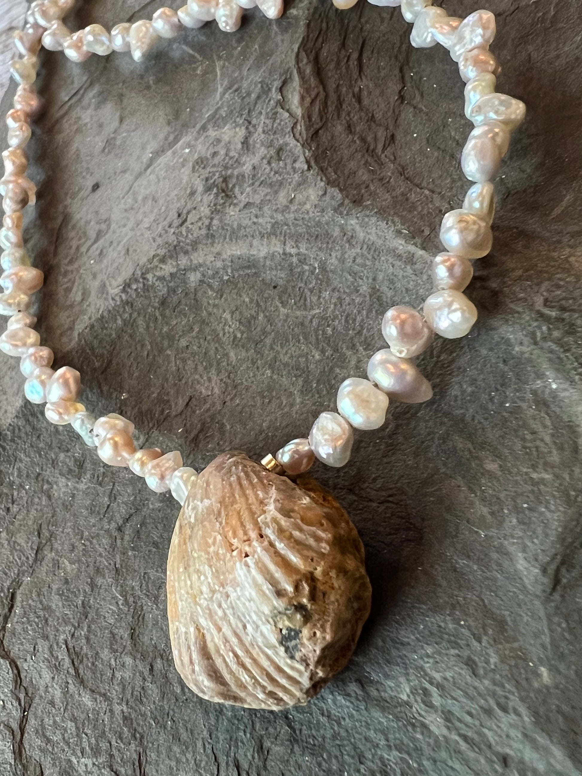 Clam Fossil & High Luster Fresh Water Pearl One of a Kind Necklace