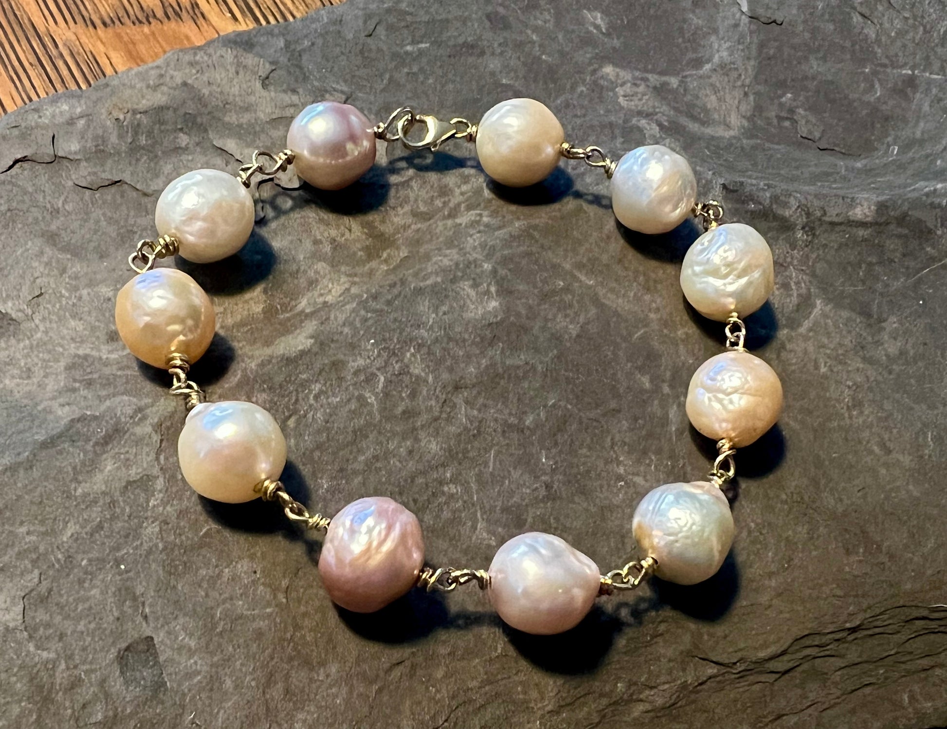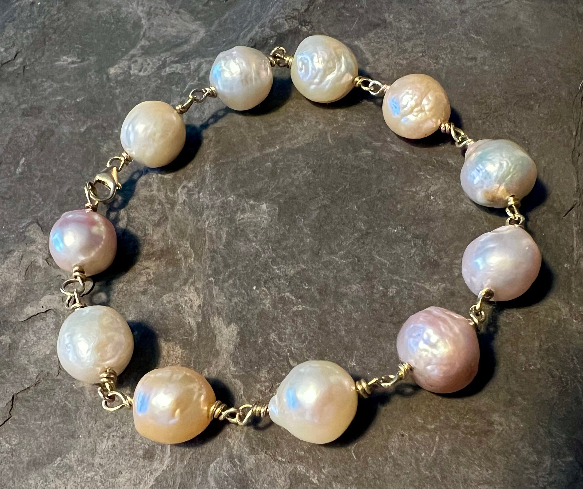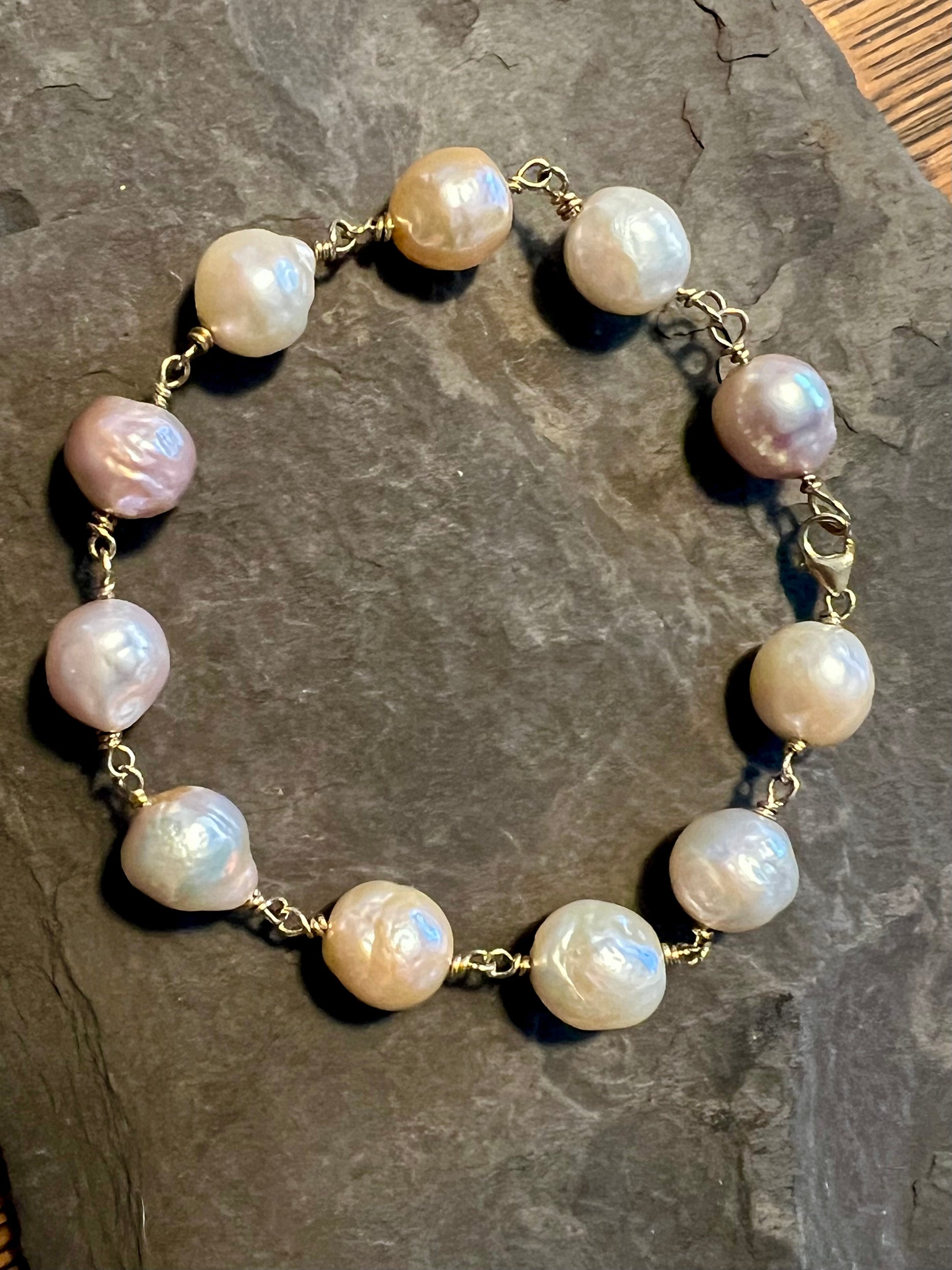 Bracelet is 8.25" with 14K lobster clasp (bracelet should be 0.25" longer than what you would usually prefer to allow for half the diameter of the pearls). Bracelet can be lengthened upon request with a jump ring or additional pearl.
