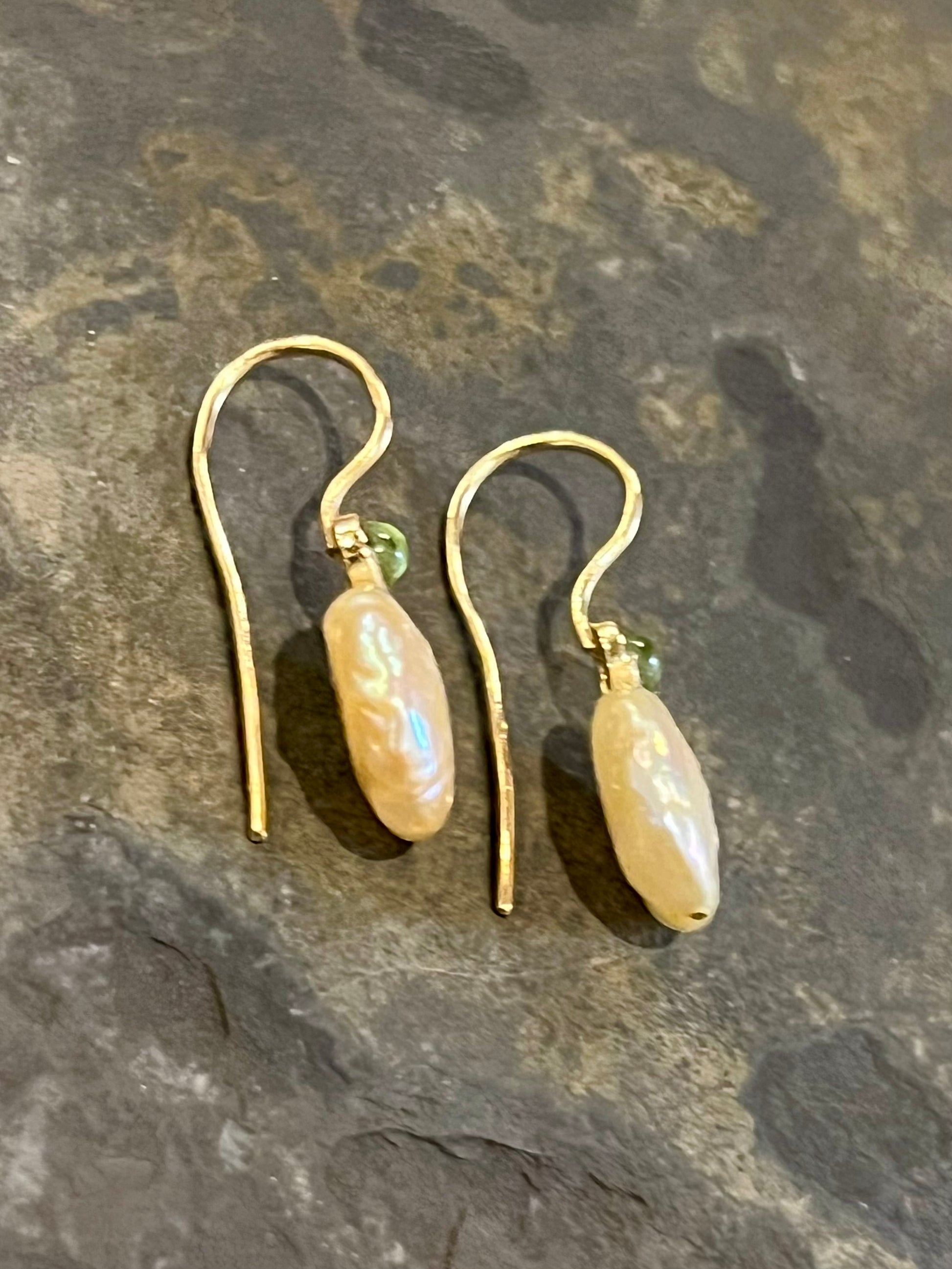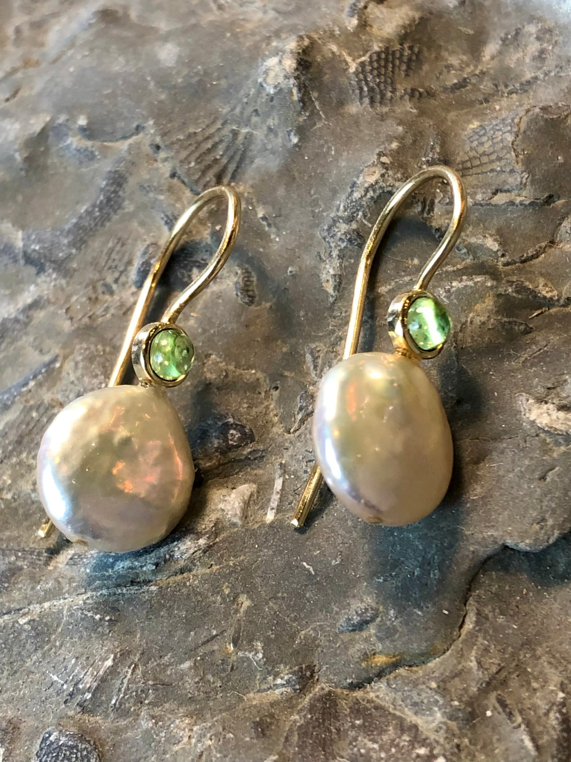 Simple & elegant, peachy coin pearl and apple green bezel set Peridot cabochons in 14K yellow gold.