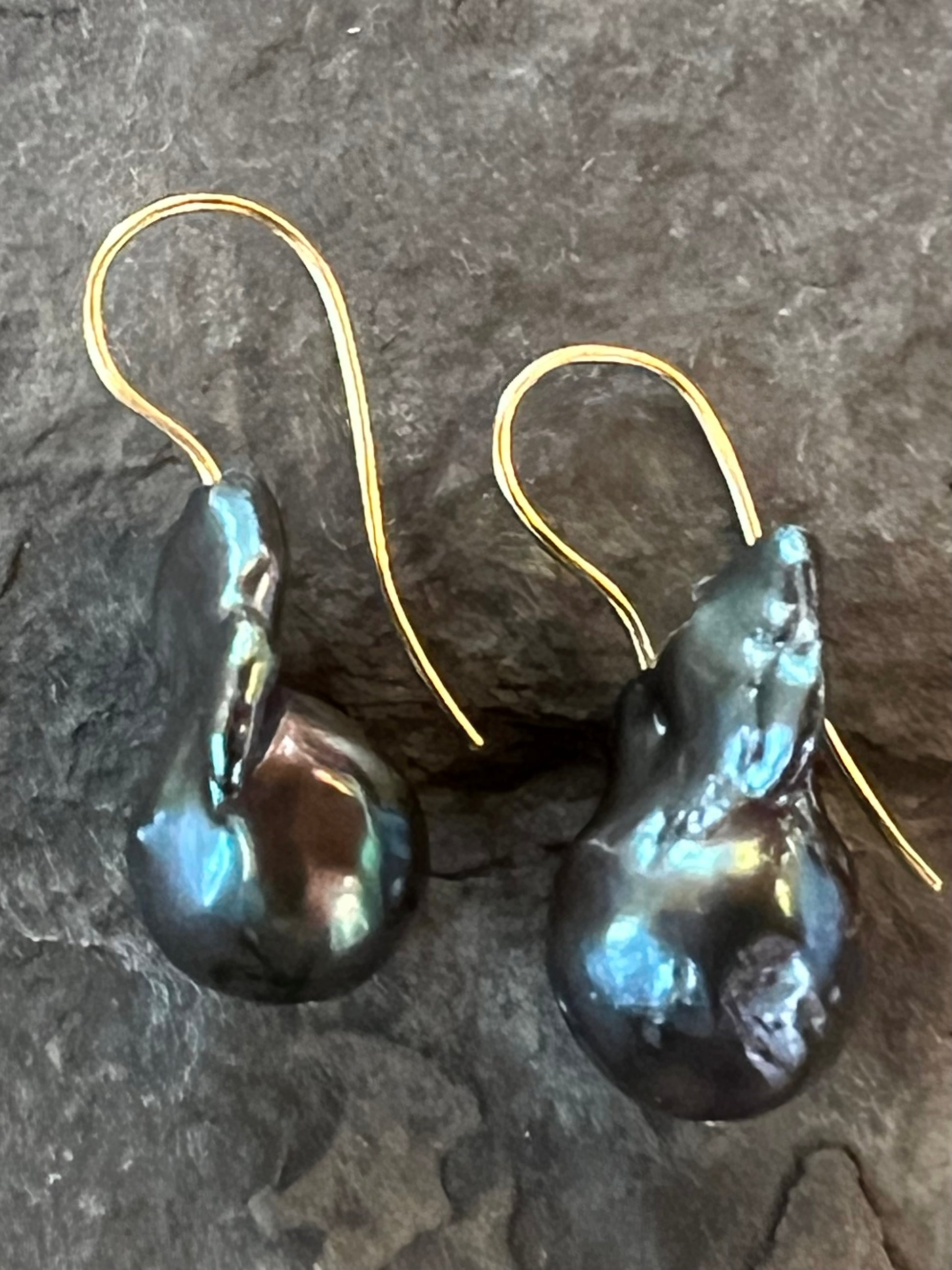 Extra Large Peacock Baroque Freshwater Pearls on 14K yellow gold minimalist shepherd hook ear wires