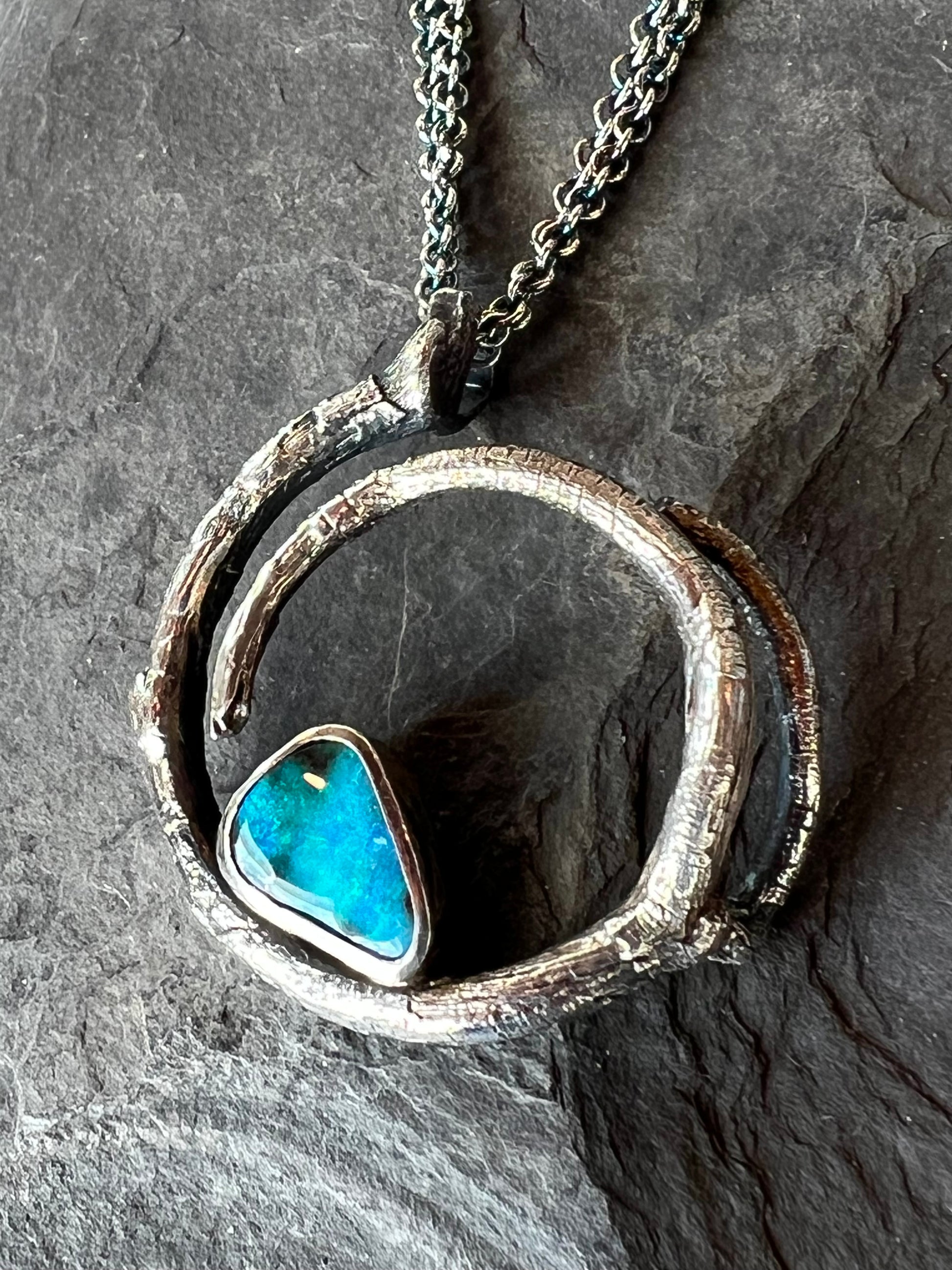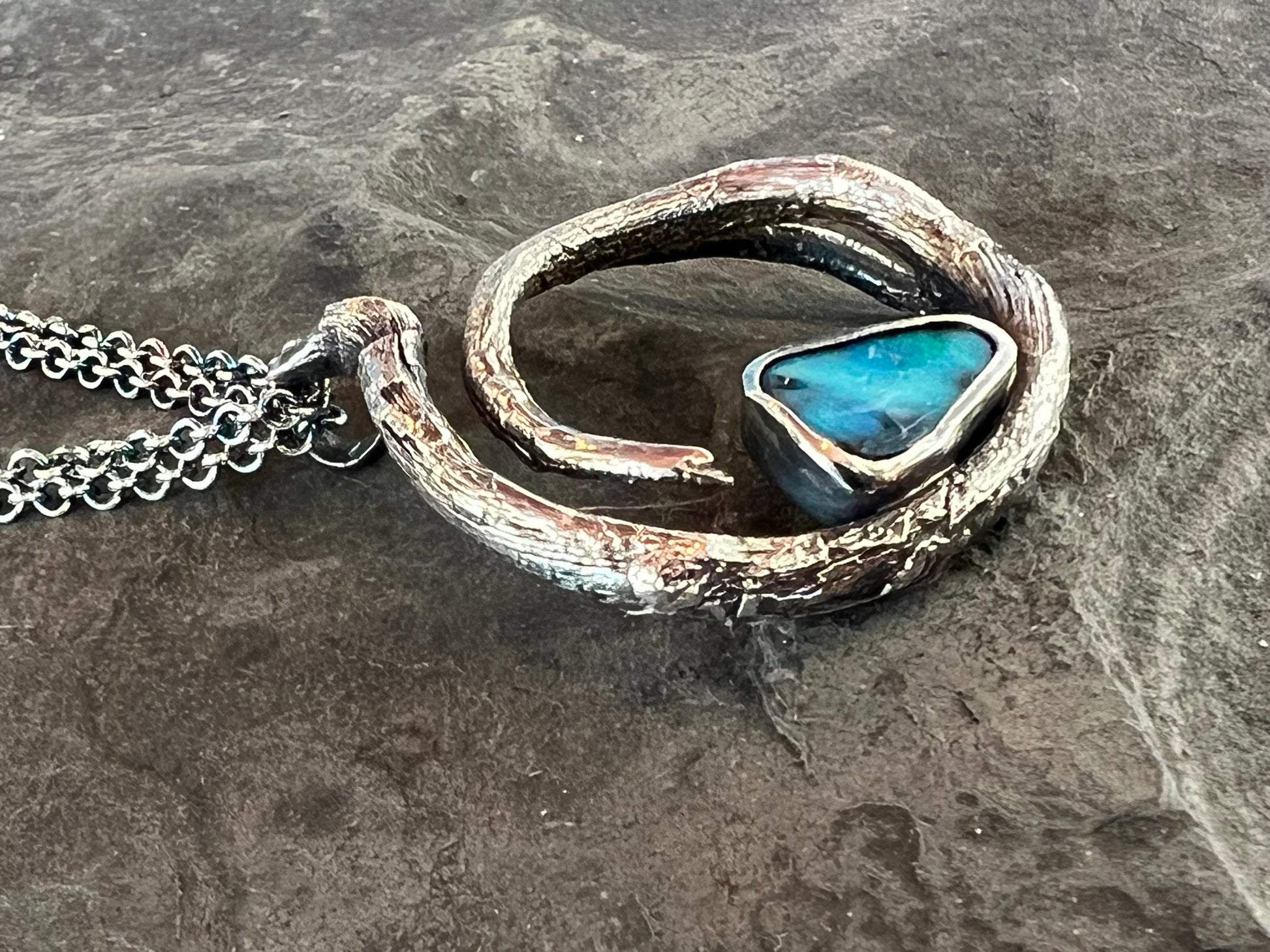 Water worn grape vine tendril in an amazing Mother Earth shape found along the shore of Cayuga Lake cast in solid sterling and oxidized to enhance all the organic detail and bezel set with an Australian Boulder Opal.