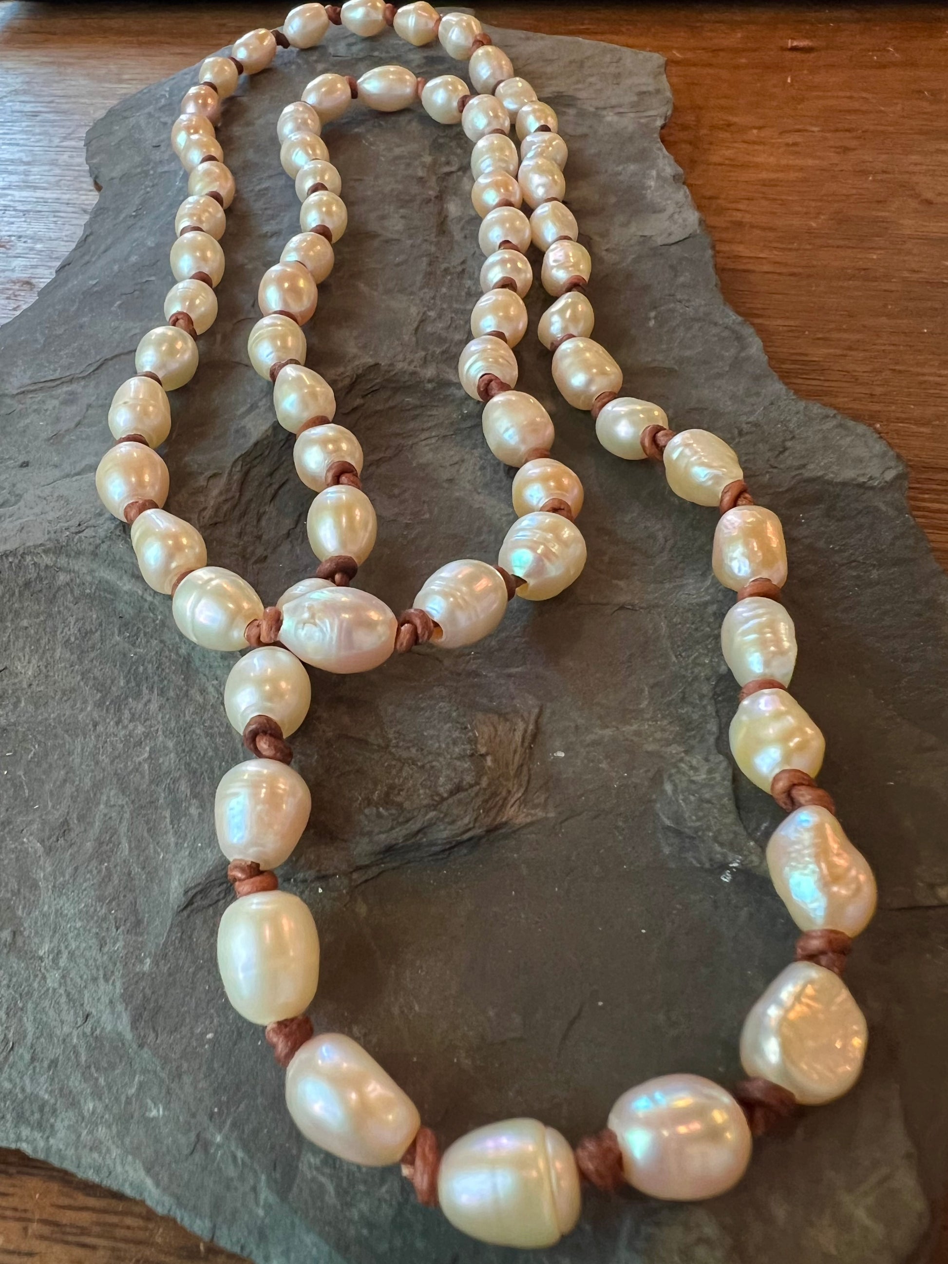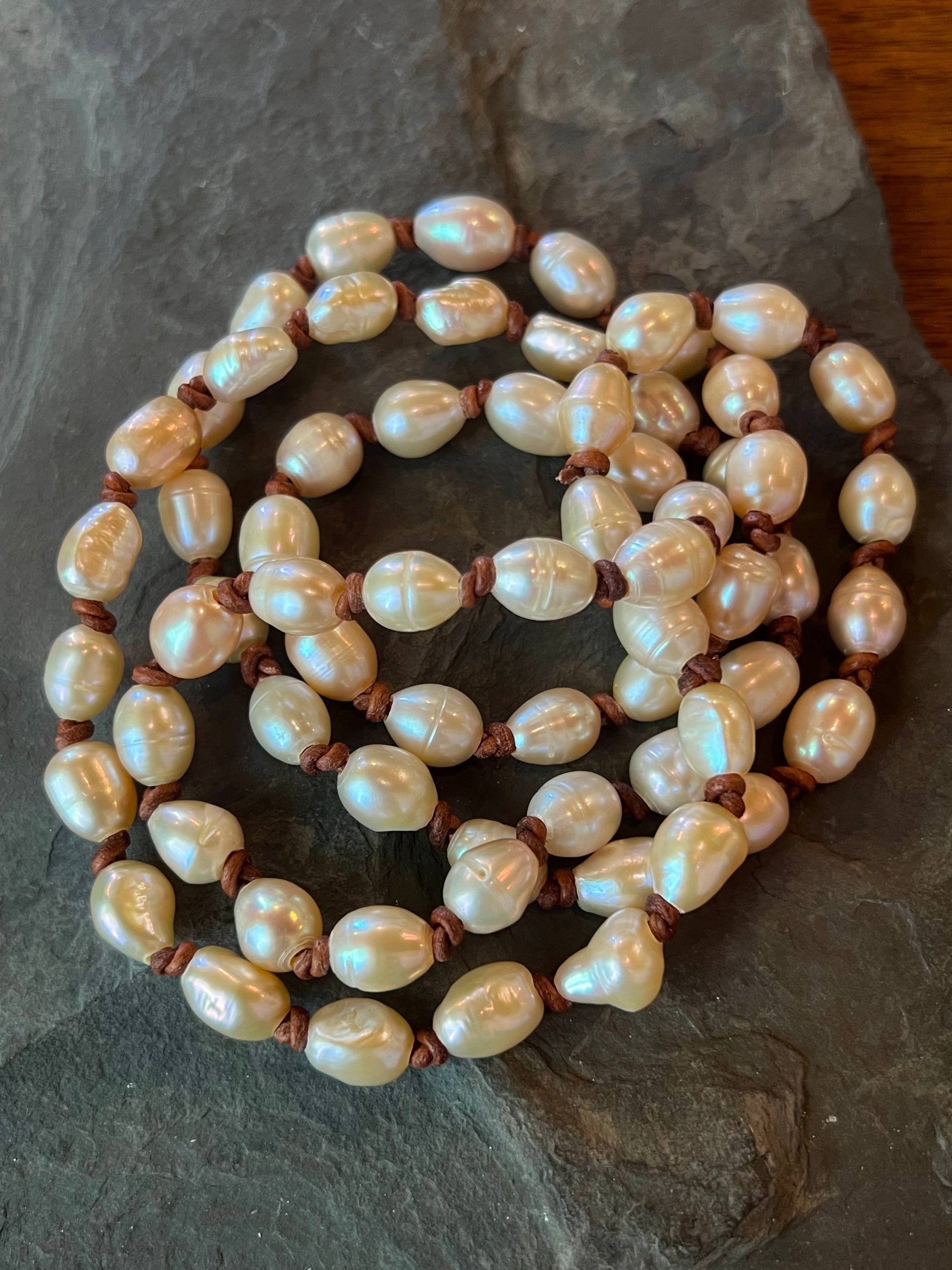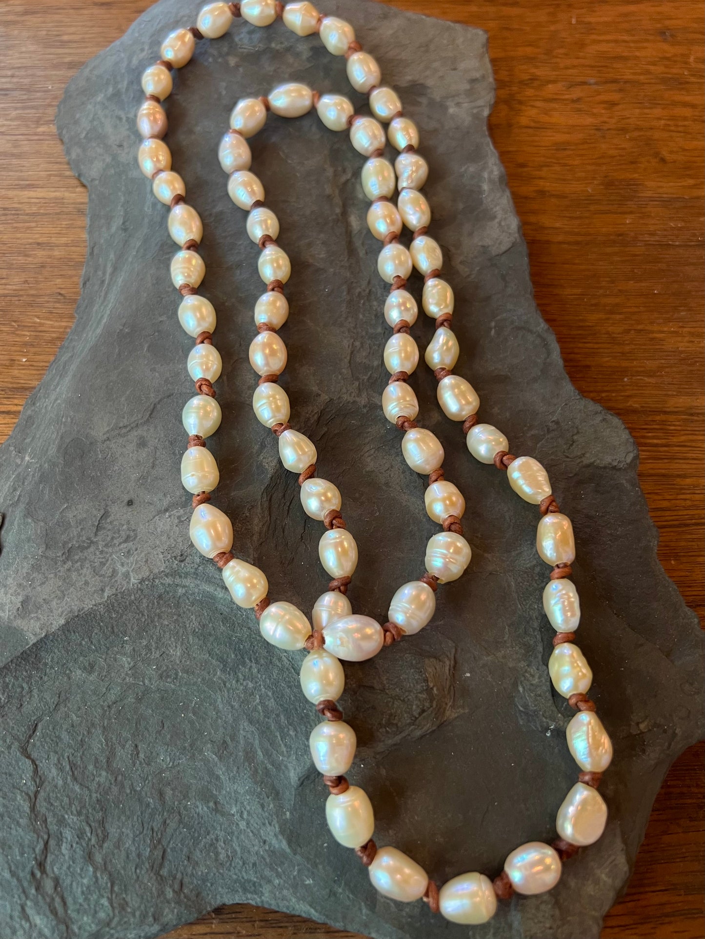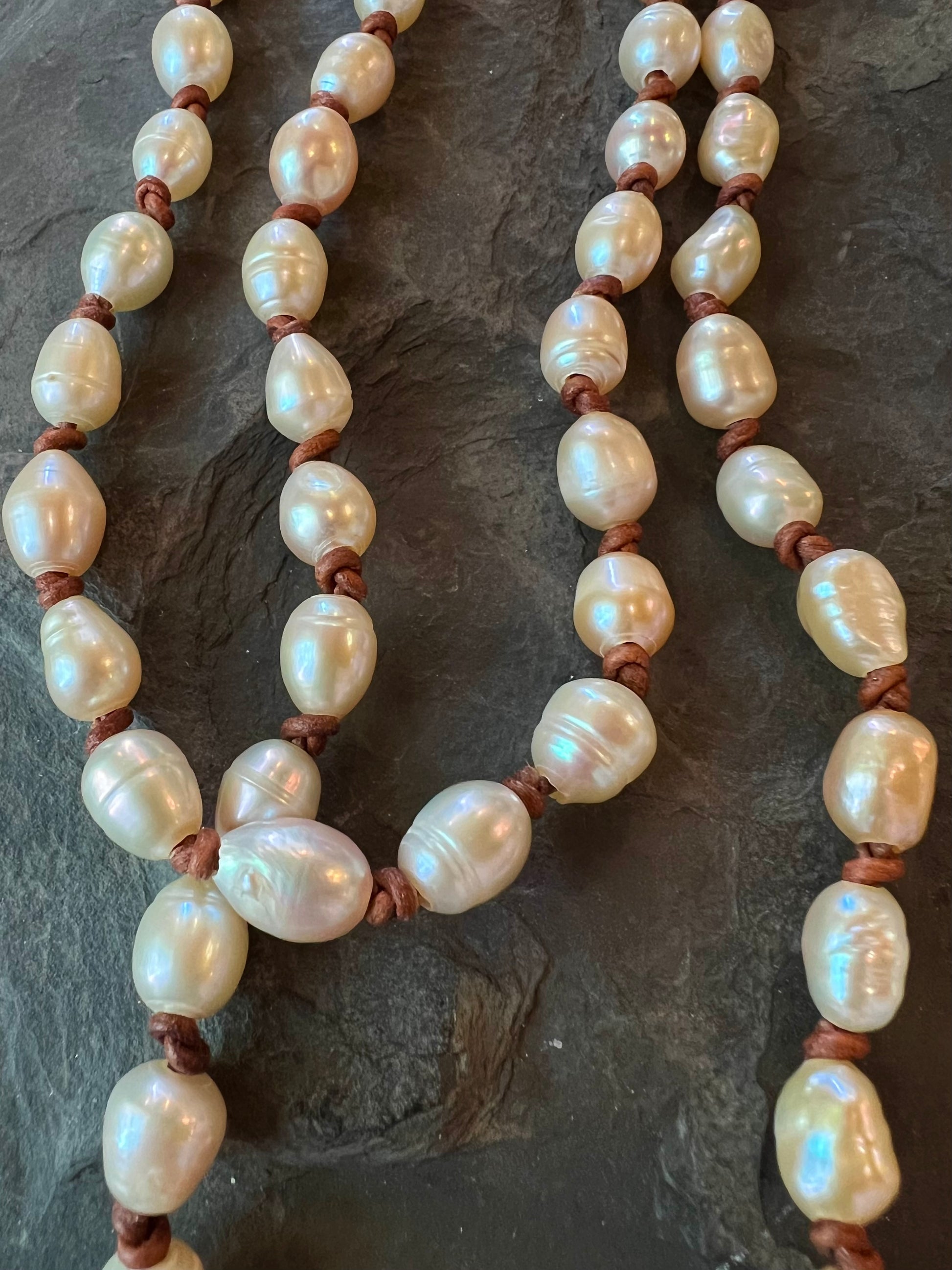 Lucious creamy ringed Freshwater Pearls hand knotted on brown waxed leather cord