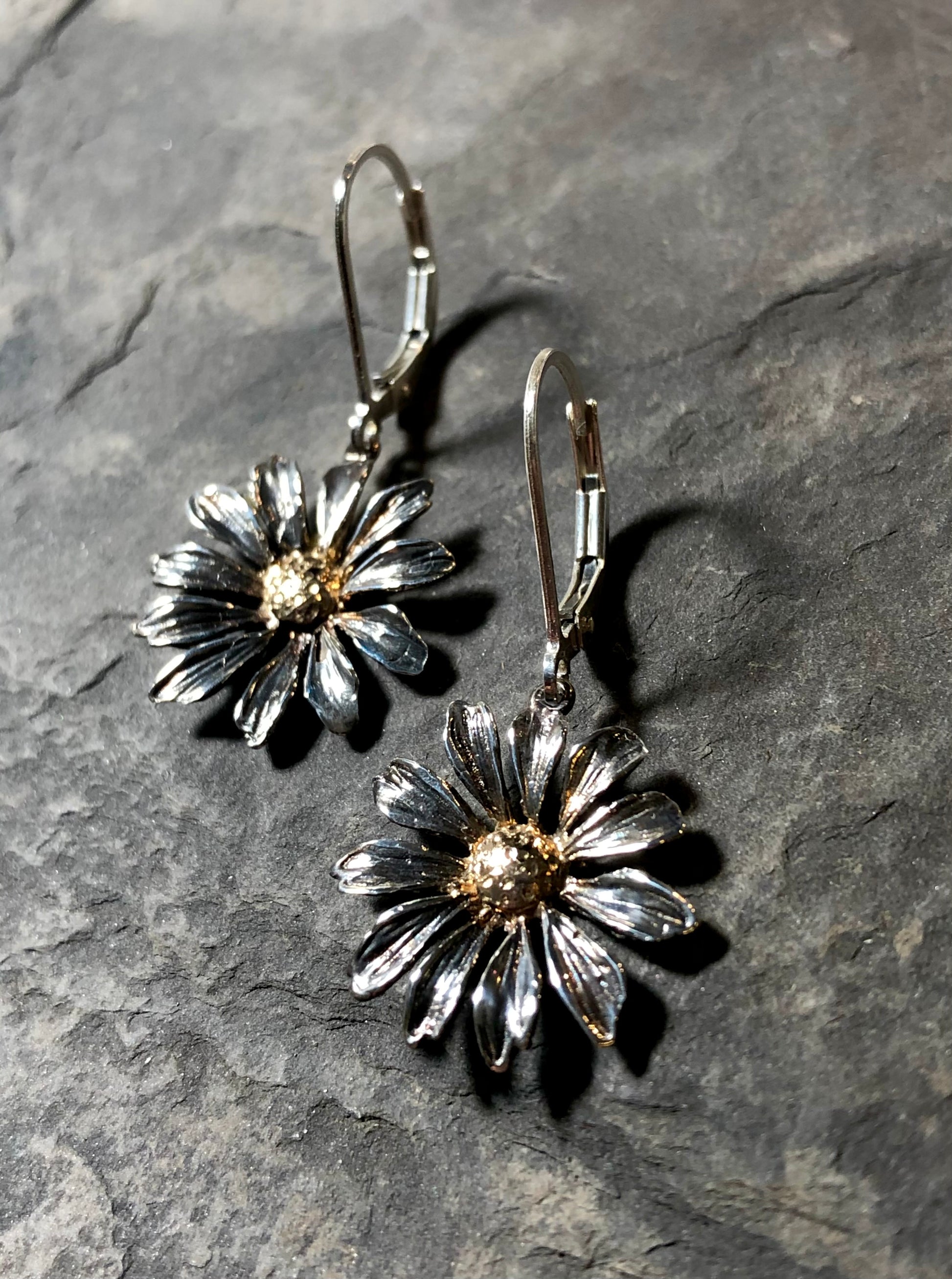 Handcrafted oxidized Sterling Silver & 14K yellow gold daisy on Sterling silver hinged lever back ear wires.