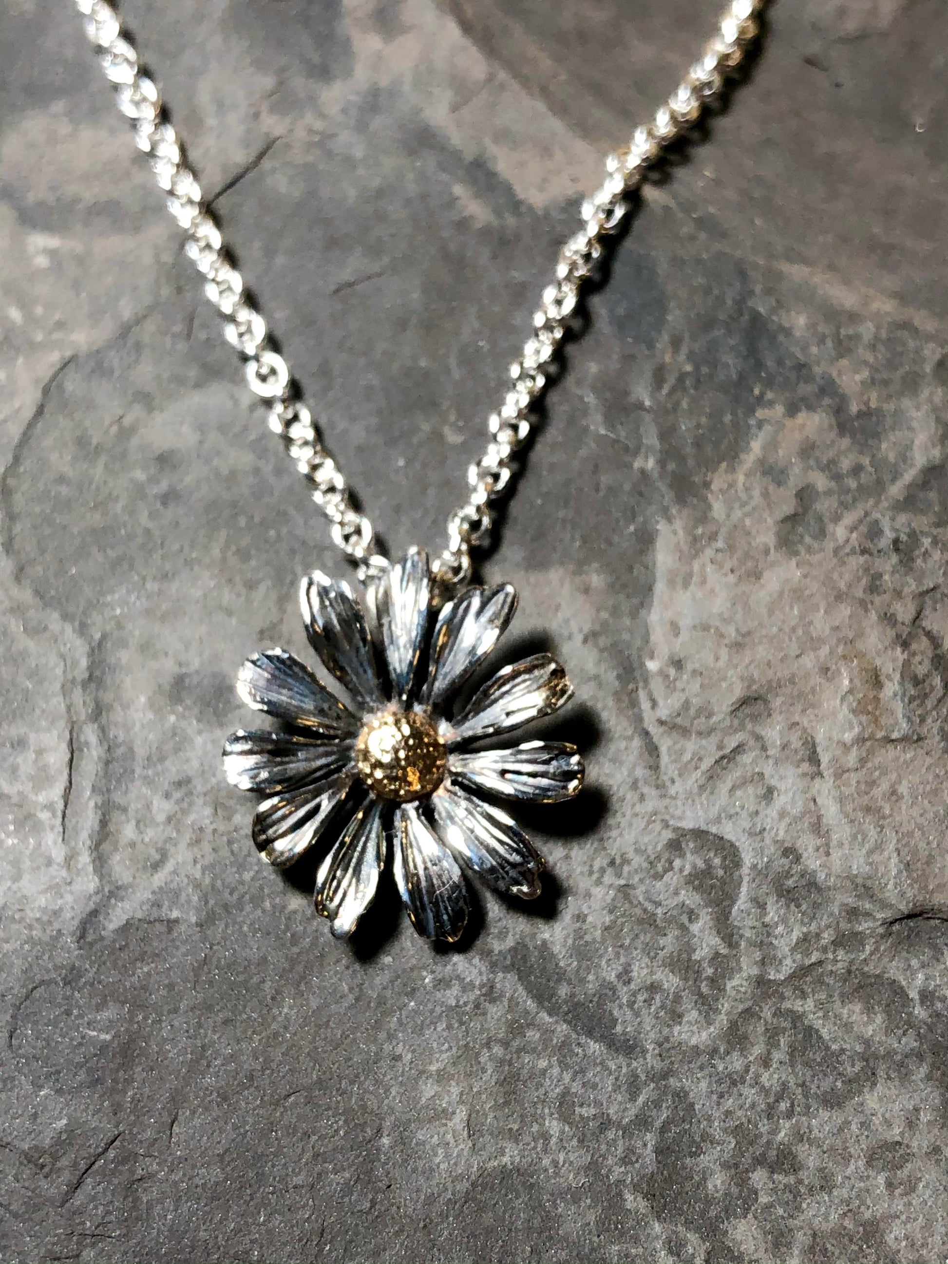 Handcrafted oxidized Sterling Silver & 14K yellow gold daisy pendant on a 16" Sterling silver cable chain (longer chains available by request)