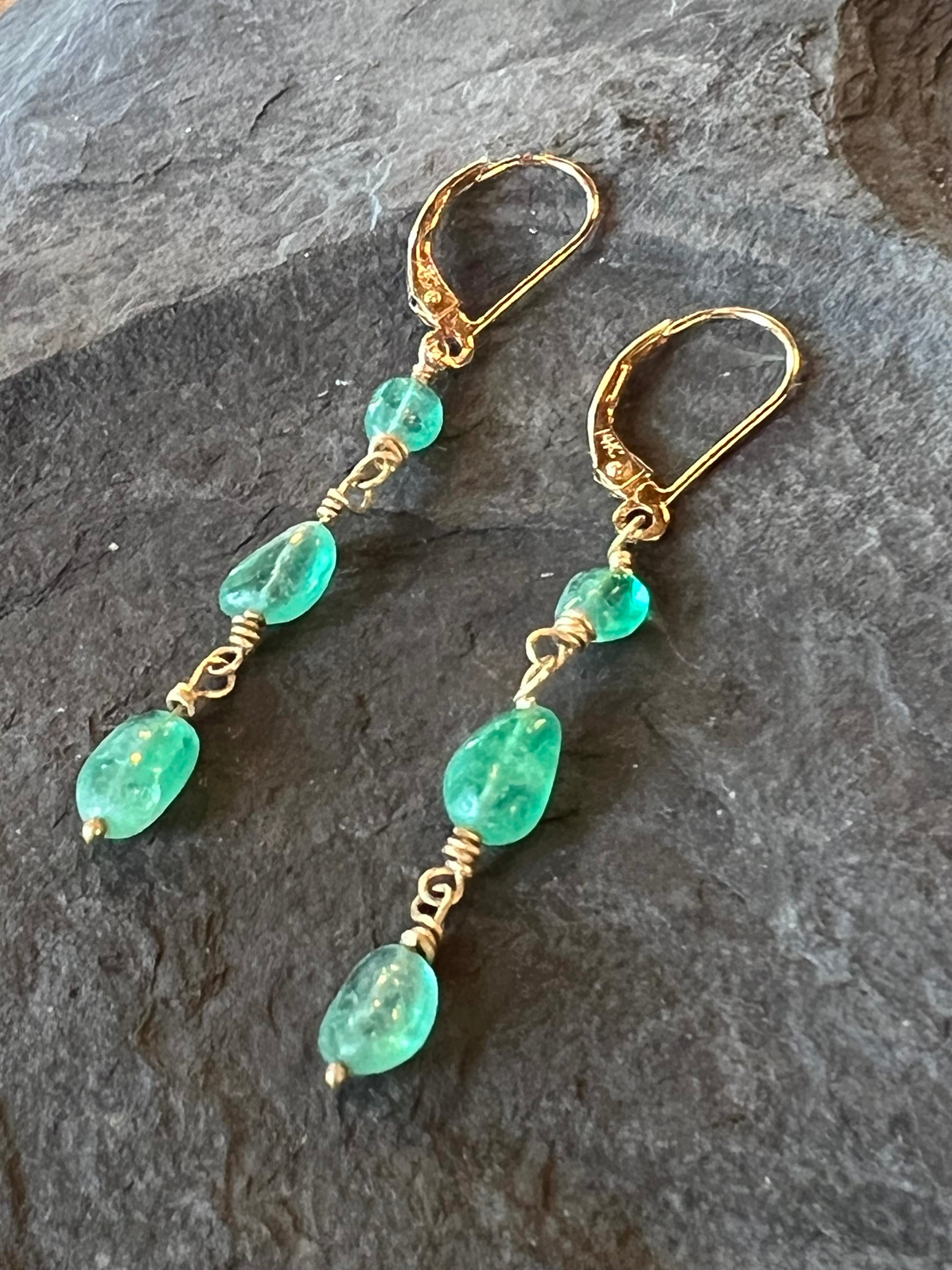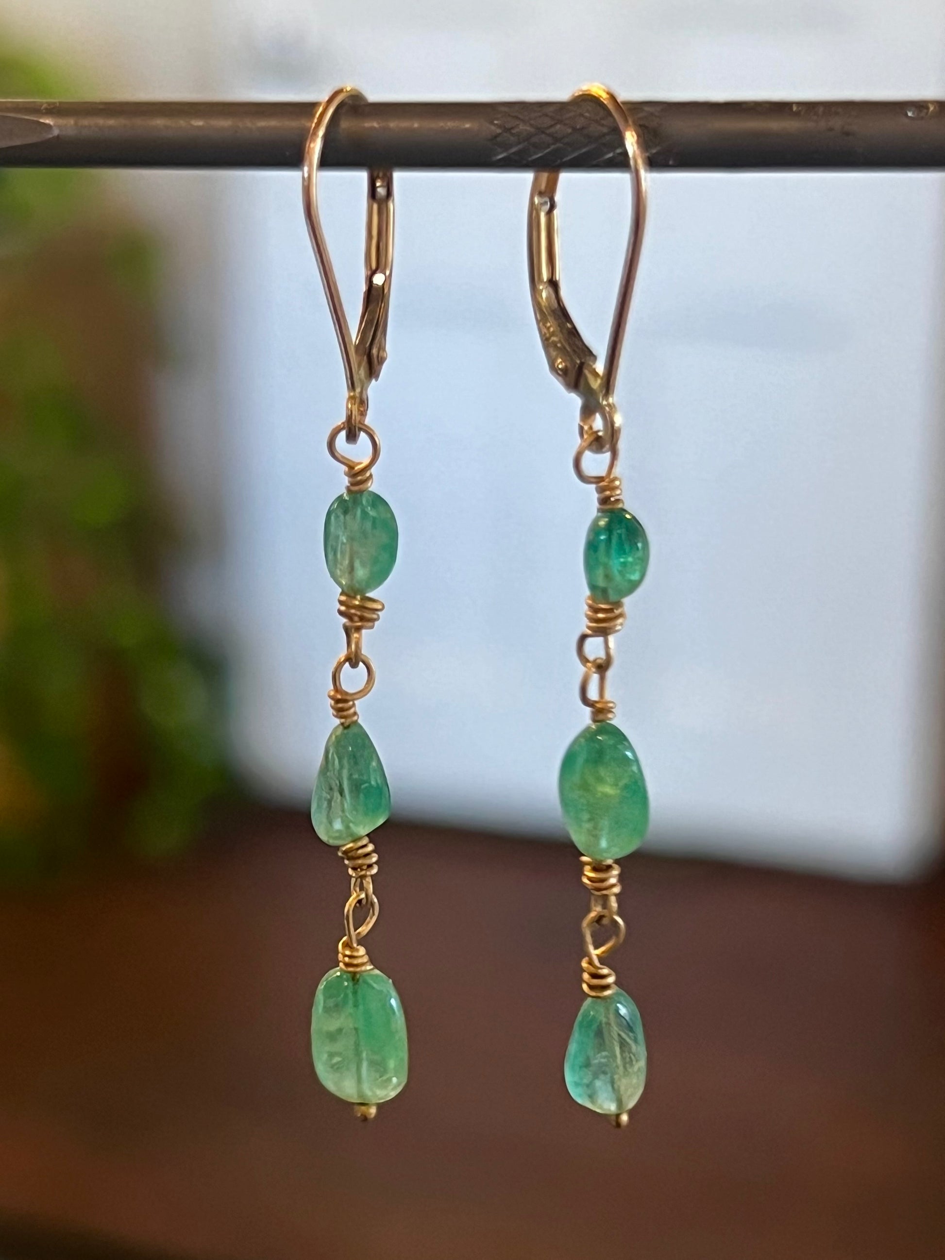 understated simple dangle earring with gorgeous graduated emerald beads on 14K wire with secure hinged Leverback ear wires