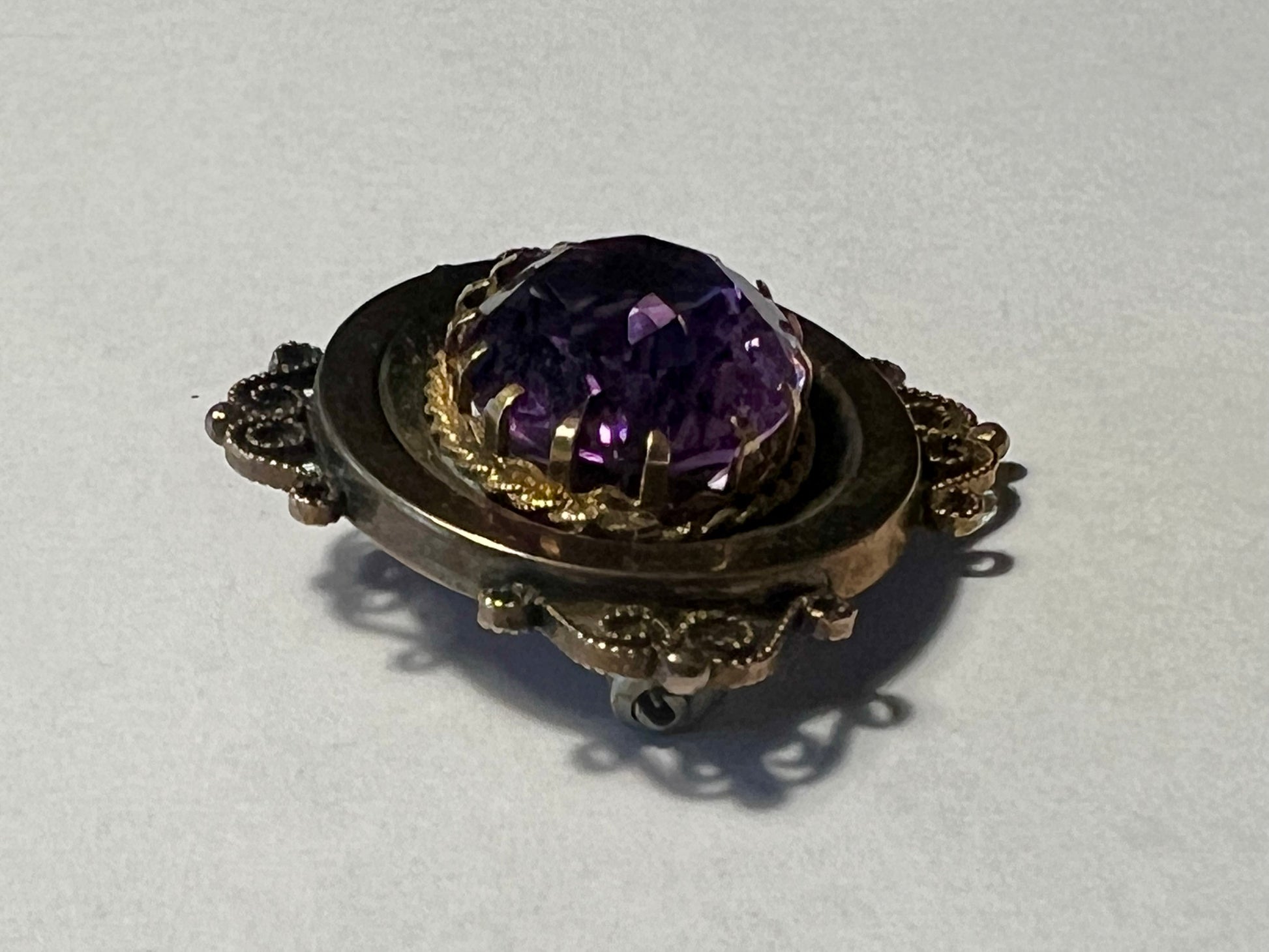 Oval faceted Amethyst in a Victorian filigree 12K yellow gold setting