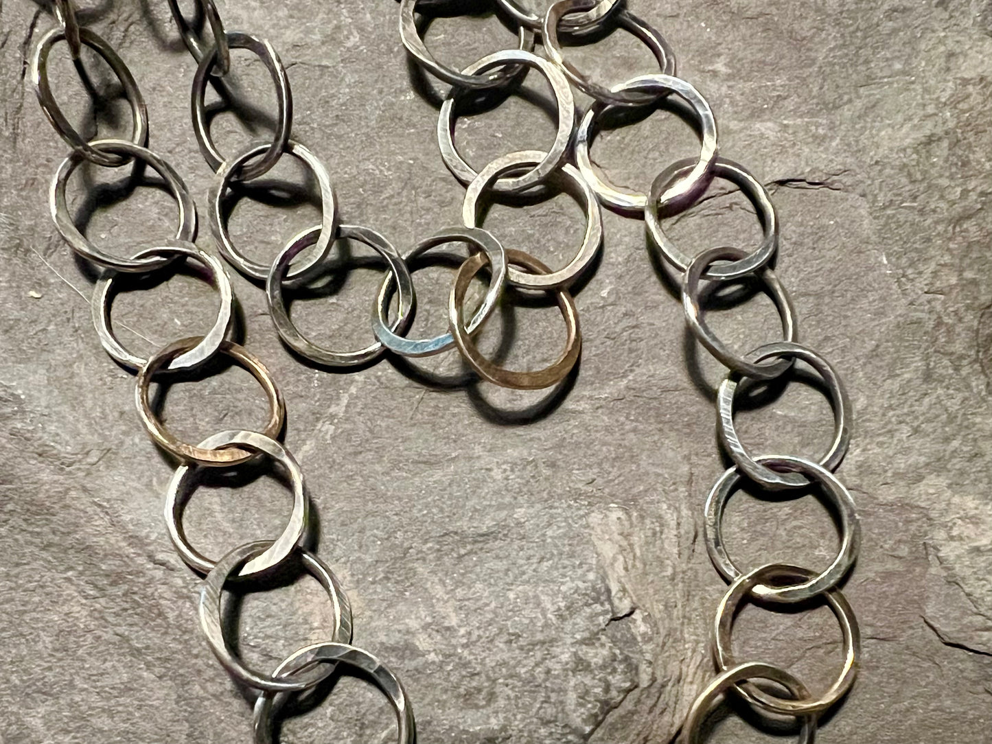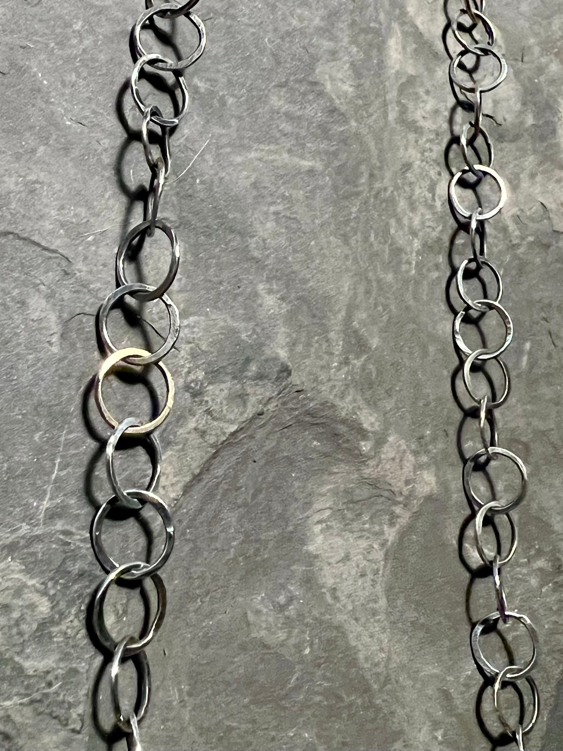 Hand forged Sterling Silver circle links interspersed with hand forged 14K yellow gold links in a 34" oxidized chain