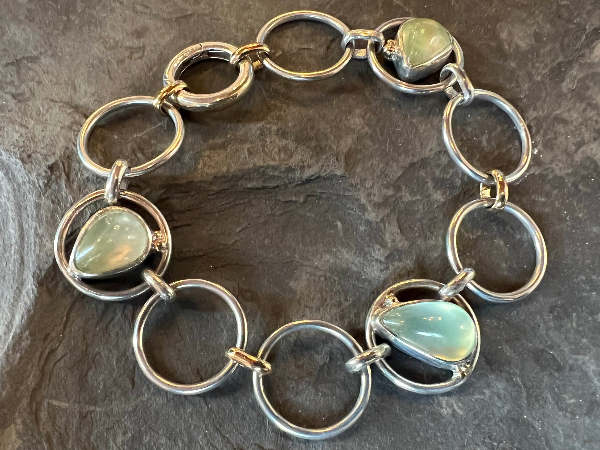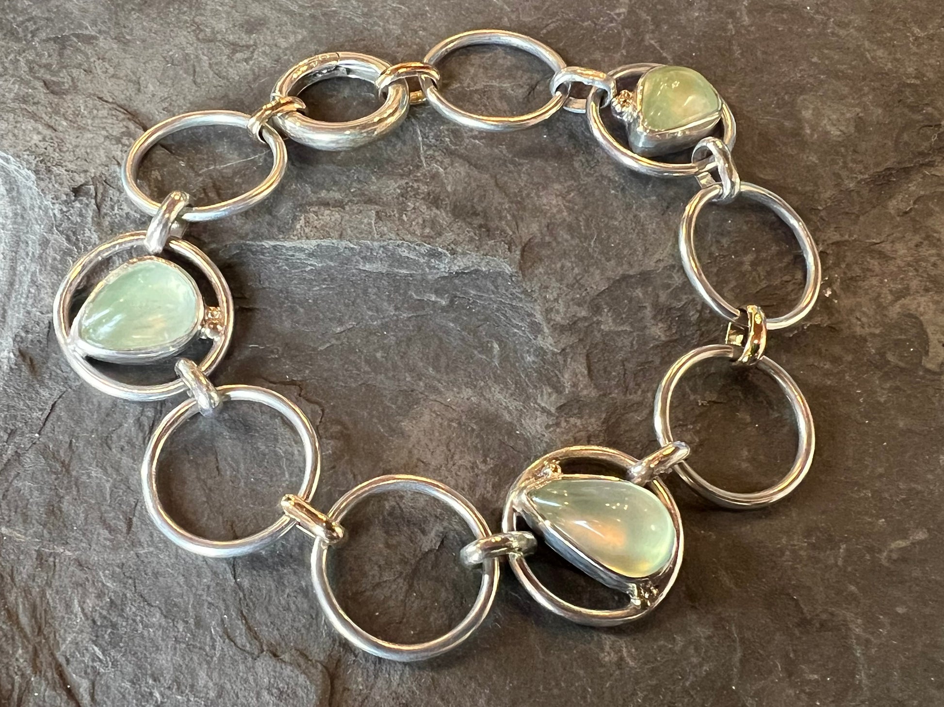 Sterling silver circle links bezel set with pear shaped Prehnite cabochons and 14K yellow gold ball accents. The circle links are joined by 14K yellow gold oval links and a Sterling silver circle clasp
