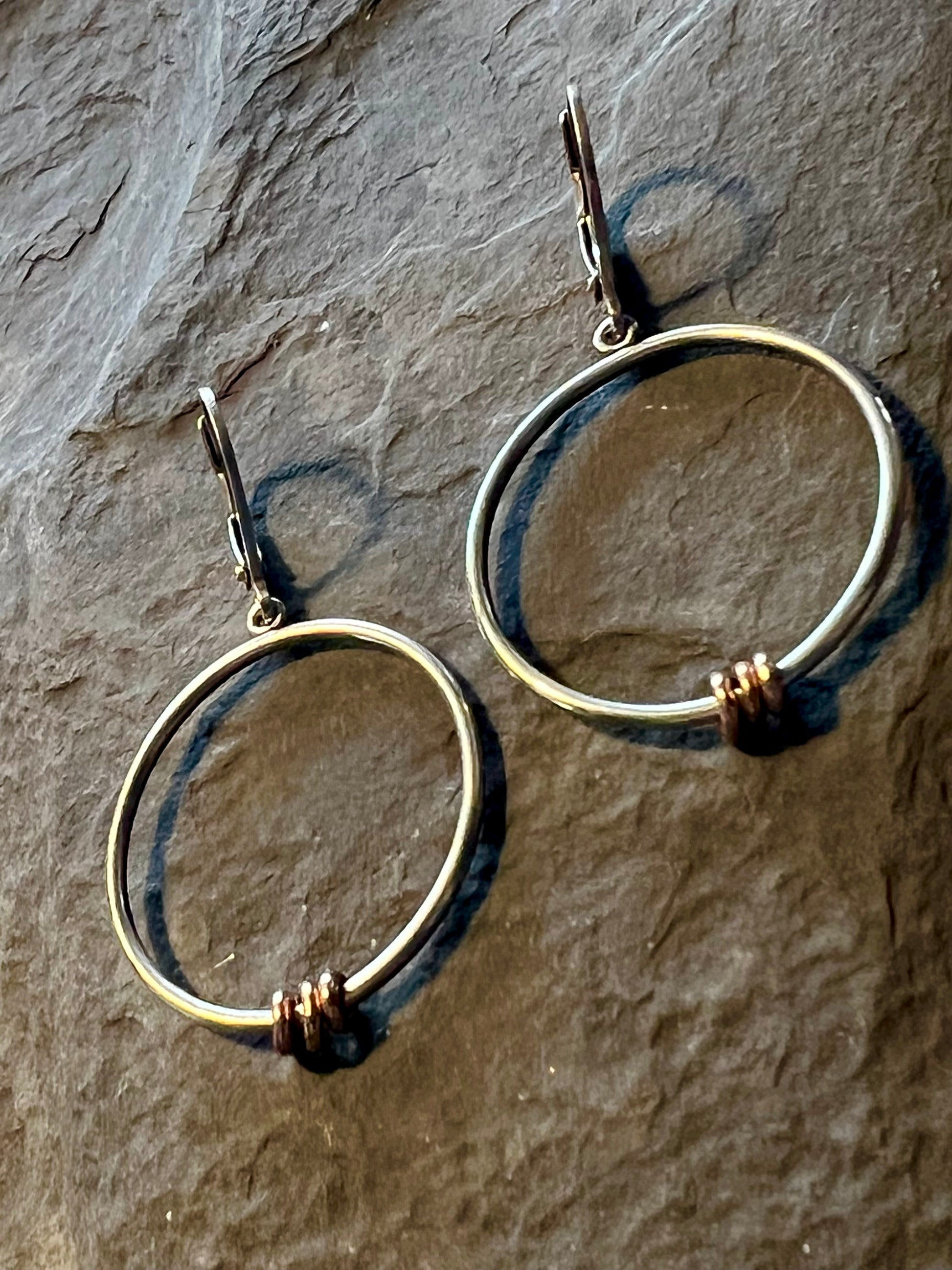 Simple interlaced circles of Sterling silver & 14K rose gold form the horizontal hoop design dangling from Sterling silver hinged lever back ear wires.