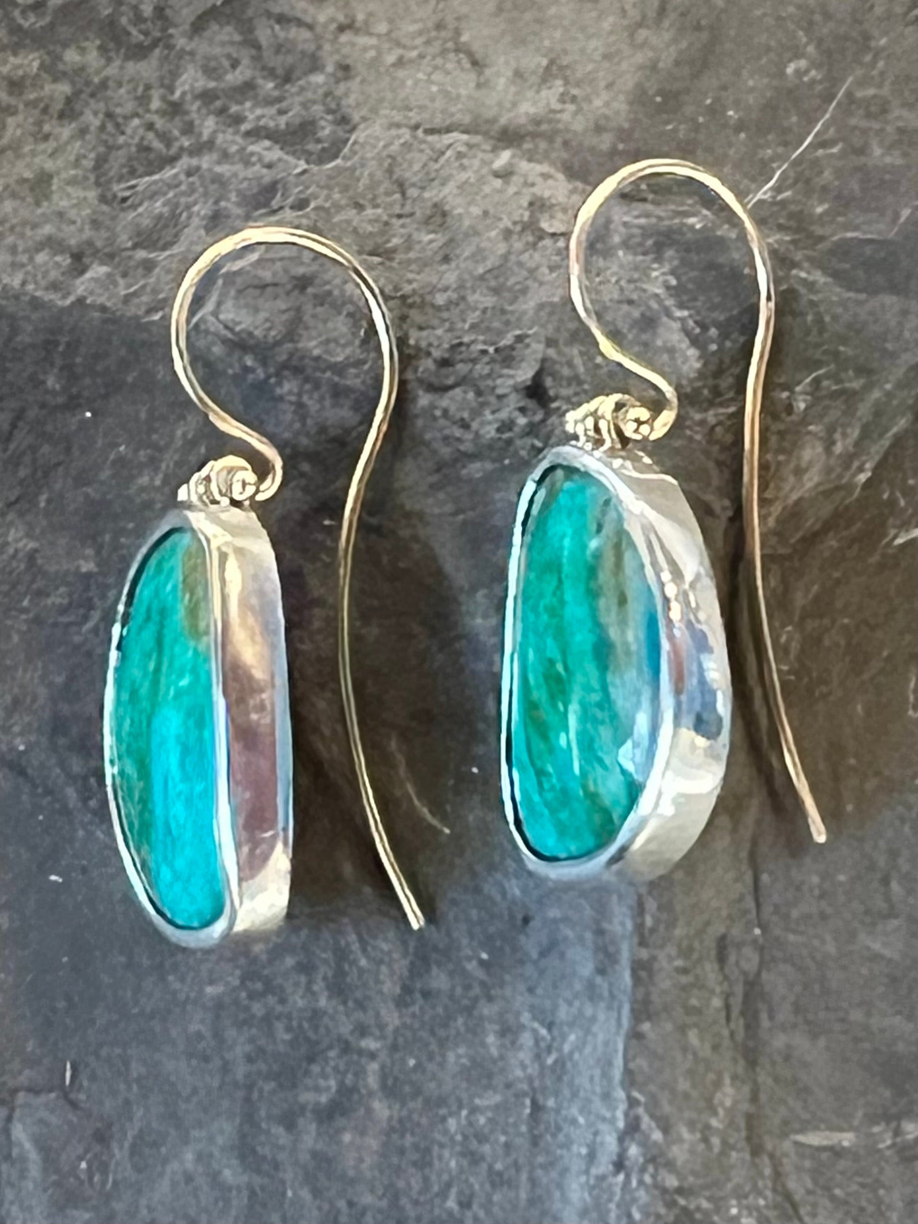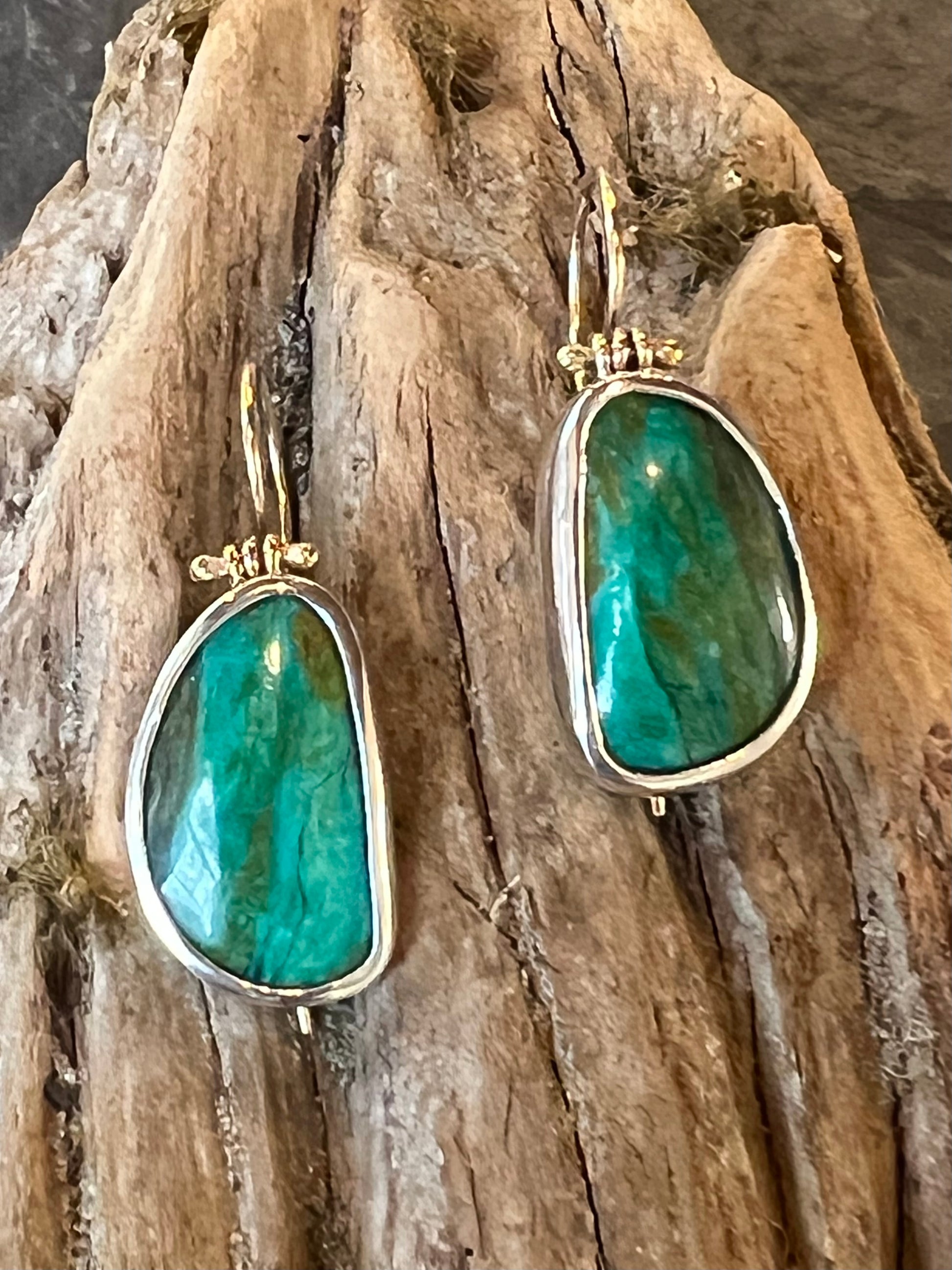 Colorful Peruvian Opal bezel set in Sterling Silver dramatically dangled from a 14K yellow gold hinged ear wire
