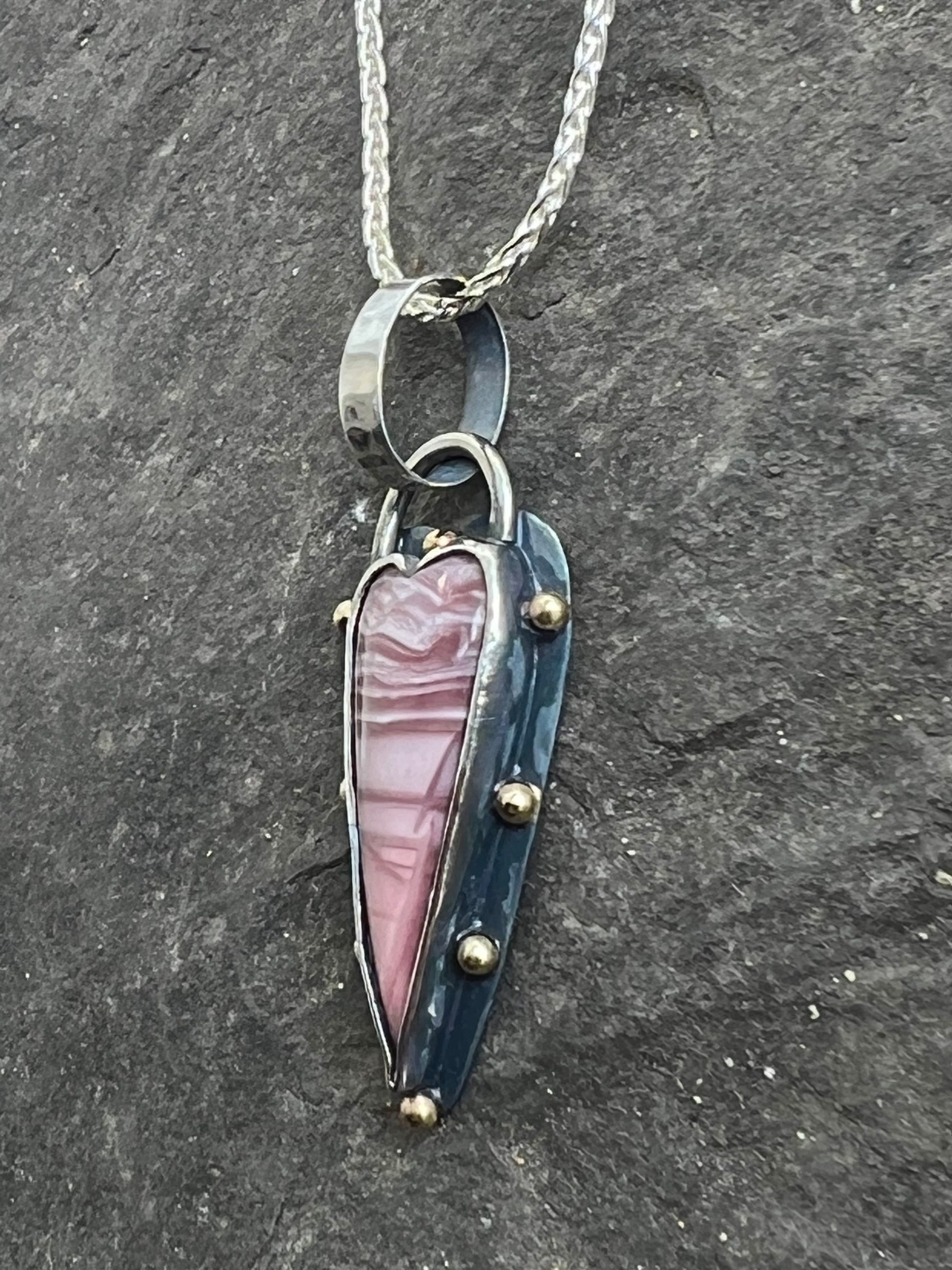 Delicate muted shades of pink and burgundy, Imperial Pink Agate set in Sterling silver with 14K yellow gold accents on a solid Sterling silver wheat chain