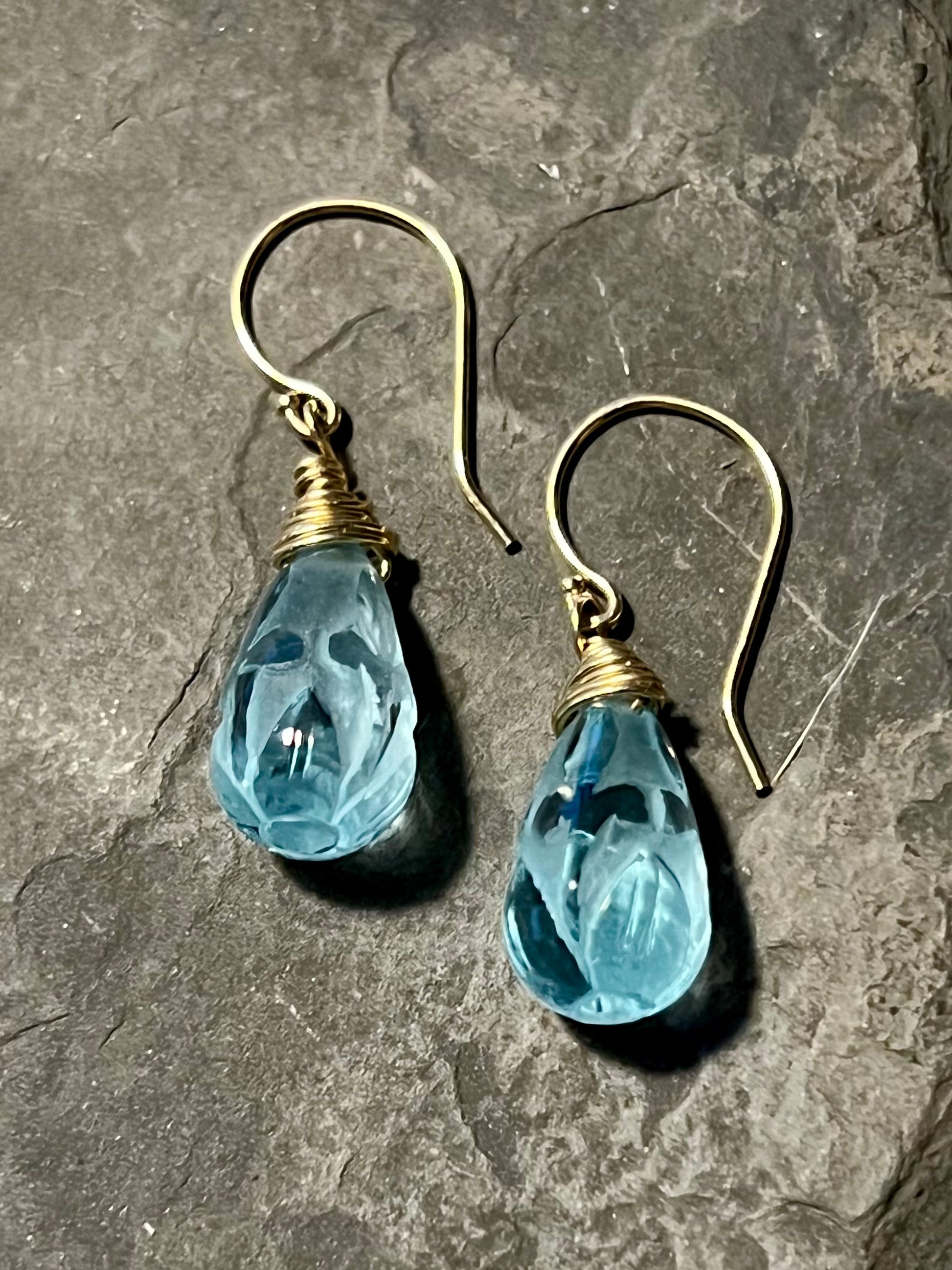 Hand carved Iris on blue topaz with 14K wire wrapped cap and French ear wire