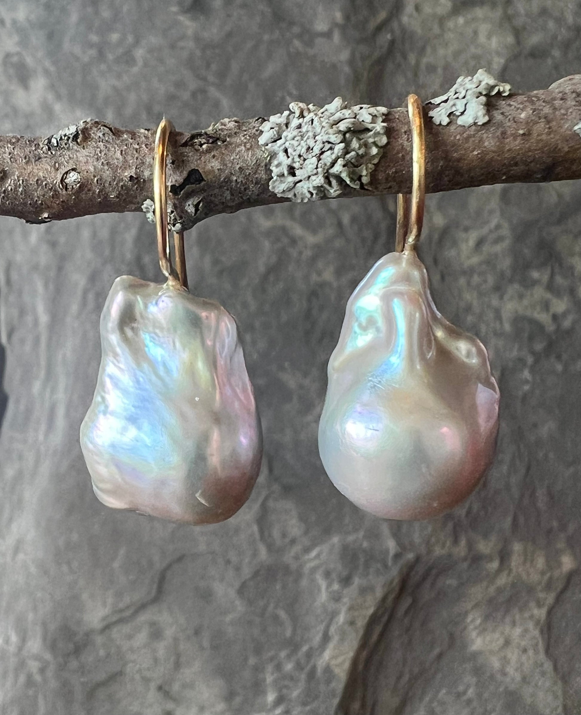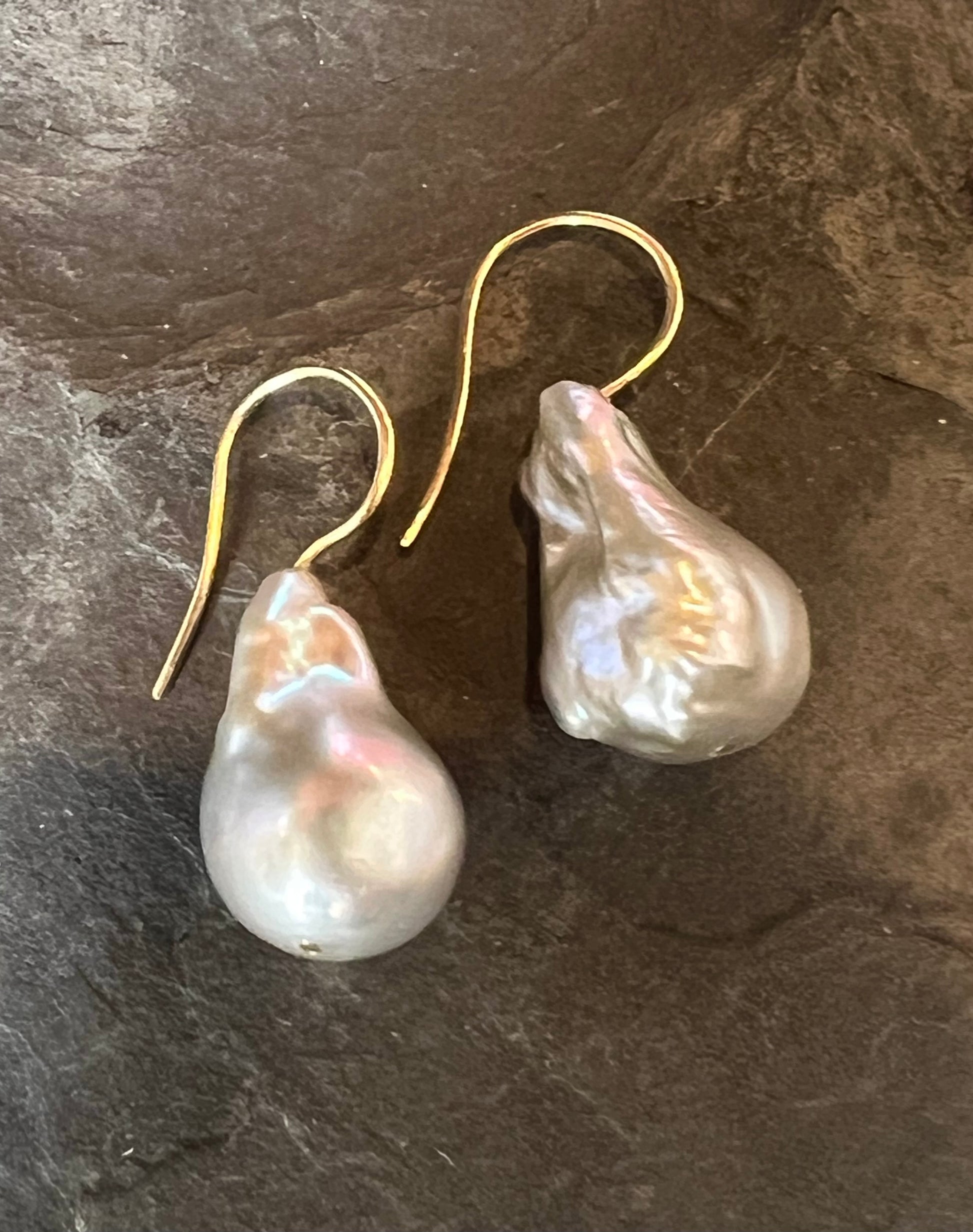 Gorgeous blue gray flame ball baroque pearls (approx 18 mm x 12 mm) on 14K yellow gold ear wires