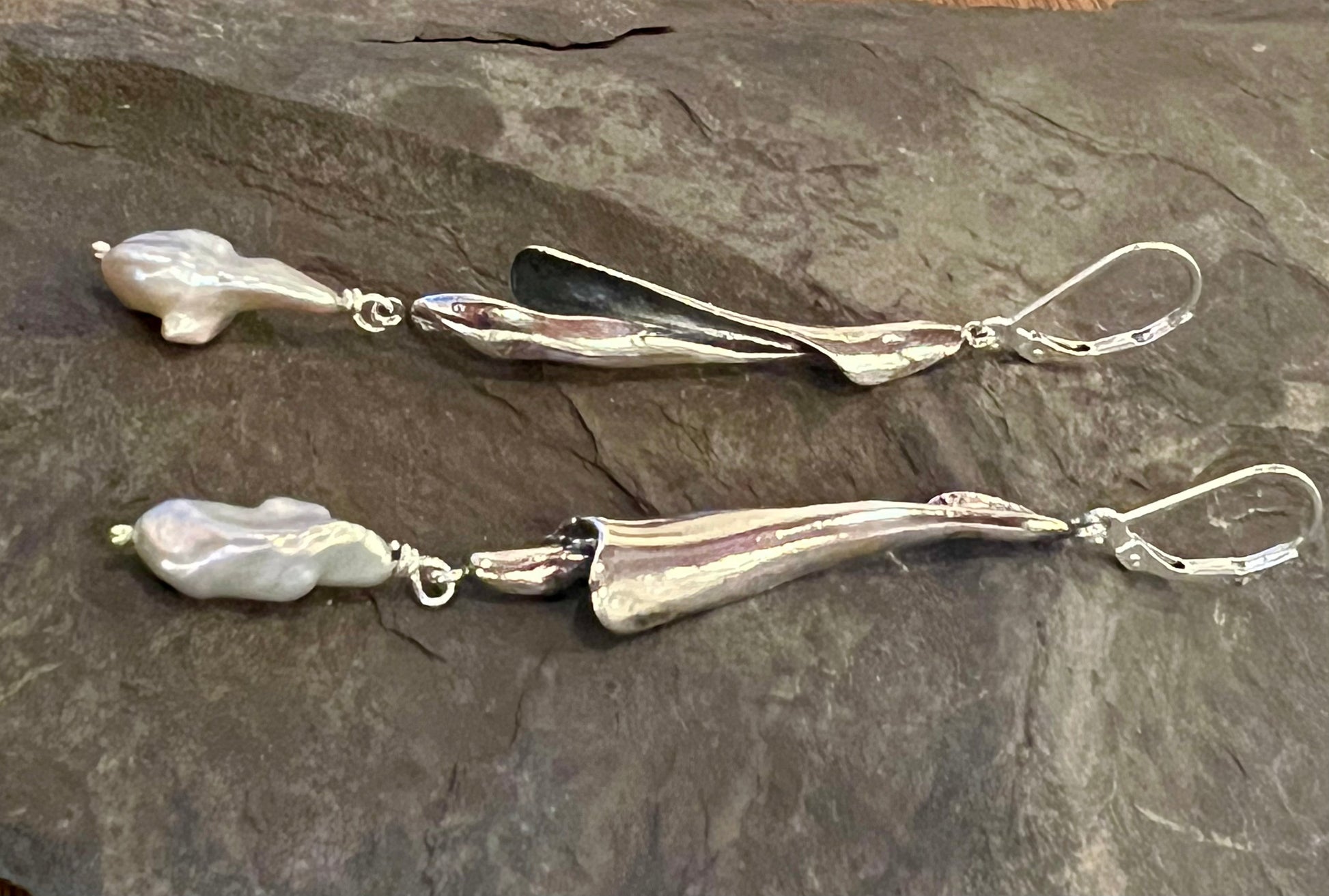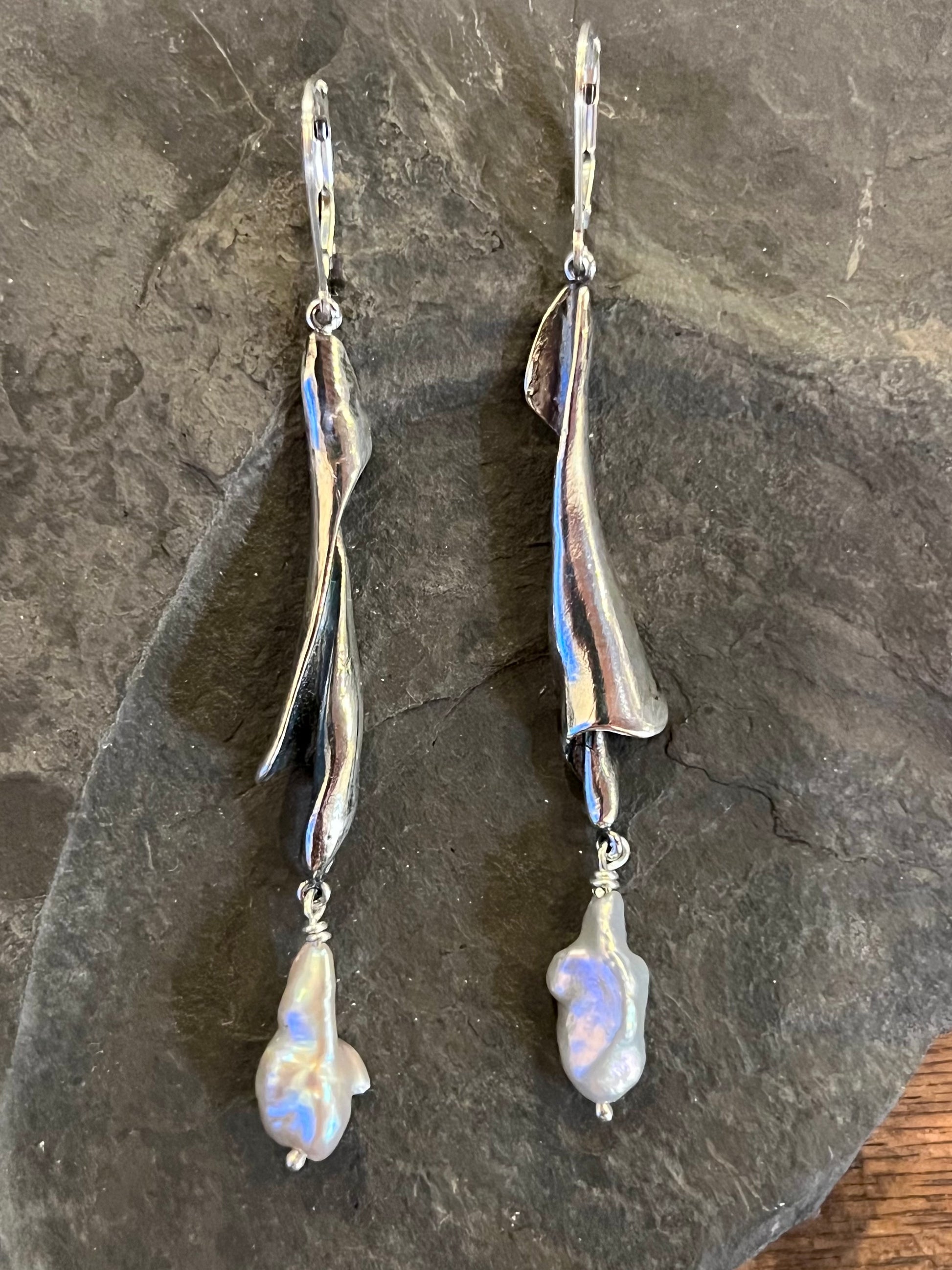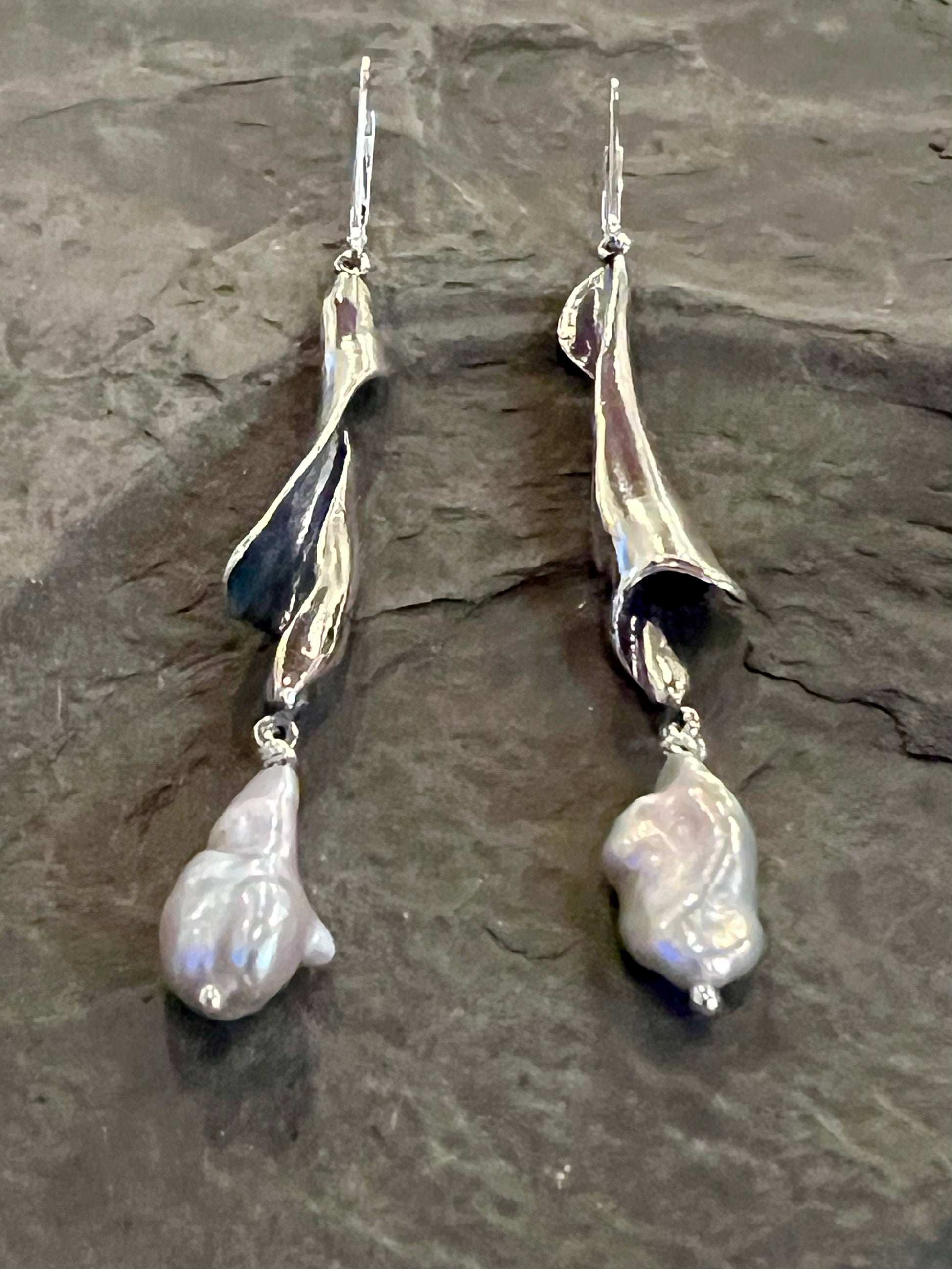 Elongated water worn shell spiral found along the Gulf of Mexico cast in solid sterling silver and oxidized to emphasize the graceful spiral, accented with high luster freshwater Keshi pearls