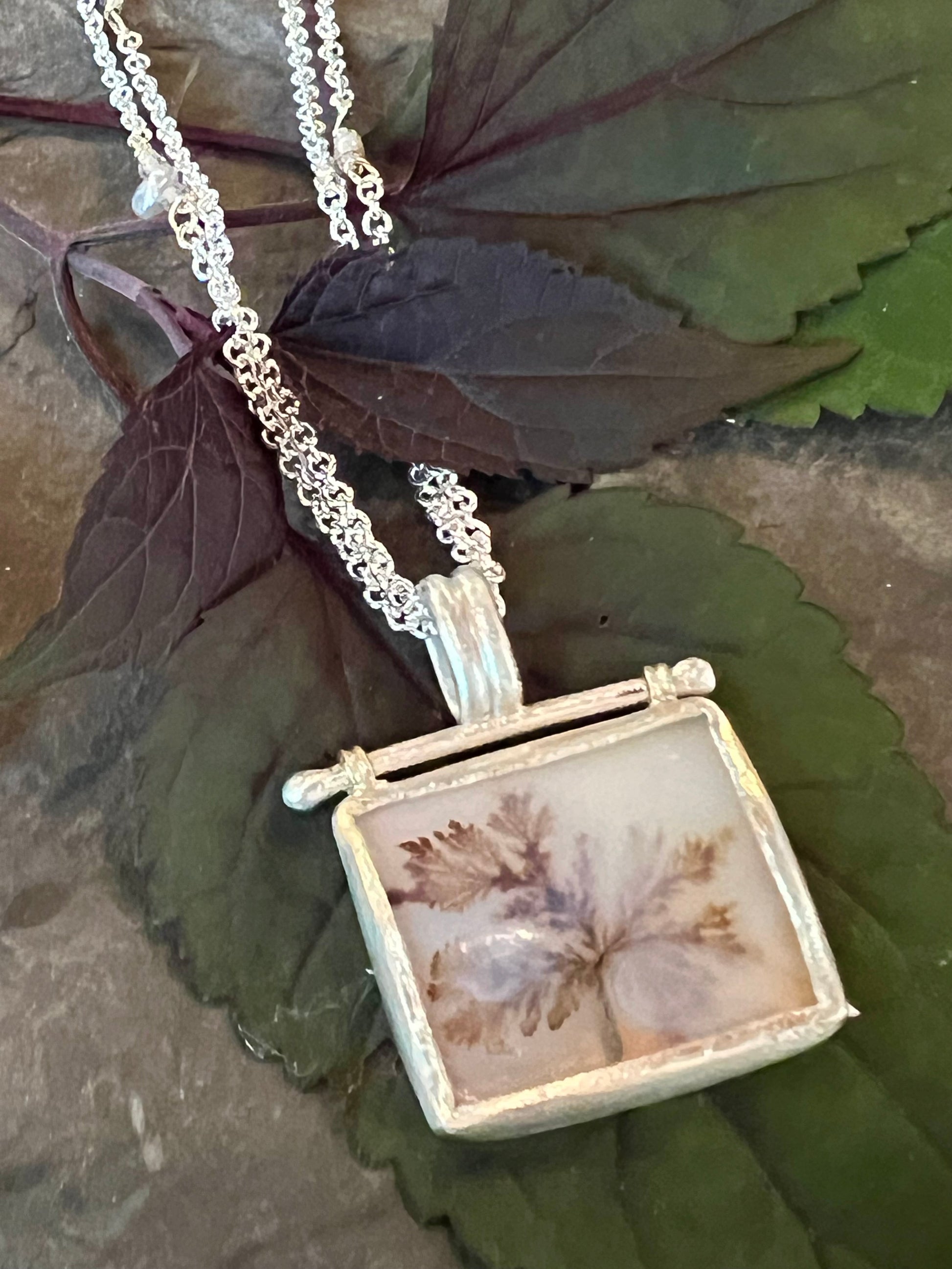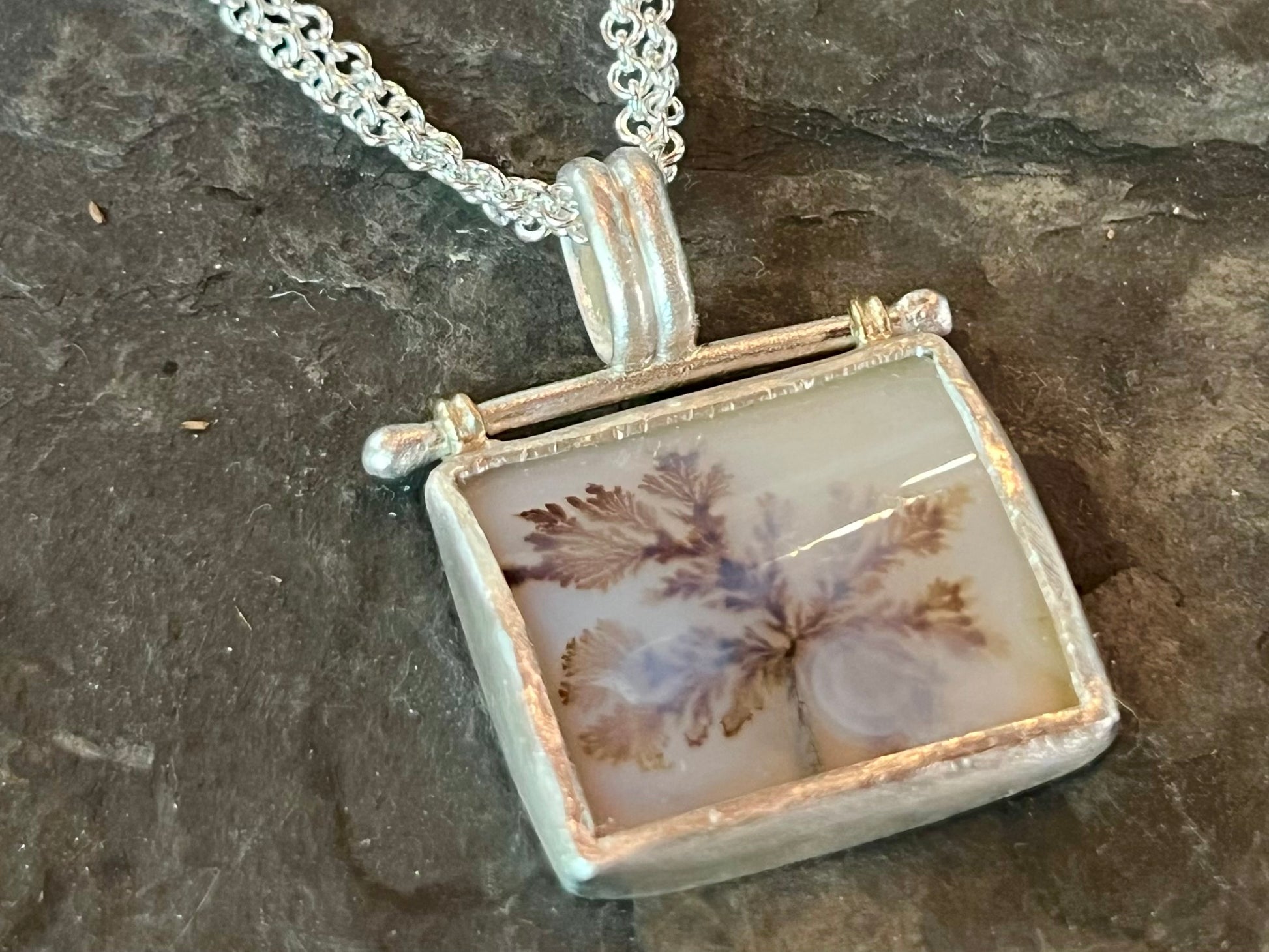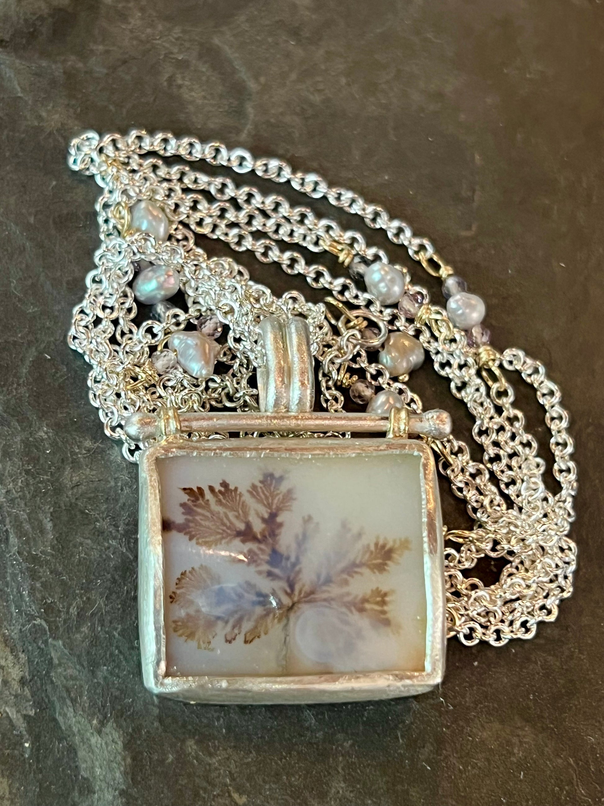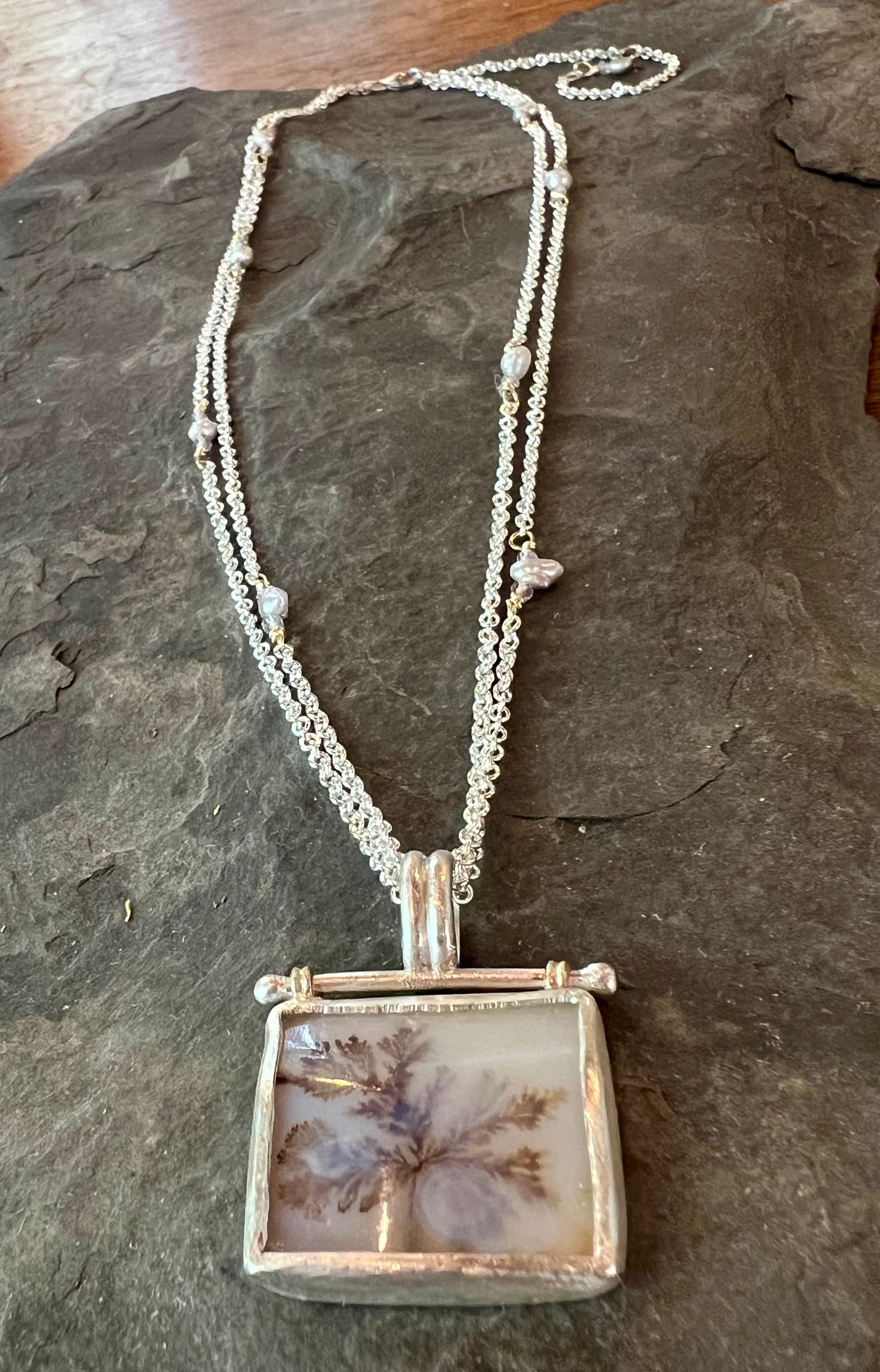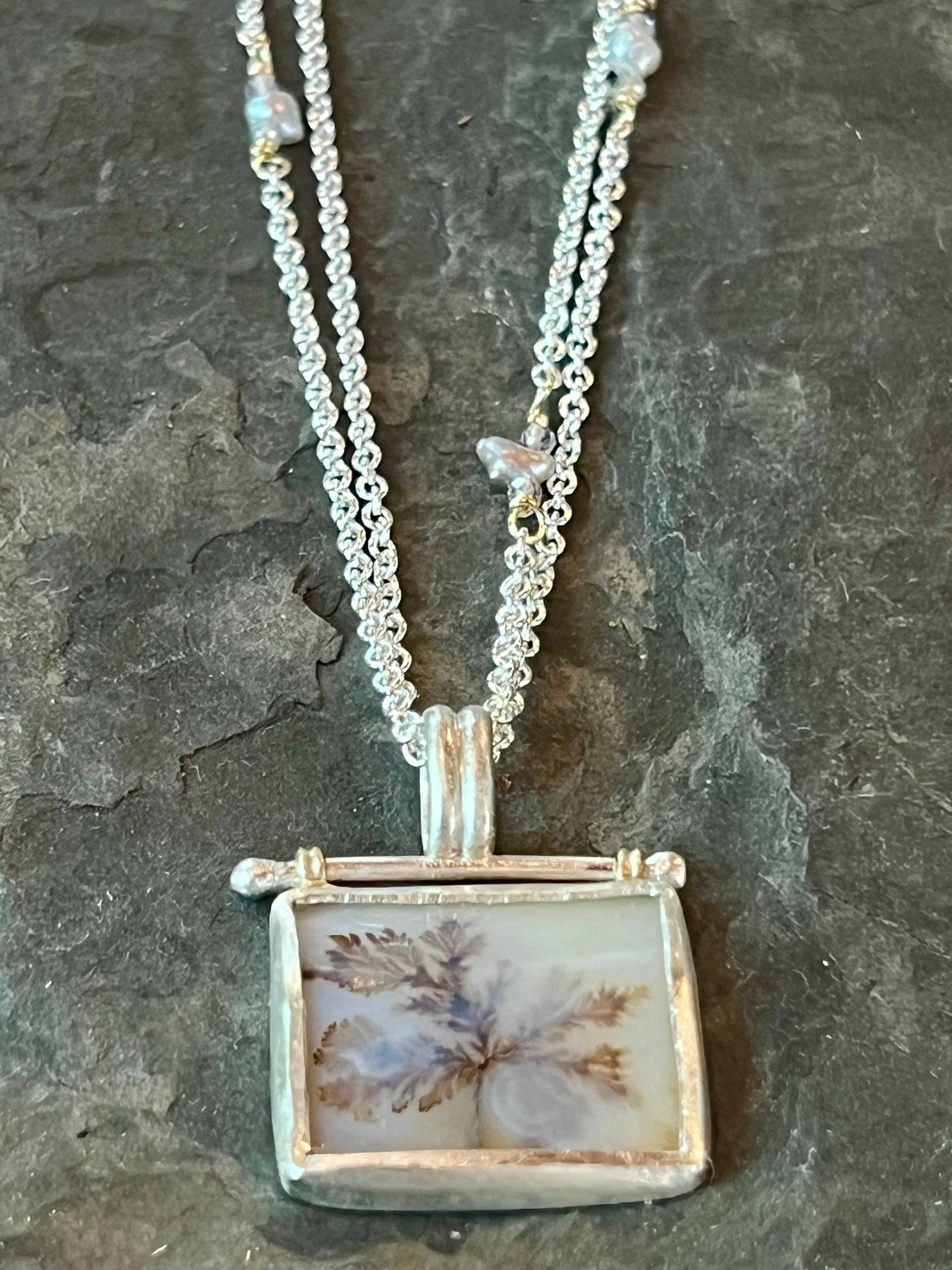 Tapestry Pendant bezel set with an amazing Dendritic Agate (From India) on a double cable chain with lobster clasp, and Lavender Spinel & Freshwater Pearl 14K yellow gold embellishments.