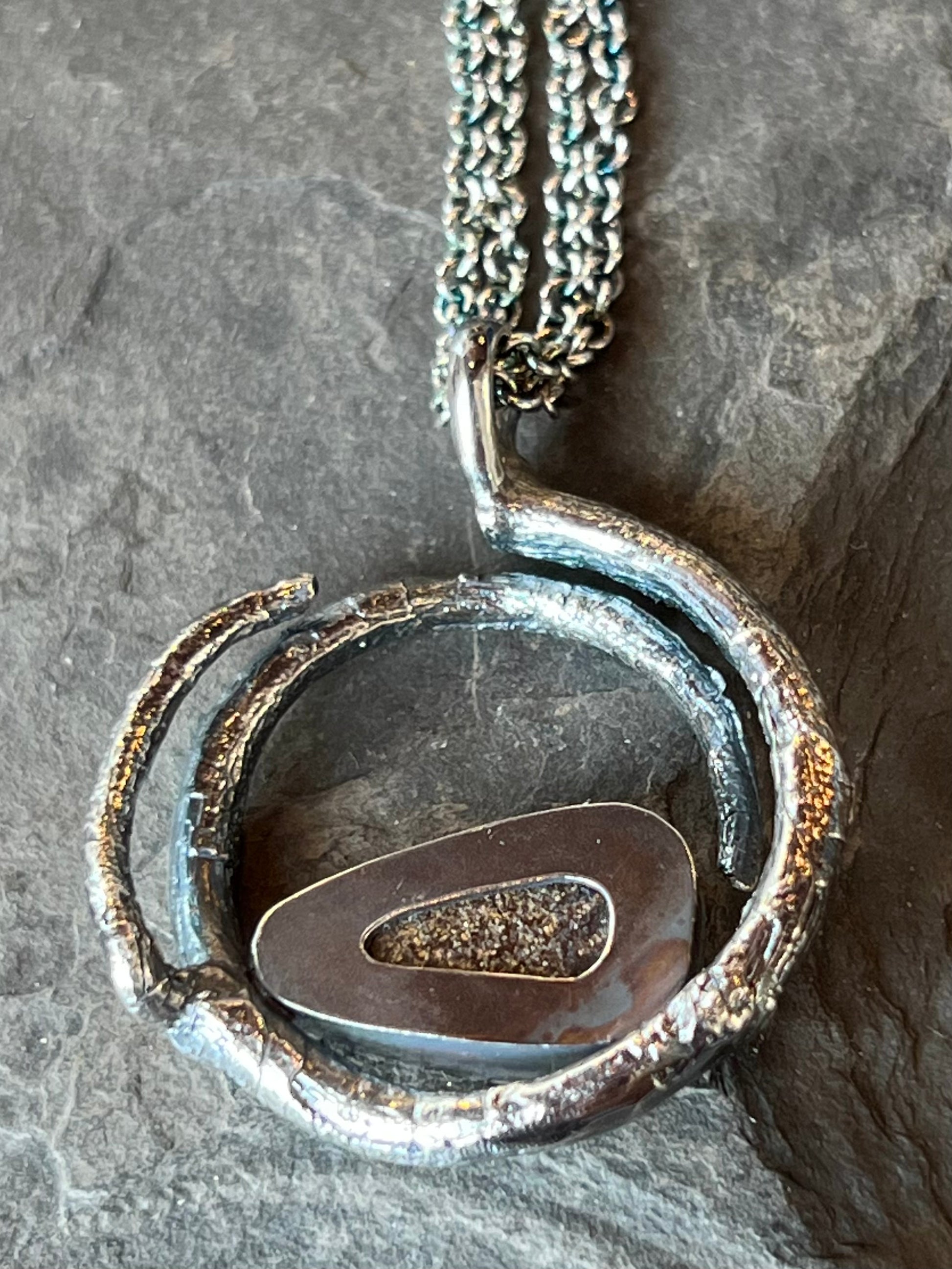 This one of a kind pendant is on a 16” Sterling double cable chain with a lobster clasp and 2.5” extender
