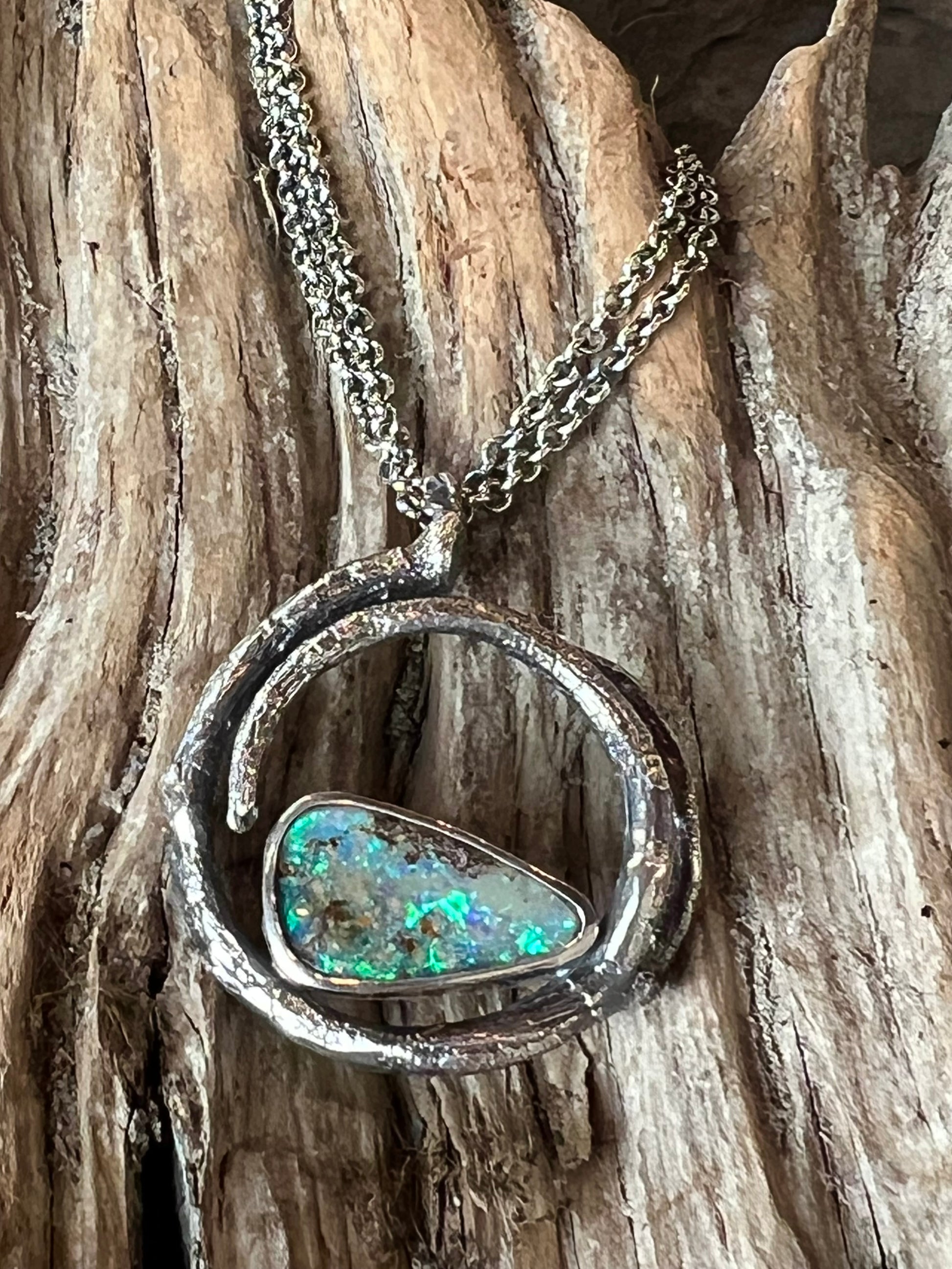 Water worn grape vine tendril in an amazing Mother Earth shape found along the shore of Cayuga Lake cast in solid sterling and oxidized to enhance all the organic detail and bezel set with an Australian Boulder Opal.