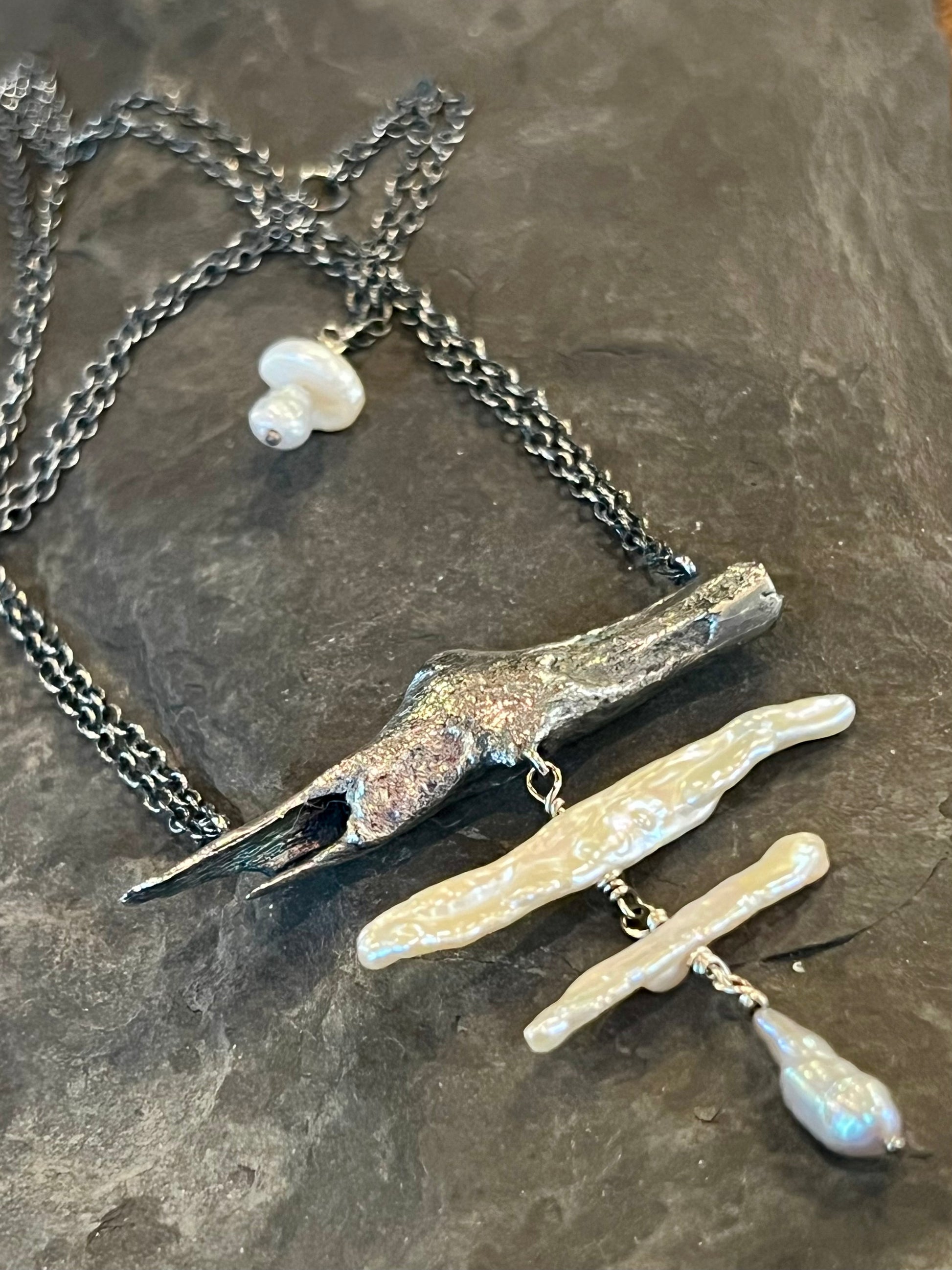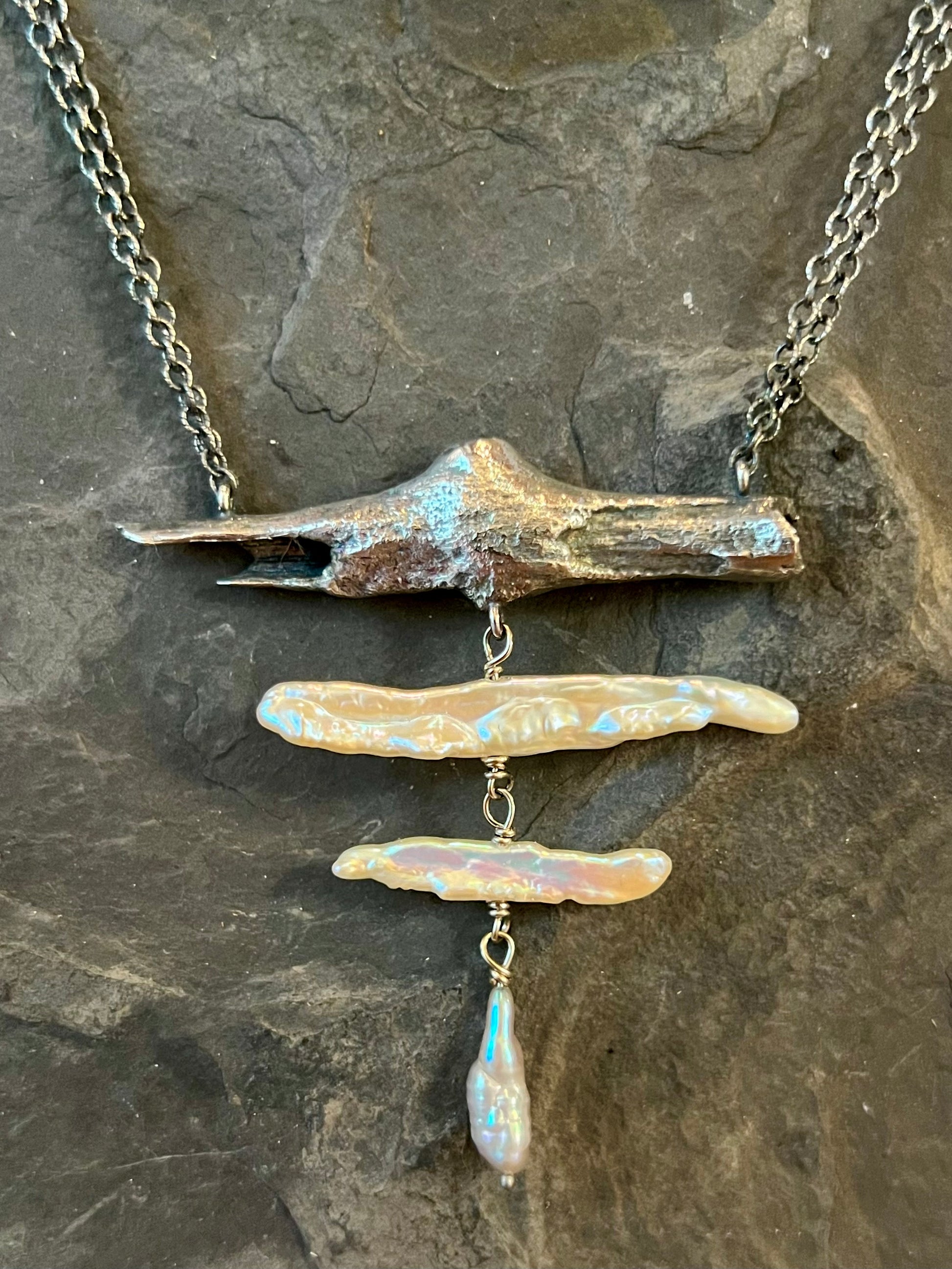 Oxidized Sterling Silver Driftwood & Iridescent Pearl Necklace - Cayuga Collection