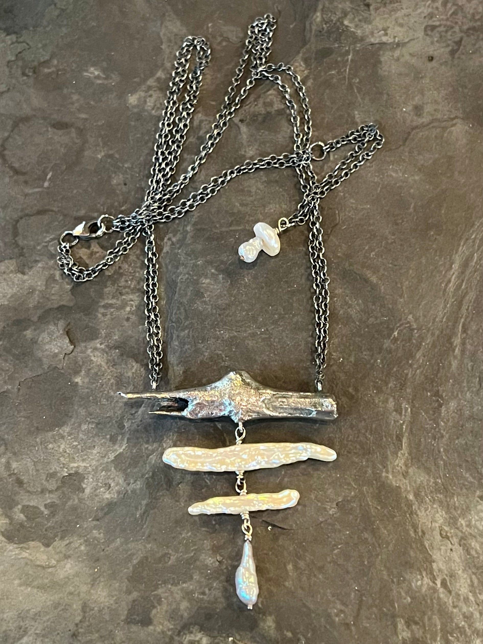 Oxidized Sterling silver with iridescent white & gray Keshi Pearls on a double oval cable chain which is adjustable 16”-20” ( total length with driftwood and pearls 18”-22”)