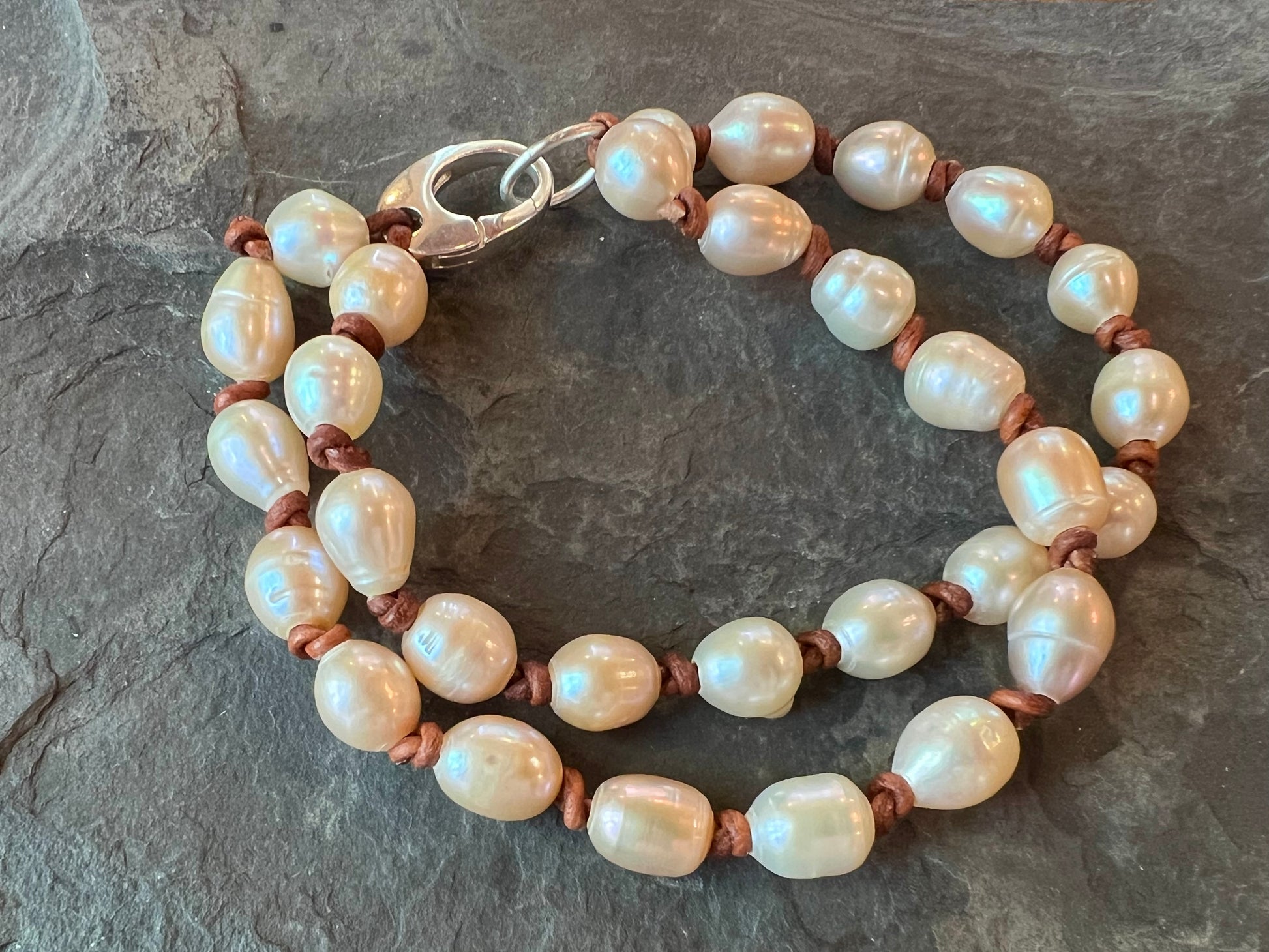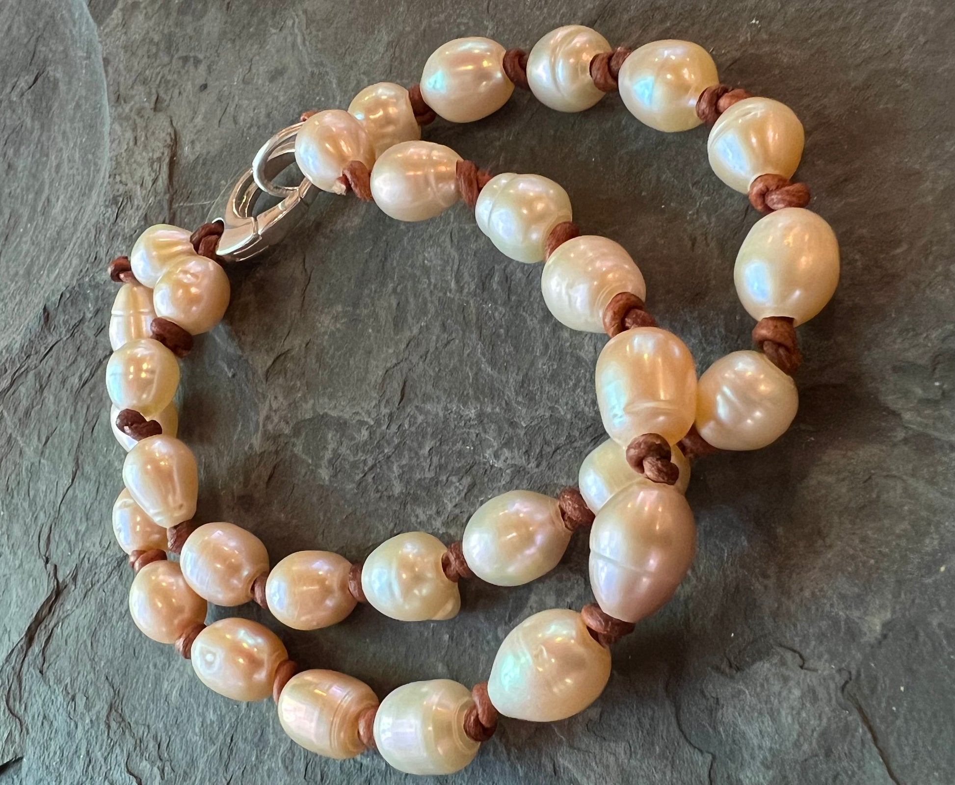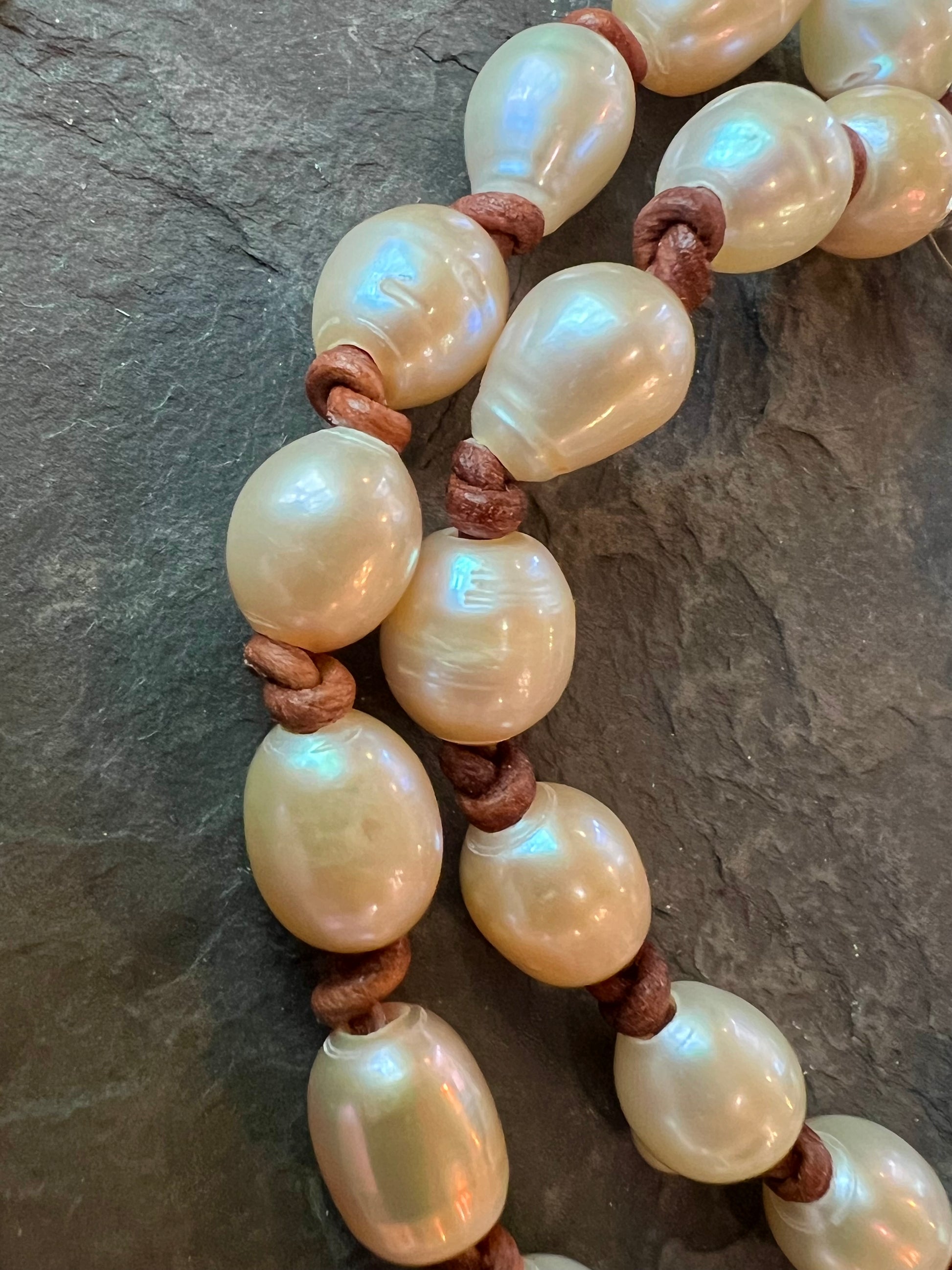 Peachy Freshwater Ring Pearls hand knotted on waxed brown leather cord with large sterling lobster clasp