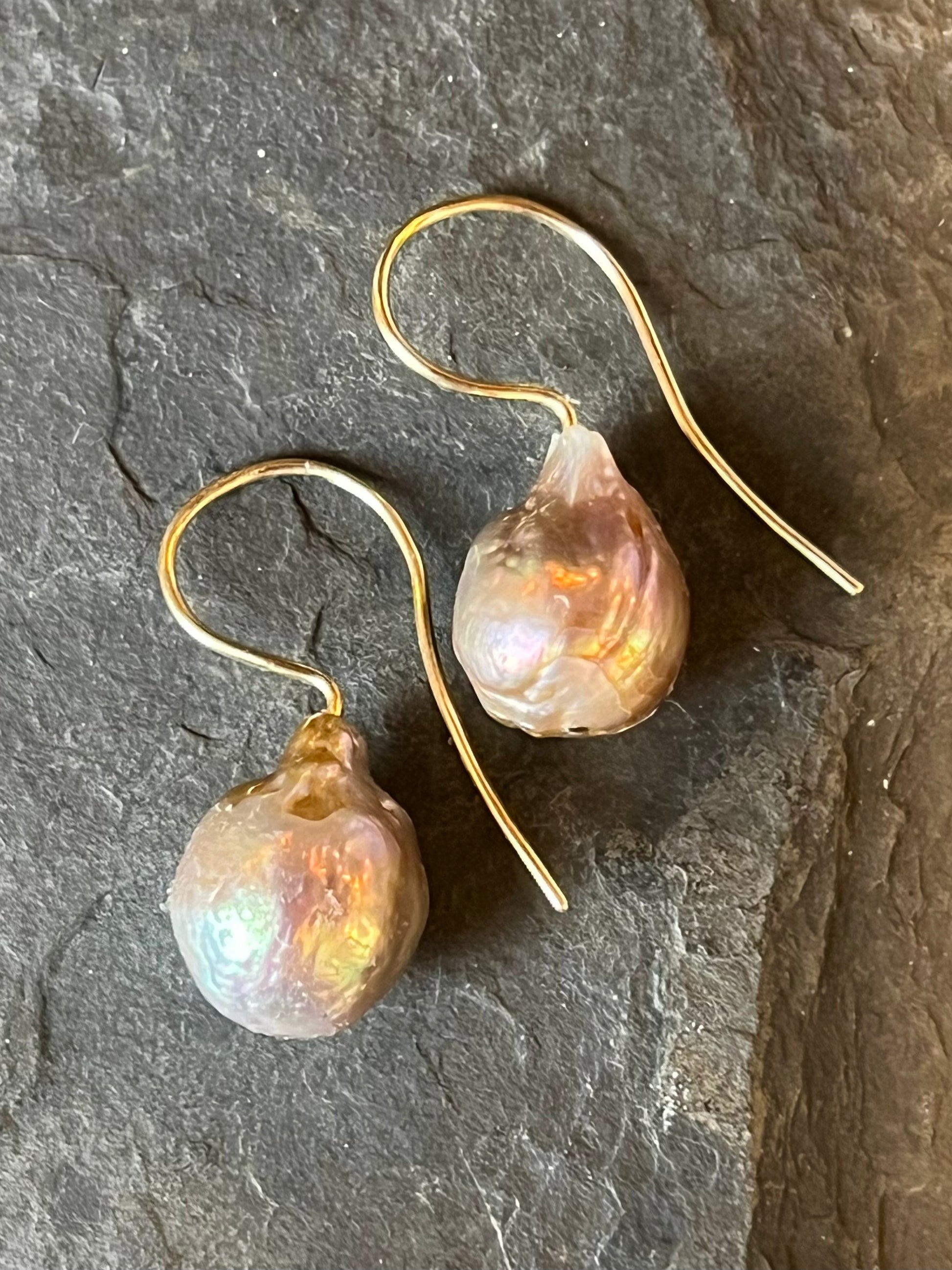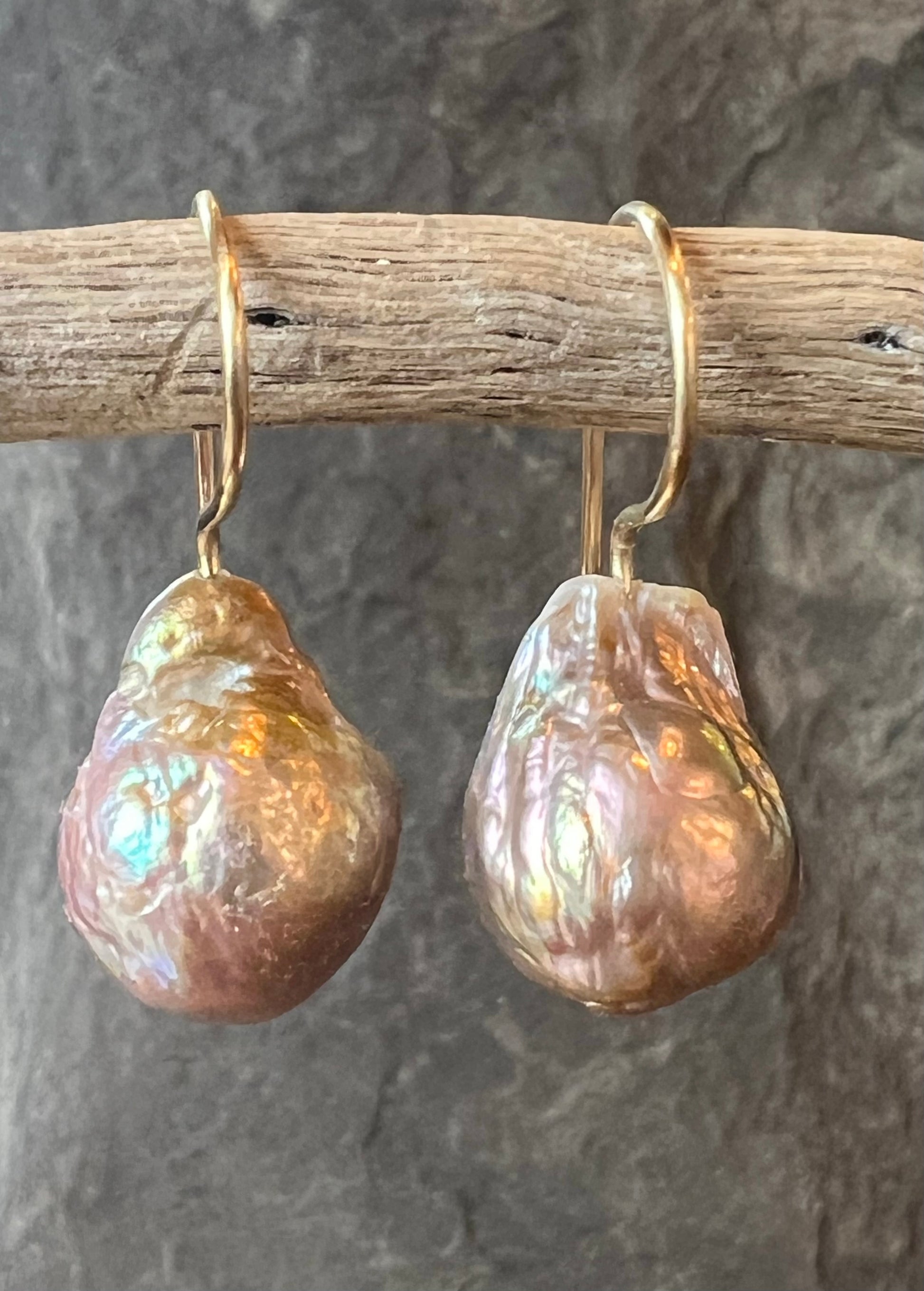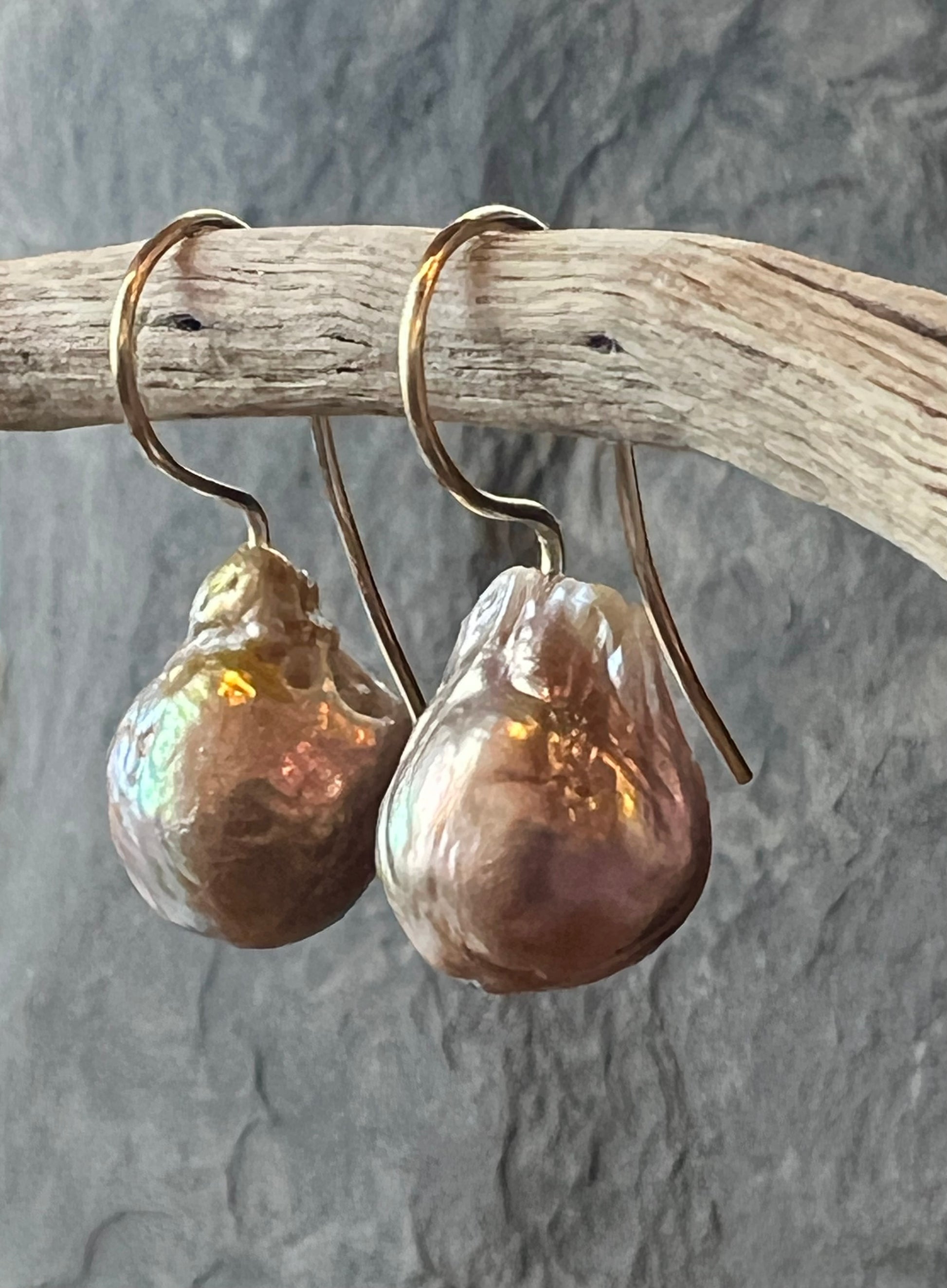 15 mm x 12 mm pinkish bronze baroque pearls with lots of luster and organic texture with 14K yellow gold ear wires