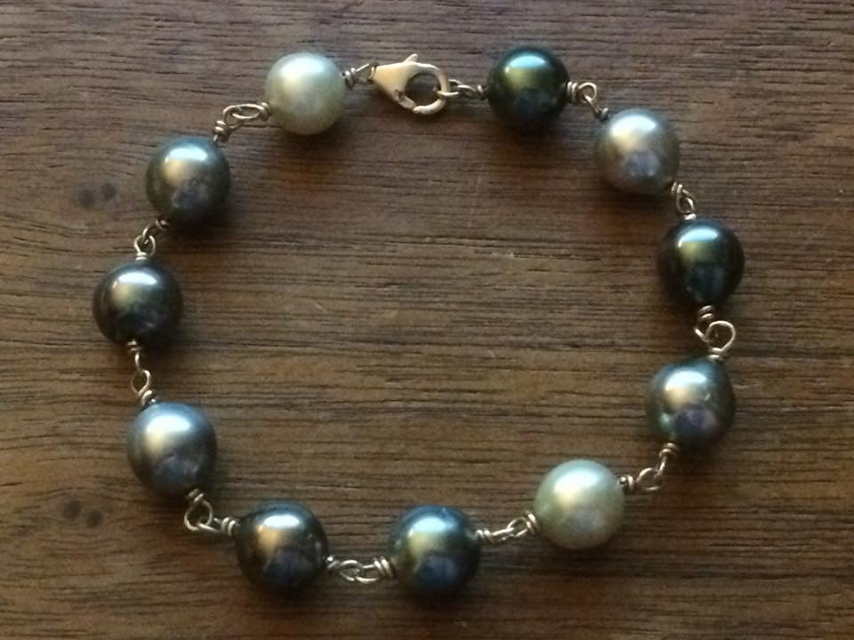 Tahitian Pearls in shades of gray with a South Sea creamy white pearls in the mix. The pearls vary in size from 8.5 mm - 11 mm. Pearls are on 14K yellow gold pig tail links with a lobster claw clasp. 8.25" length