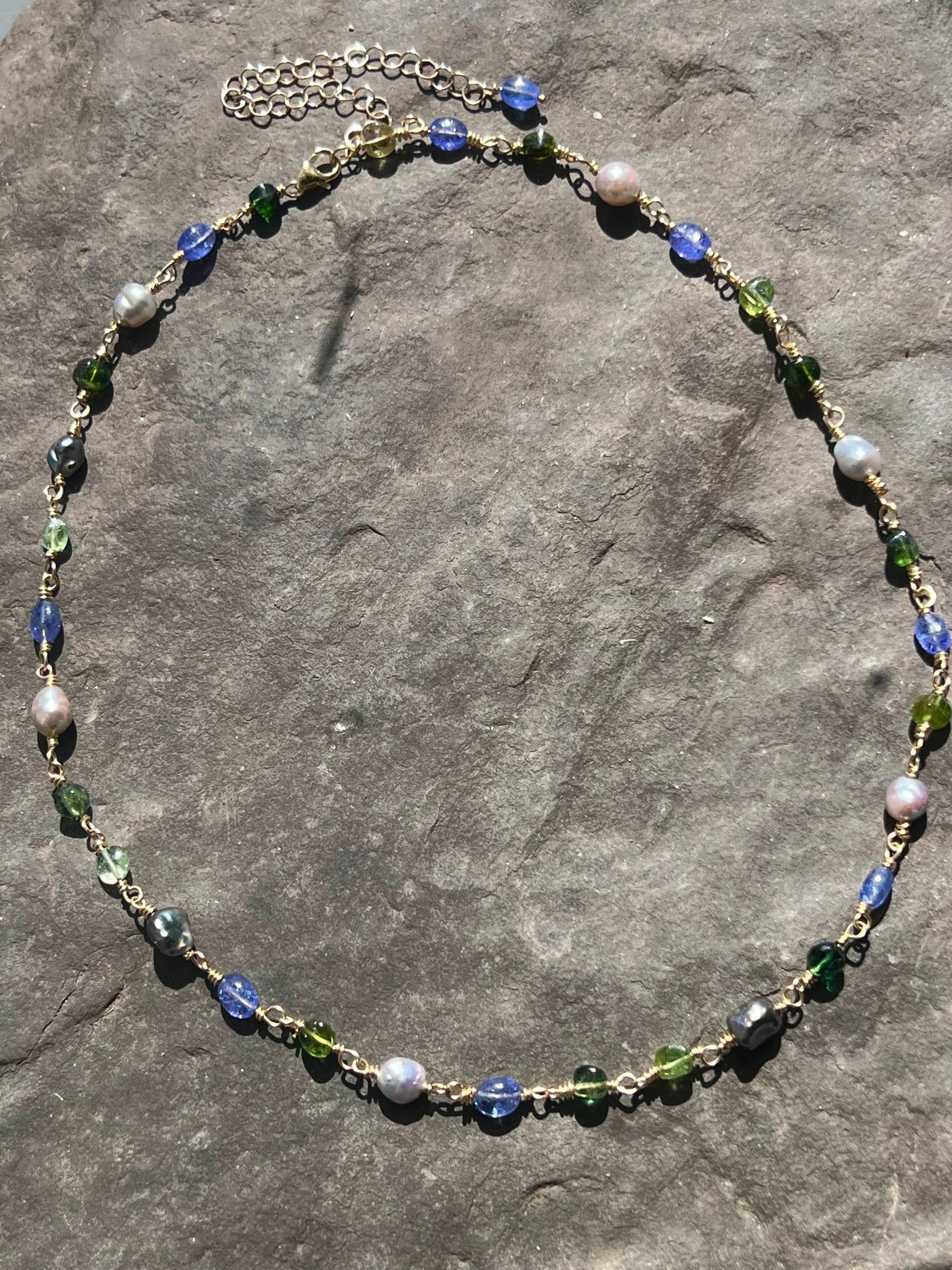 Colors of the edge of the forest floor- Single strand of squarish Green Tourmaline, ovate Tanzanite, and Tahitian Keshi Pearls on 14k yellow gold pigtail chain with 14K lobster clasp and 3" extender